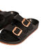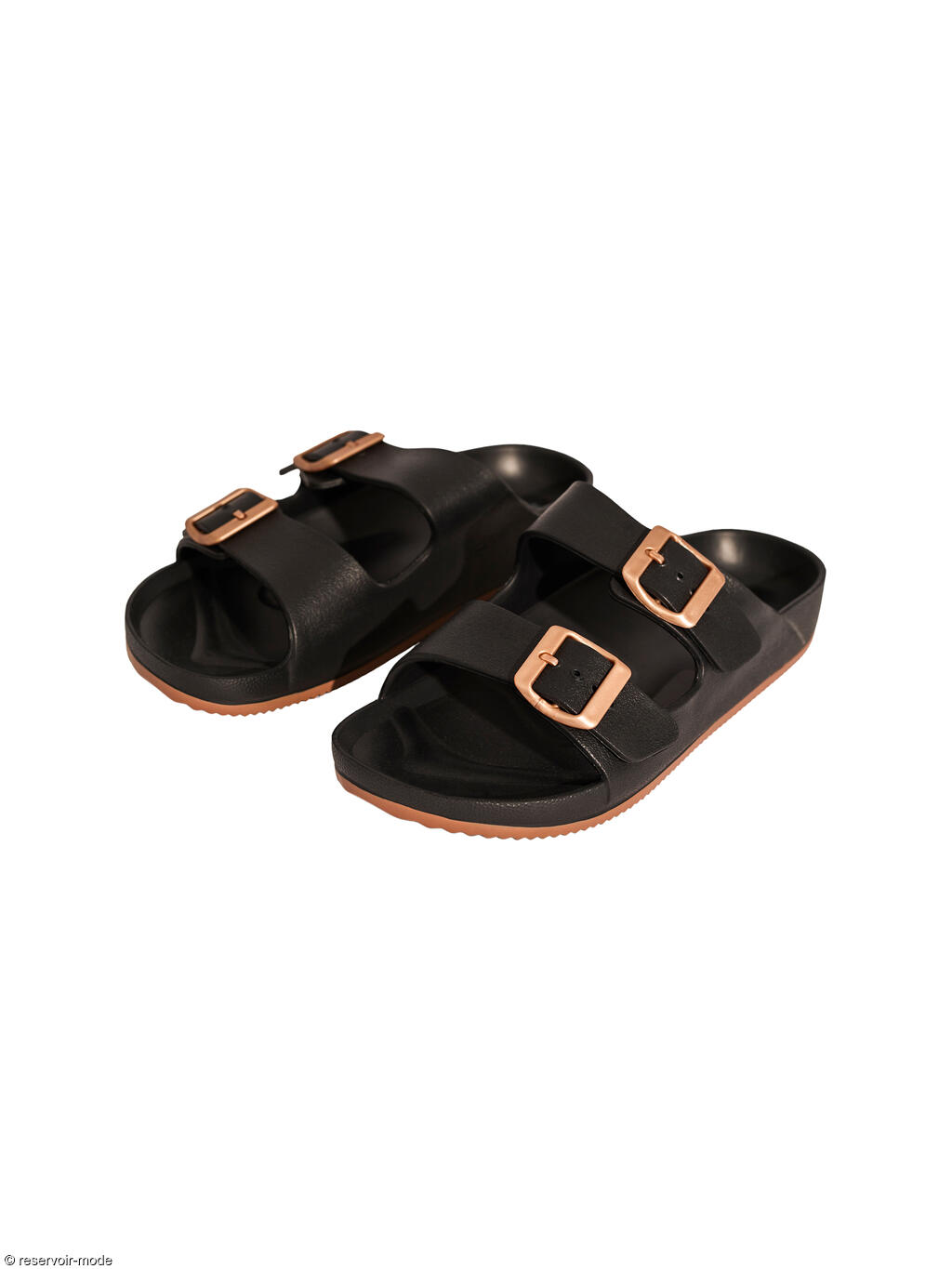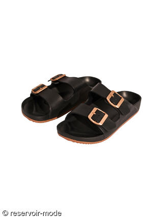 Ces sandales sont un classique revisité, alliant le confort d'une chaussure de détente à des détails plus élégants. Ces sandales de type mules à doubles brides sont inspirées du design iconique des sandales de marche confortables. La semelle intérieure est préformée pour épouser la forme du pied, offrant un soutien optimal au niveau de la voûte plantaire et du talon. Elles sont fabriquées en matériau léger, flexible et résistant à l'eau, idéal pour la piscine ou la plage. Le corps de la sandale est d'un noir mat profond, tandis que la semelle extérieure présente une fine couche de couleur marron, créant un contraste subtil. Le point fort du design réside dans les grosses boucles métalliques de couleur or rose. Elles permettent d'ajuster le serrage des brides tout en apportant une touche de sophistication. Le fini est lisse avec un léger grain sur les brides. C'est une paire polyvalente : assez robuste pour les vacances et assez chic pour être portée en ville avec un jean ou une robe d'été.