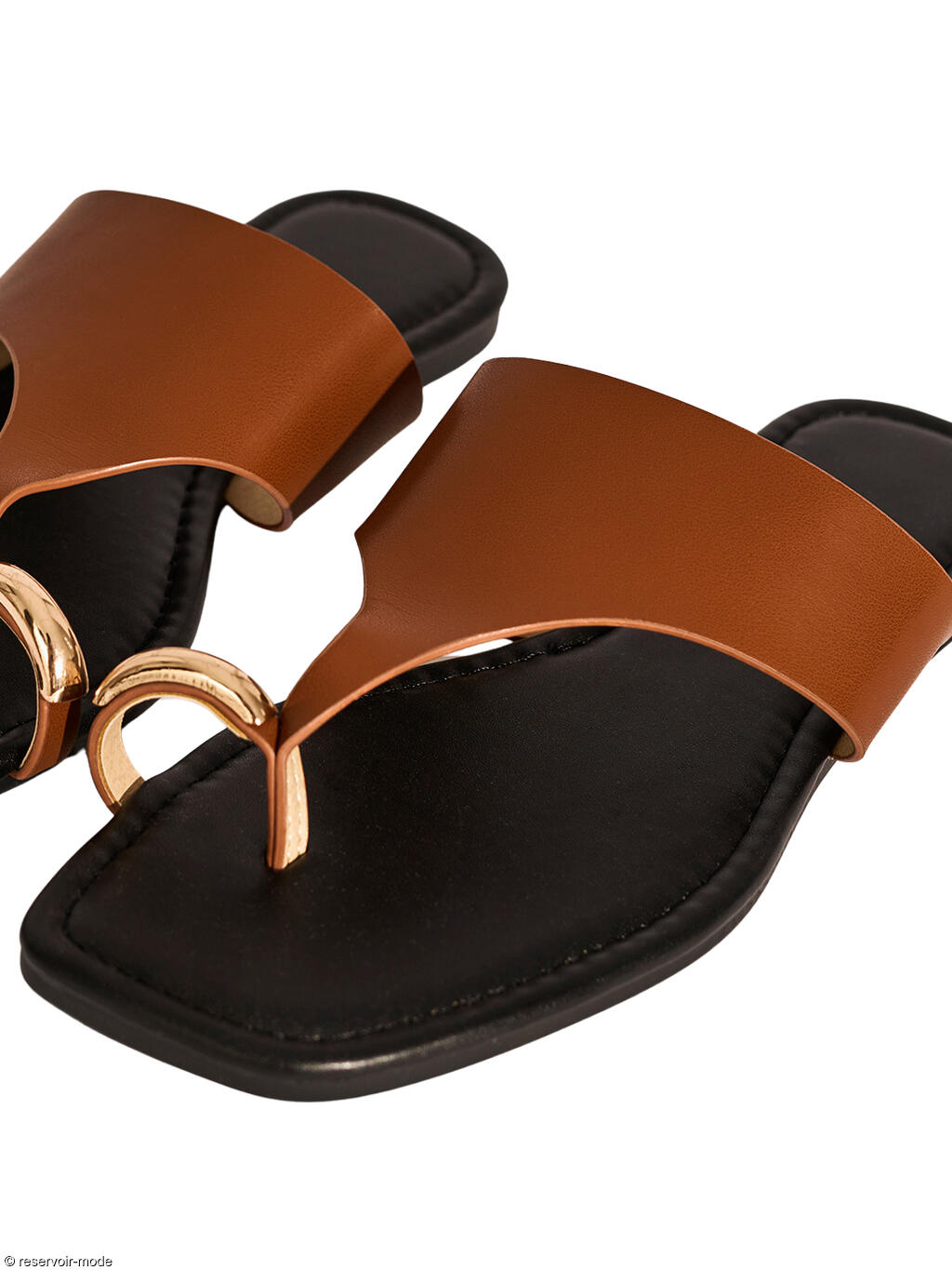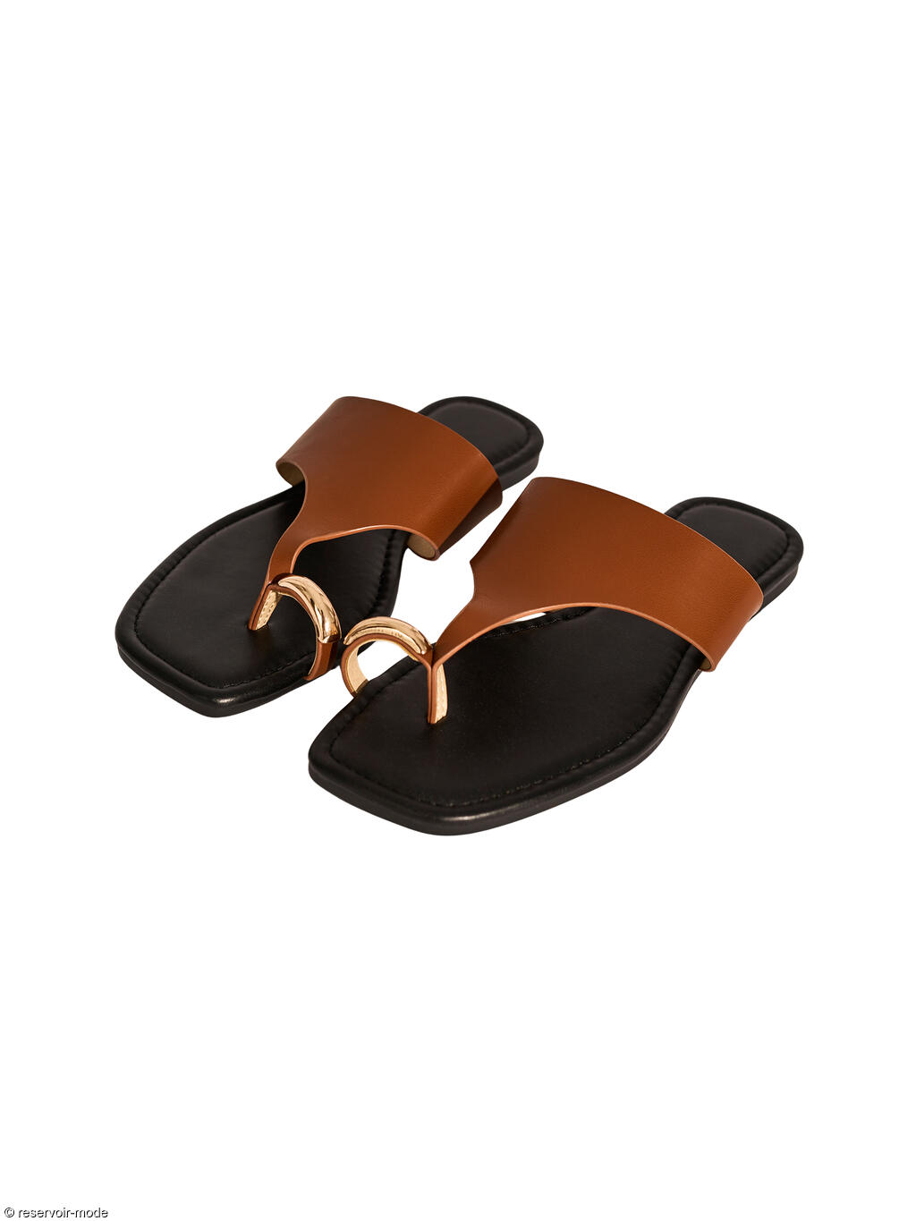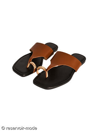 Ces sandales affichent un style à la fois minimaliste et sophistiqué, parfaites pour une tenue estivale élégante. La particularité principale est l'anneau métallique doré qui entoure le gros orteil, servant à la fois de maintien et de bijou. Une large bride en simili cuir de couleur camel s'étend sur le cou-de-pied avec une découpe asymétrique moderne qui remonte vers l'entre-doigt. La semelle est plate avec un bout carré, une tendance forte qui apporte une touche architecturale et contemporaine. Le mélange du noir de la semelle intérieure et du camel de la bride crée un look intemporel et facile à assortir. L'anneau est d'une finition or brillant, ce qui rehausse l'aspect luxueux de la chaussure. La semelle intérieure est légèrement rembourrée pour plus de confort, avec une surpiqûre apparente sur tout le pourtour. Ces sandales se marieront parfaitement avec un pantalon en lin blanc large pour un look Riviera, une robe longue vaporeuse ou une jupe midi, ou encore avec des accessoires dorés pour rappeler l'anneau de l'orteil.