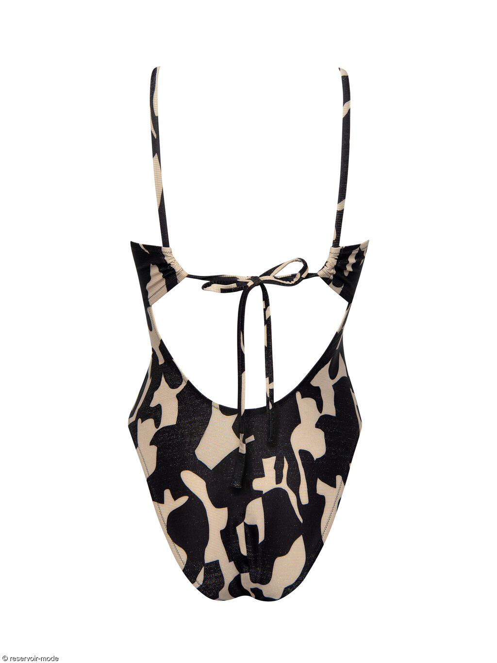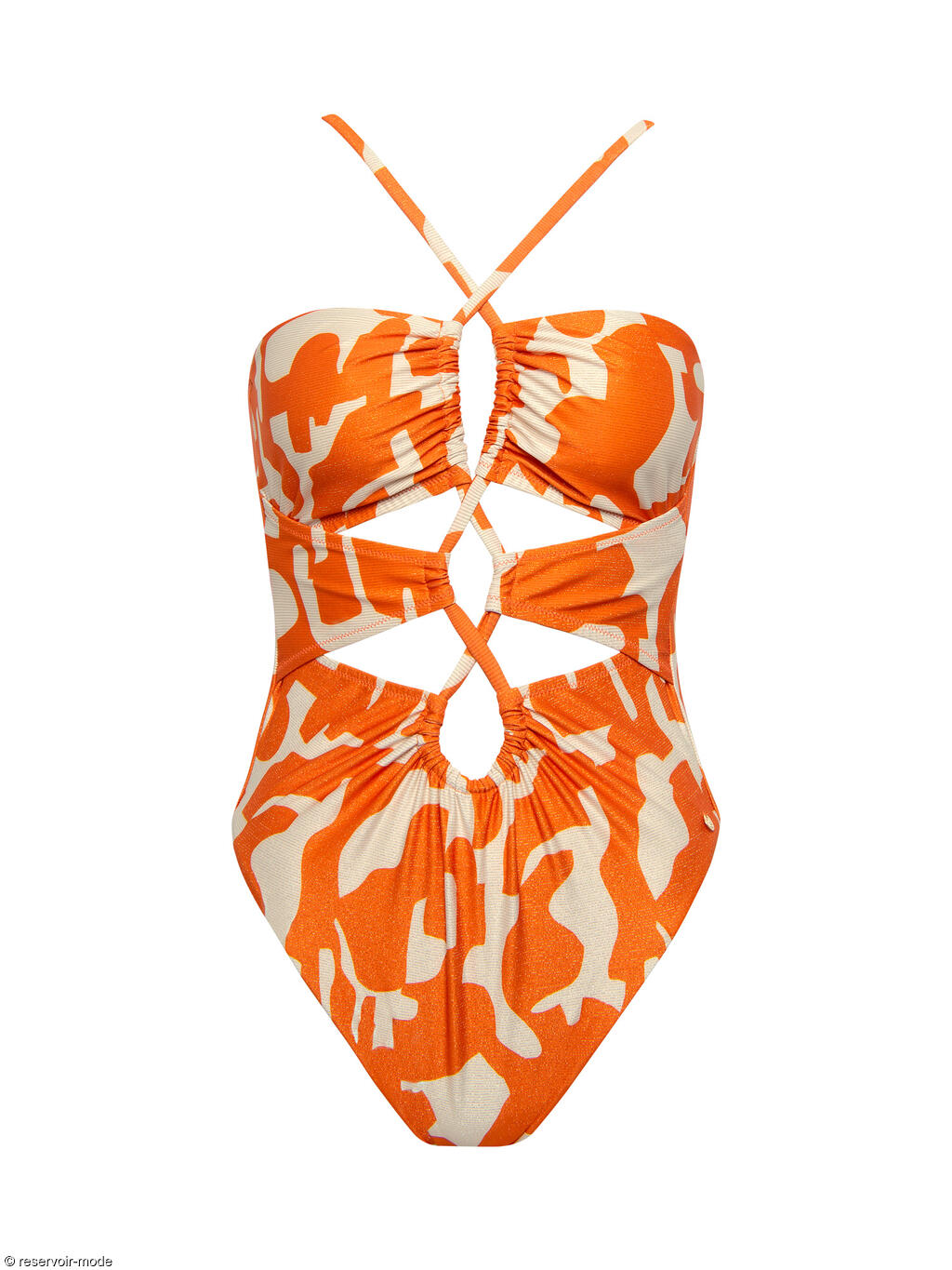 Maillot de bain une pièce léger et tendance, sans coques ni armatures, dans une matière en maille lisse avec fils de lurex doré tissés. Les détails croisés et froncés à l’avant offrent un look moderne, avec une coupe très échancrée qui allonge visuellement les jambes. Le dos très échancré se ferme par une fine bride à nouer, qui permet également de régler la longueur des bretelles.