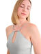 Pièce tendance et séduisante avec un décolleté profond, et un détail discret sur le devant avec un fermoir à travers lequel passent des lannières fines. Le buste est doublé de fronces et soutenu par une bande élastique plus large. Ourlet sans coutures sur le devant. Les bretelles se nouent dans le bas du dos, décolleté en U.