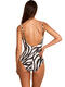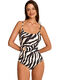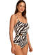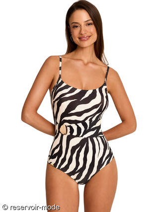 Maillot de bain 1 pièce élégant, préformé sans armatures, avec un décolleté carré. Il est confectionné dans un tissu texturé orné d’un imprimé zébré noir et blanc, qui apporte une touche à la fois sauvage et élégante. A l'avant, la taille est soulignée par une large ceinture plissée décorative, ornée d'un bijou doré décoratif qui ajoute une note chic et lumineuse. Les fines bretelles sont réglables pour un ajustement parfait. Décolleté en U dans le dos.