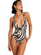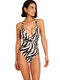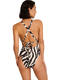 Maillot de bain une pièce dont les bonnets triangulaires préformés mettront votre poitrine en valeur grâce dans un très joli décolleté en V profond, décoré au centre d'un bijou doré très chic qui complète le look. Il est confectionné dans un tissu texturé orné d’un imprimé zébré noir et blanc, qui apporte une touche à la fois sauvage et élégante. A l'arrière, les fines bretelles sont multipositions : elles peuvent se croiser et venir se nouer dans le bas du dos, ou se nouer dans la nuque pour un superbe dos nu. Décolleté en U dans le dos.