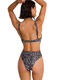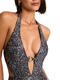 Maillot de bain une pièce de coupe trikini, très échancré et sophistiqué, au style à la fois sensuel et élégant. Il présente un décolleté plongeant en V profond, qui descend jusqu’au milieu du buste. Un anneau métallique central, reliant les deux côtés du décolleté, apporte une touche moderne et structurée. Des découpes latérales marquées laissent le dos largement dégagé. La coupe échancrée au niveau des jambes allonge visuellement la silhouette. Les bretelles sont nouées à de fins anneaux dans le dos, ce qui permet différents type de port : attachez-les droites pour un effet classique, ou nouez-les dans la nuque pour dégager vos épaules. Fermeture dans le dos par un clip.