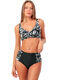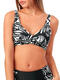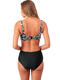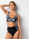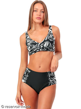 Ce maillot de bain deux pièces présente un style élégant et moderne, alliant élégance rétro et modernité dans un jeu subtil de contrastes. Le tissu, orné d’un imprimé feuillage tropical noir et blanc, apporte une touche graphique et sophistiquée. Le haut, de forme brassière, offre un maintien parfait grâce à ses bretelles larges et sa bande sous poitrine bien structurée. Il présente un décolleté en V croisé à l’avant, qui met en valeur la poitrine avec raffinement. Les coques amovibles permettent d’ajuster le volume selon les envies, tandis que la fermeture par crochet dans le dos assure un maintien sûr et confortable. Le bas taille haute, inspiré de l'esprit vintage, complète harmonieusement l’ensemble. Sa coupe galbante affine la silhouette et souligne la taille. Les panneaux latéraux à imprimé feuillage, coordonnés au haut, encadrent une partie centrale noire unie, créant un effet visuel amincissant et très flatteur. Ce maillot est idéal pour celles qui recherchent une tenue de bain à la fois chic, confortable et féminine, mariant esthétique rétro et lignes contemporaines.