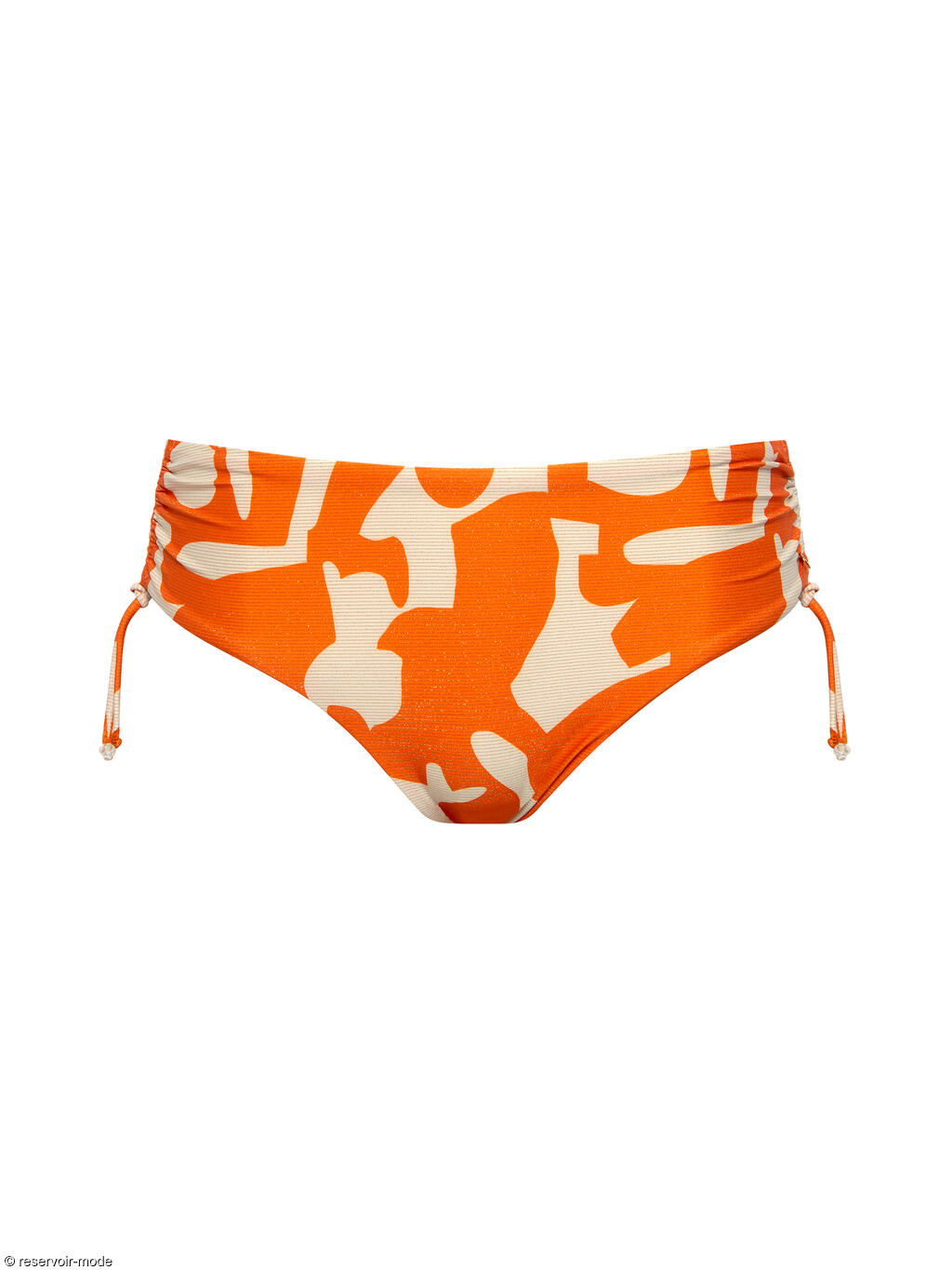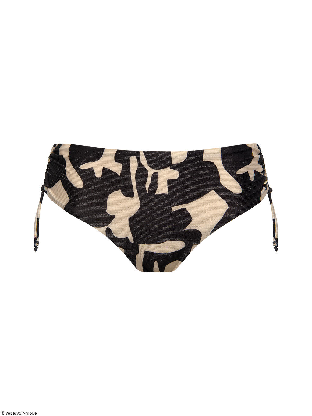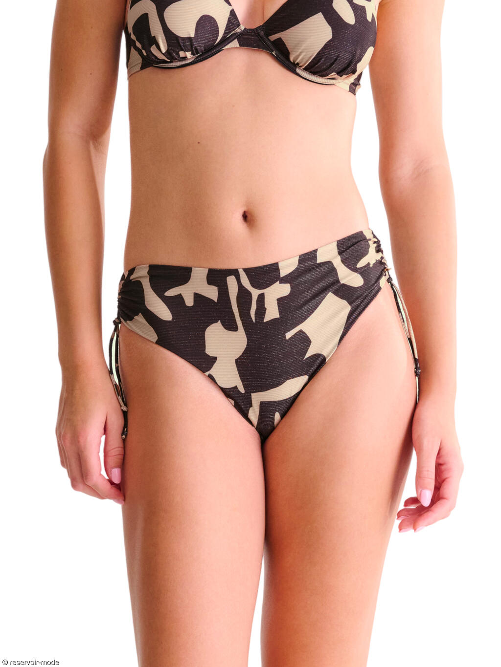 Bas de maillot de bain dans une coupe slip taille haute, avec des liens sur les côtés permettant d’ajuster la hauteur. La matière en maille lisse est dotée de fils de lurex doré tissés. L'avant est doublé avec une sous-couche élastique. Hauteur environ 26 cm.