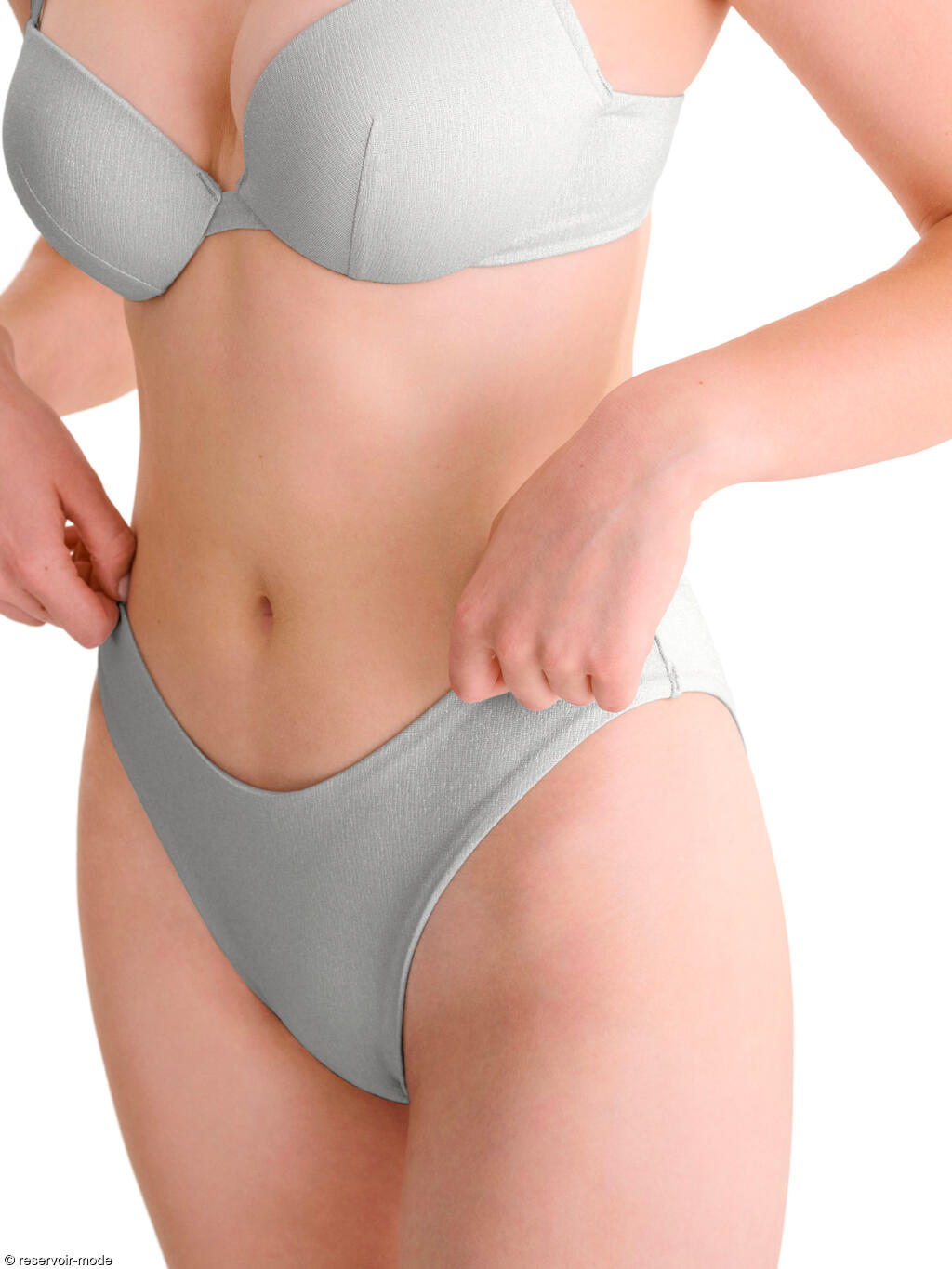 Collection réalisée dans une matière raffinée et brillante, avec un imprimé spécial en relief créé à l'aide de la technique « embossing ». La matière est composée de fils recyclés, la production utilise de l'énergie solaire « verte » et la technique d'impression ne nécessite pas d'eau. L'élégance de la série est soulignée par les ornements minimalistes argentés, rendant les modèles encore plus luxueux. Les clips, les régulateurs, les crochets, etc. sont également en argent. La gamme est conçue pour les femmes élégantes et sûres d'elles qui apprécient le design sophistiqué, les matières luxueuses et l'esthétique intemporelle, le confort, et qui veulent se démarquer à la plage ou à la piscine. Découvrez une variété de modèles de maillots de bain adaptés à toutes les morphologies et toutes les tailles. Une attention particulière est accordée au confort et à l'ajustement parfait, quelle que soit votre morphologie, afin que chaque femme puisse trouver le modèle qui lui convient. Cette collection se décline en deux couleurs : un argent brillant, qui reflète l'extravagance, la sophistication et le glamour, et un turquoise frais et élégant de l'eau du lagon. Toutes les doublures et les autres matériaux à l'intérieur des maillots de bain sont assortis à la couleur du matériau de base, pour une finition superbe.