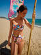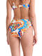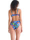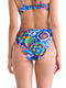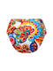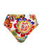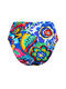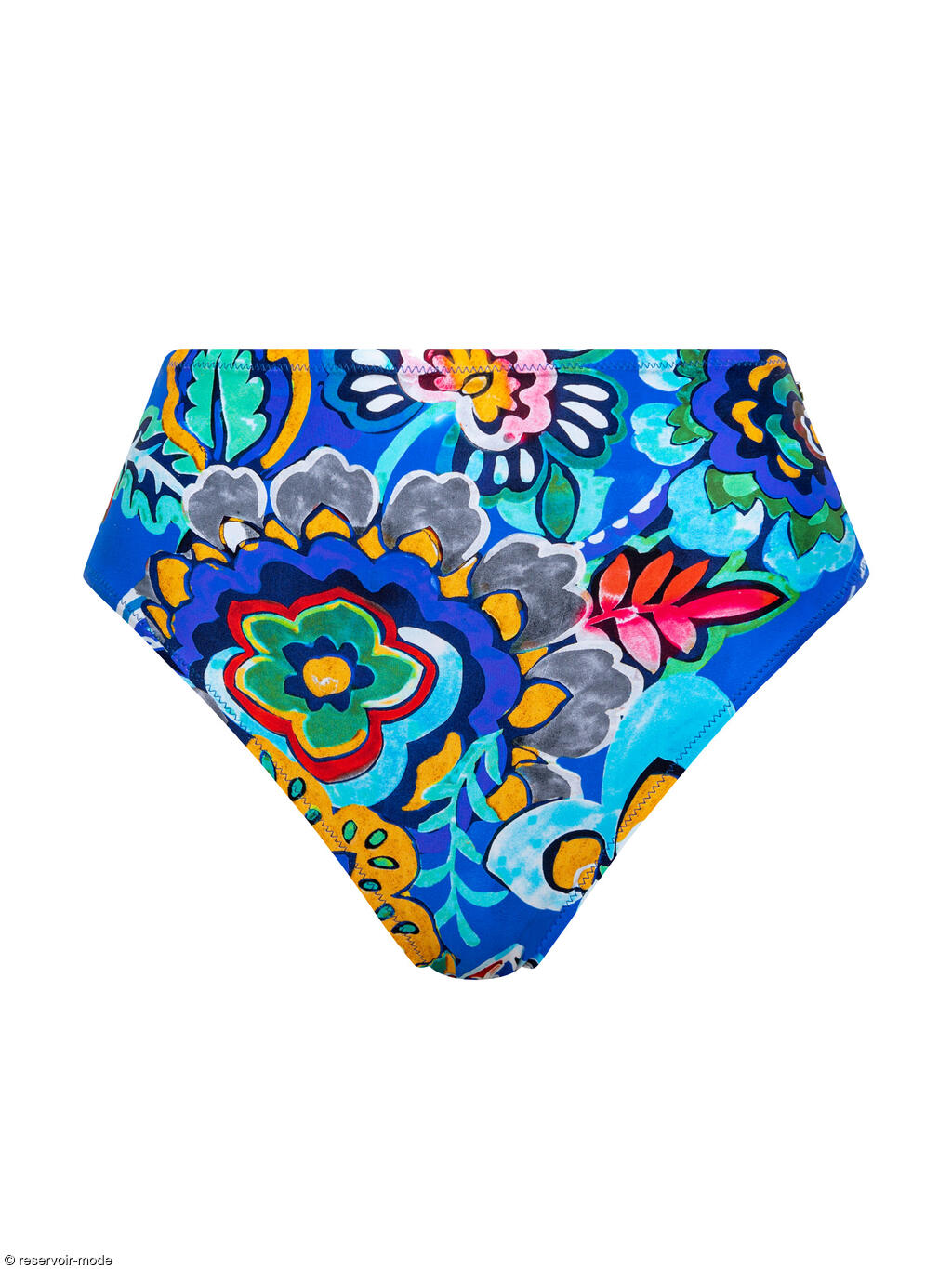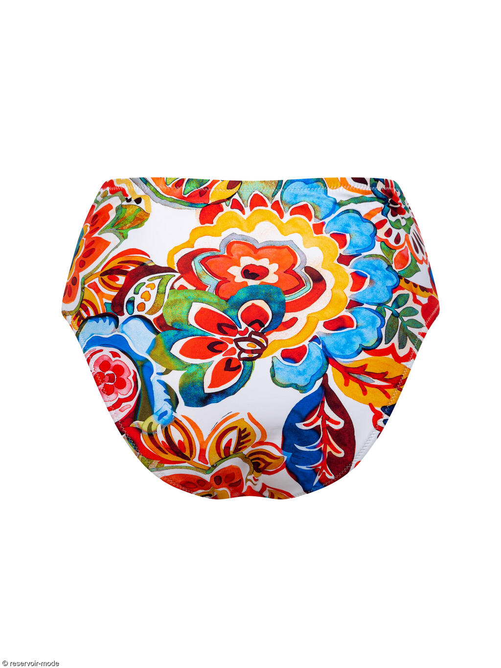 Slip de bain taille haute, dans une matière lisse, imprimée d'un motif multicolore éclatant. La coupe haute allonge visuellement les jambes. Le coloris rouge est doublé à l'avant et à l'arrière. Le coloris bleu est doublé uniquement à l'avant.