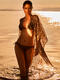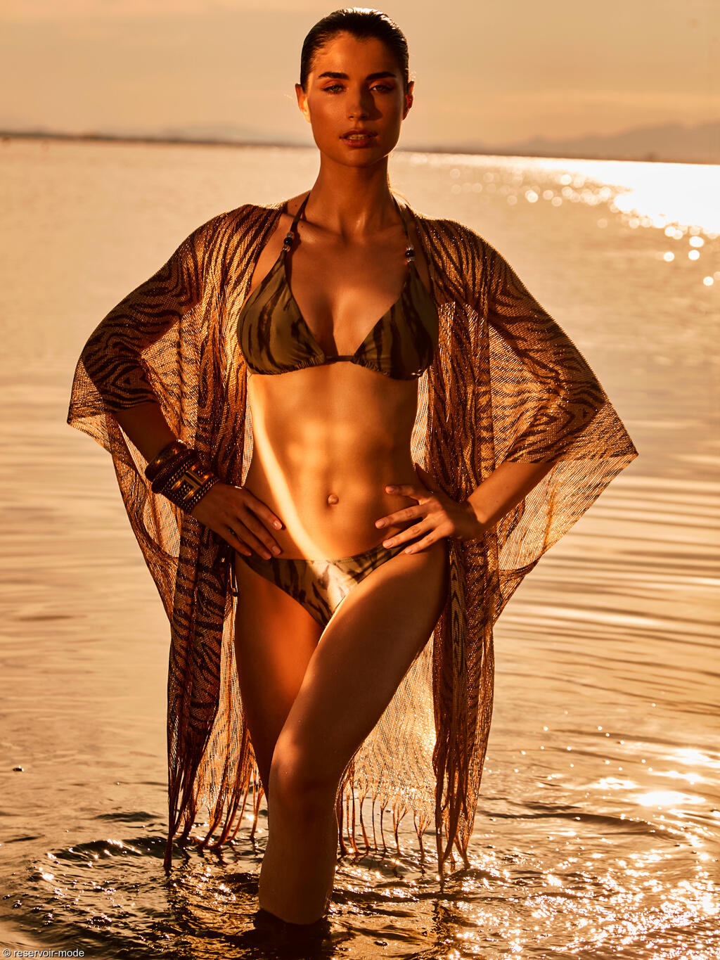 Collection éco-conçue, fabriquée à partir de matières premières recyclées. L’imprimé sauvage joue sur une base vert profond traversée de larges motifs irréguliers évoquant des feuillages stylisés et des ombres végétales. L’ensemble crée un effet organique et graphique à la fois, entre esprit jungle chic et abstraction contemporaine. Ce contraste sombre sur fond naturel apporte du caractère tout en restant facile à porter.