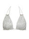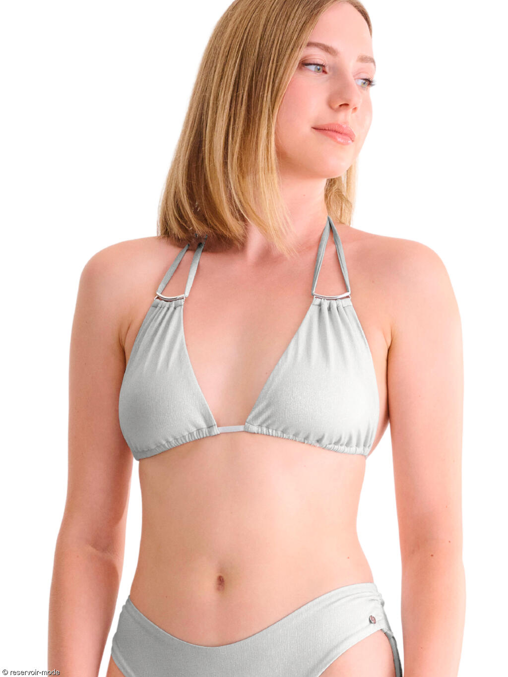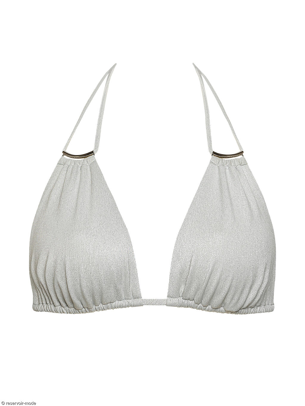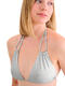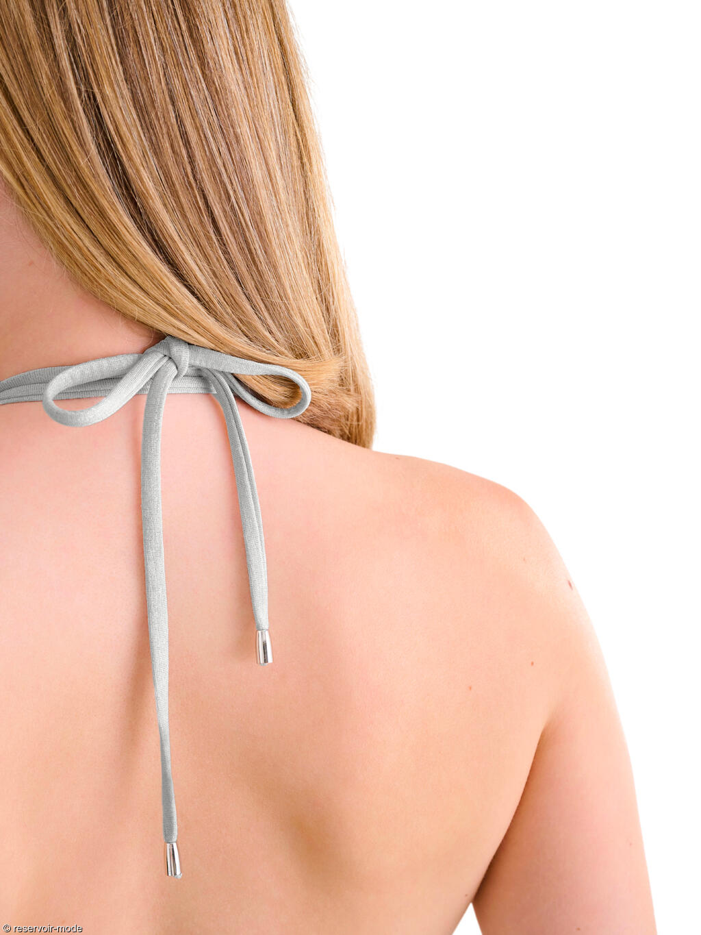 Soutien-gorge triangle léger avec fermeture à nouer dans le cou et dans le dos. Bonnets préformés avec un rembourrage léger et souple. Bordure argentée avec bretelles comme détail décoratif sur le haut des bonnets. Bonnets amovibles et ajustables à la largeur souhaitée à l'aide de la bretelle sous la poitrine.
