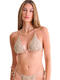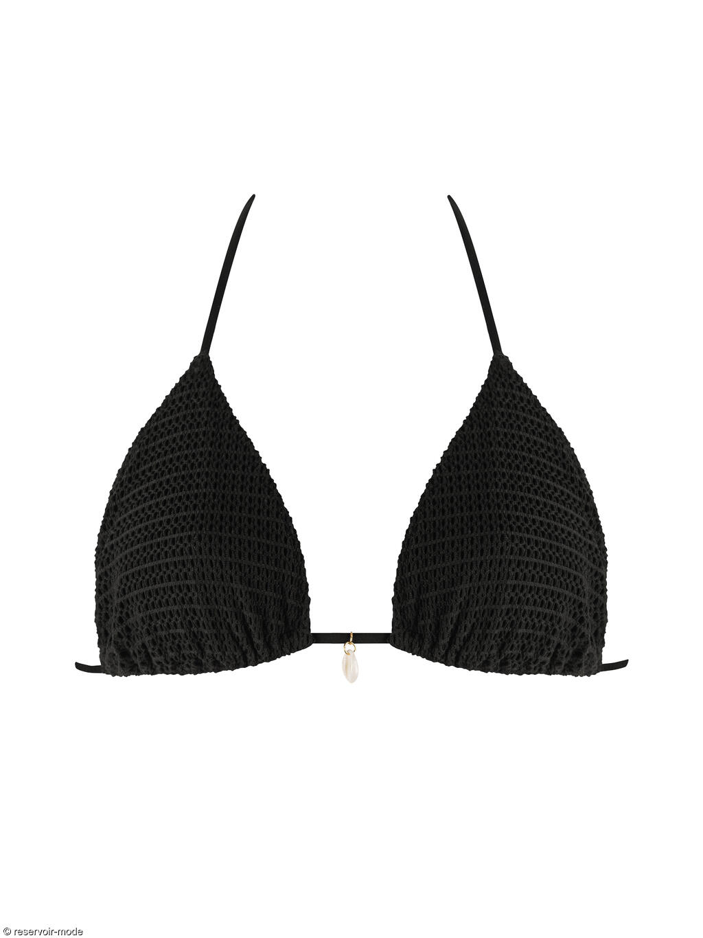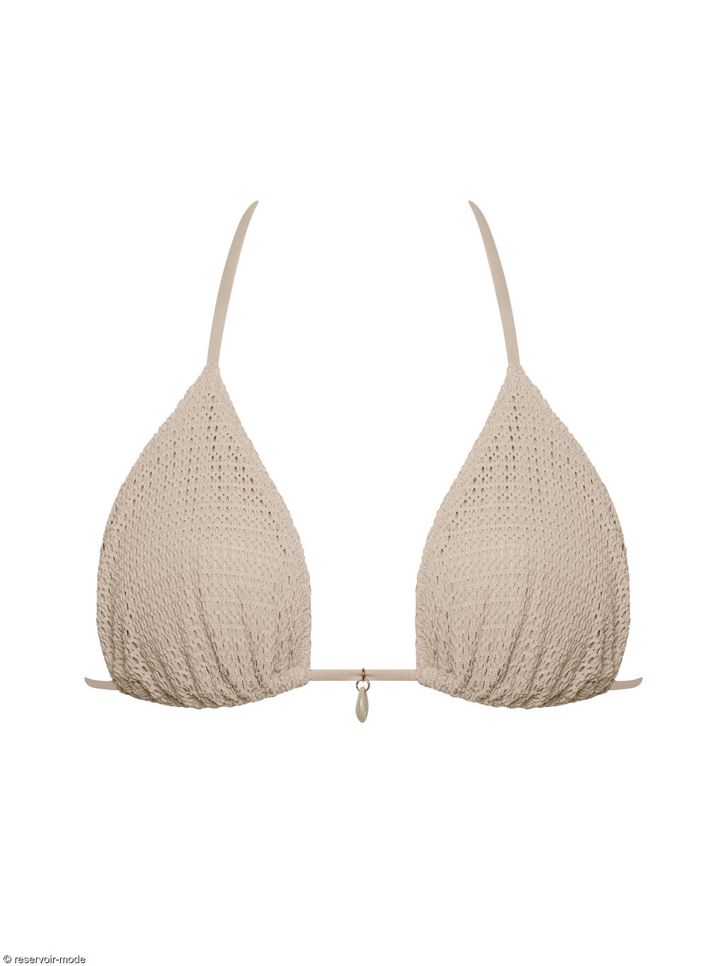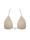 Ce soutien-gorge léger sans armatures présente des bonnets triangulaires. Les bonnets sont en maille texturée. La doublure et les accessoires sont assortis à la couleur du tissu principal. Une décoration en forme de coquillage au centre du décolleté souligne l'ambiance marine. Le soutien-gorge se ferme à l'arrière, sous la poitrine et derrière la nuque.