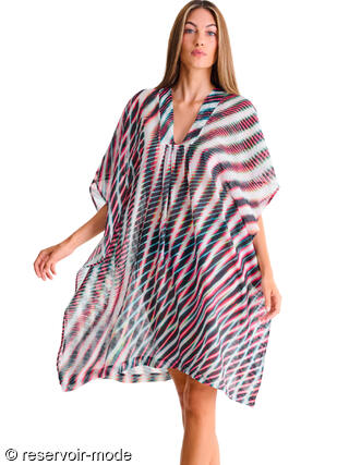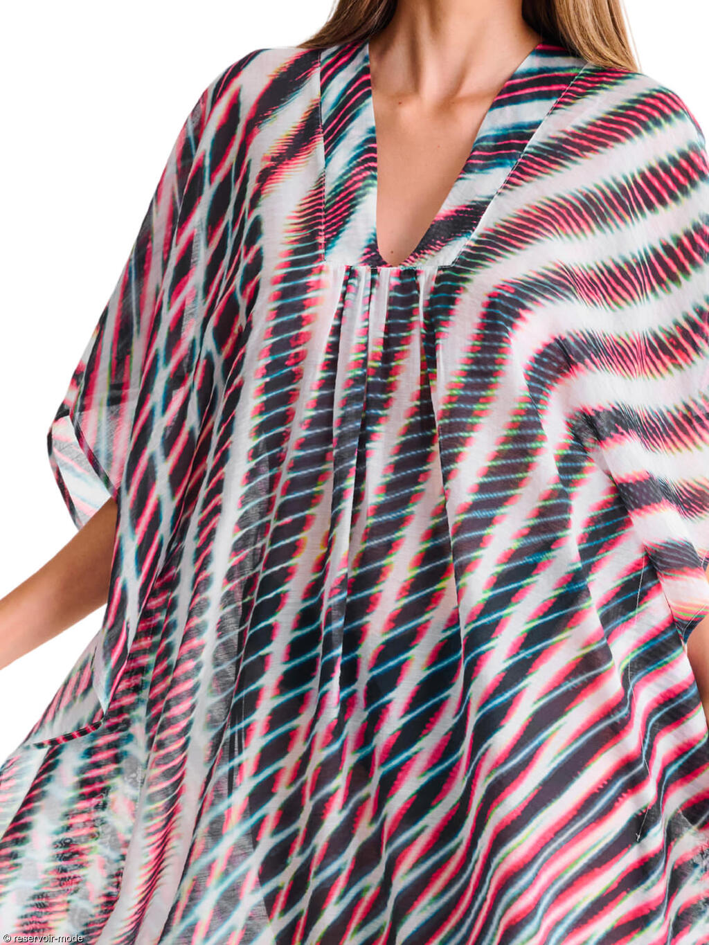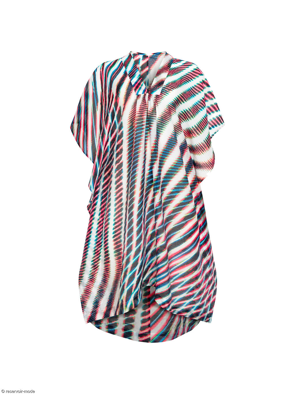 Ce caftan de plage se distingue par son allure résolument artistique et contemporaine. Réalisé dans un tissu délicat en viscose mélangée, il offre un tombé souple, presque vaporeux, qui accompagne le mouvement avec une légèreté remarquable. Il enveloppe la silhouette dans un voile aérien, parfait pour flâner au bord de l’eau ou se couvrir avec élégance après un bain de soleil. L’imprimé présente un jeu hypnotique de lignes ondulées et de dégradés vibrants. Les couleurs se croisent et se déploient pour créer un motif dynamique, à la fois moderne et graphique, presque psychédélique. Ce design attire le regard sans jamais perdre en finesse. Le tissu légèrement transparent renforce son charme balnéaire et accentue sa légèreté. La coupe est ample et raffinée avec une encolure en V subtilement plongeante, qui allonge la ligne du cou. Des manches kimono très fluides apportent une sensation de liberté. Un drapé généreux glisse délicatement autour du corps sans le structurer, pour un effet chic sans efforts. À la fois pièce pratique et déclaration de style, ce caftan incarne le luxe décontracté, idéal pour rehausser une tenue de plage ou accompagner un après-midi ensoleillé avec une élégance naturelle. Longueur environ 100 cm.