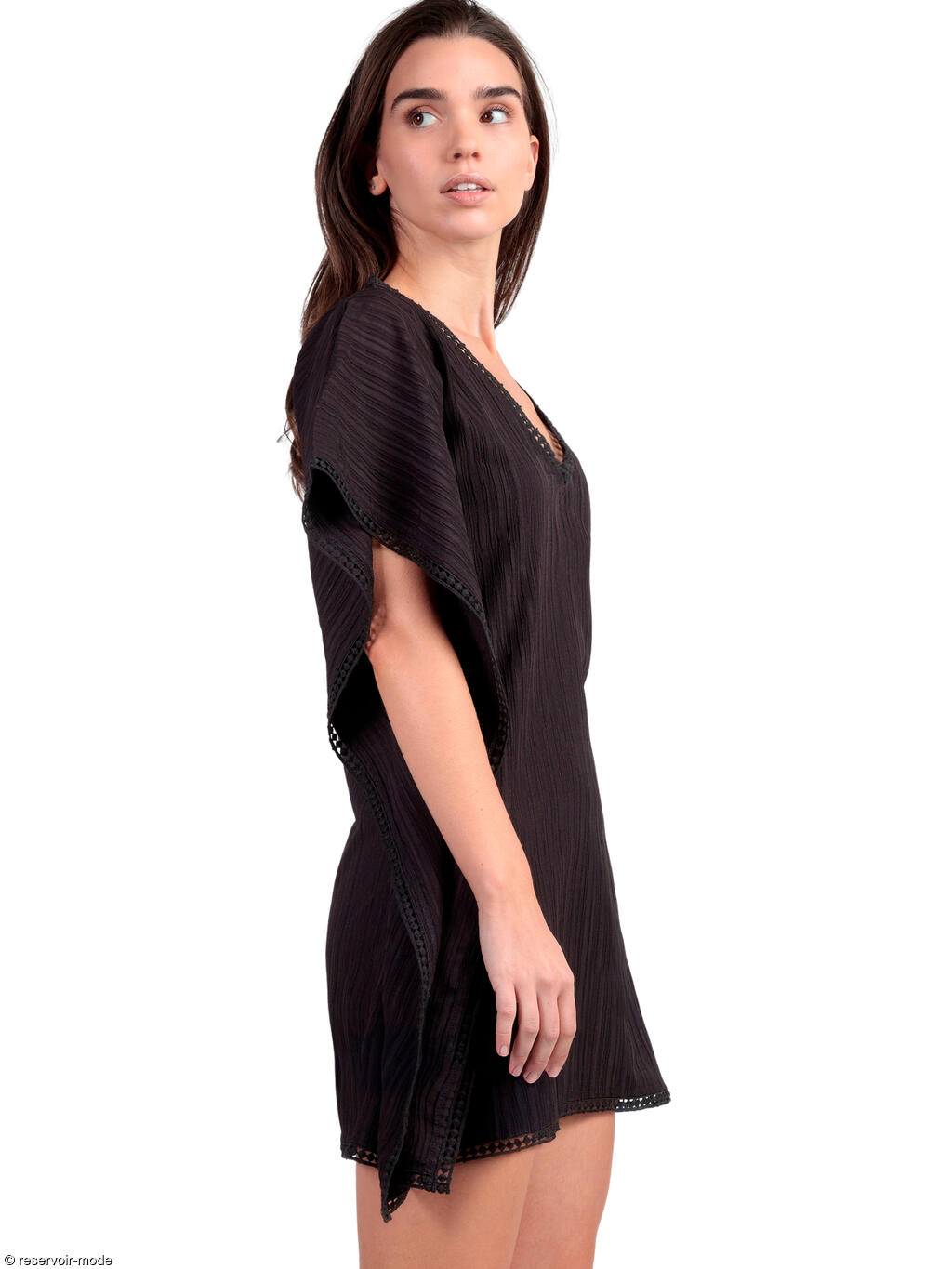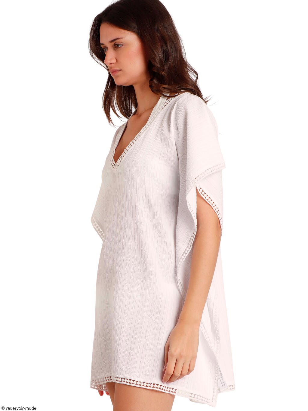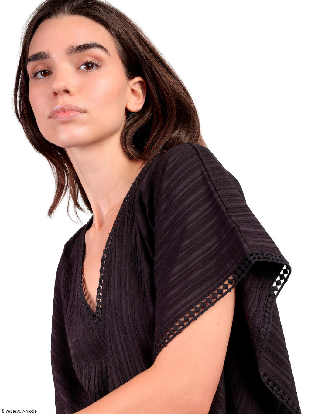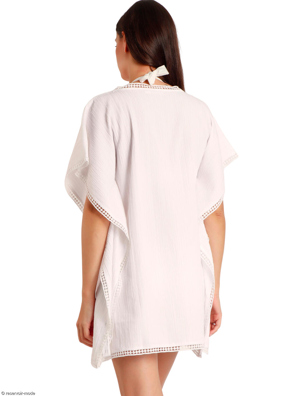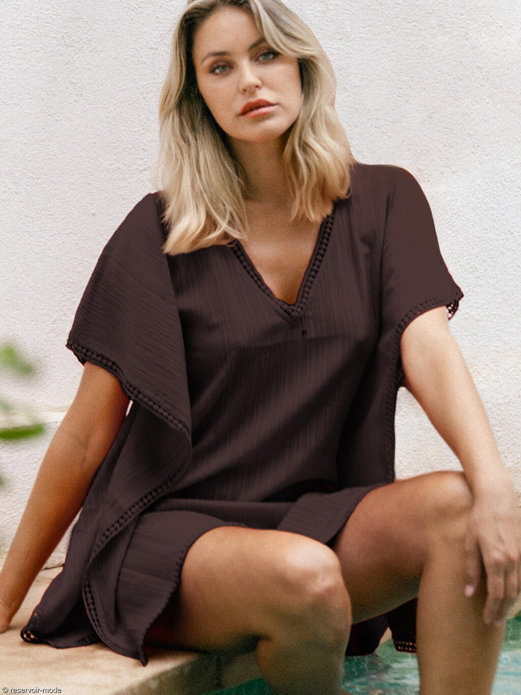 Très joli caftan de plage ample dans un design classique modernisé en tissu léger et texturé, parfait pour les journées ensoleillées à la plage ou au bord de la piscine. Sa coupe courte et son décolleté en V mettent en valeur votre silhouette tout en offrant un confort optimal. Ce modèle léger et fluide a des manches larges et tombantes, et un tissu crêpé ajoutant une touche d'élégance, tout en restant agréable à porter même lors des journées les plus chaudes. Le pourtour du col ainsi que le bas de la tunique et les extrémités des manches sont agrémentés d’un liseré ajouré. Ces détails au crochet offrent une note délicate et raffinée à ce caftan, le rendant unique et stylé. Que vous le portiez sur votre maillot de bain ou en tant que robe d'été, ce vêtement polyvalent s'adapte à toutes les occasions. Il allie style et fonctionnalité, vous permettant de passer facilement du bord de la piscine à un déjeuner en bord de mer. Sa polyvalence en fait un choix idéal pour les femmes modernes qui souhaitent marier confort et chic sans effort.
