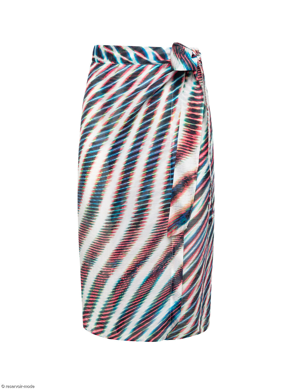 Cette jupe de plage, réalisée dans un tissu ultra-léger en viscose mélangée, offre une fluidité douce et agréable, parfaite pour les journées ensoleillées. Elle descend élégamment jusqu’aux genoux, tout en conservant une allure décontractée. L’imprimé présente un jeu hypnotique de lignes ondulées et de dégradés vibrants. Les couleurs se croisent et se déploient pour créer un motif dynamique, à la fois moderne et graphique, presque psychédélique. Ce design attire le regard sans jamais perdre en finesse. Le tissu légèrement transparent renforce son charme balnéaire et accentue sa légèreté. La pièce se noue délicatement à la taille grâce à un pan latéral à nouer, permettant d’ajuster le maintien et de créer un joli drapé naturel. Cette construction en fait une jupe particulièrement polyvalente : elle peut se porter aussi bien comme pièce à part entière que comme paréo, à glisser rapidement par-dessus un maillot de bain pour passer du transat au bord de mer avec élégance. Pratique, féminine et stylée, cette jupe-paréo incarne l’esprit estival dans toute sa simplicité chic. Longueur environ 75 cm.