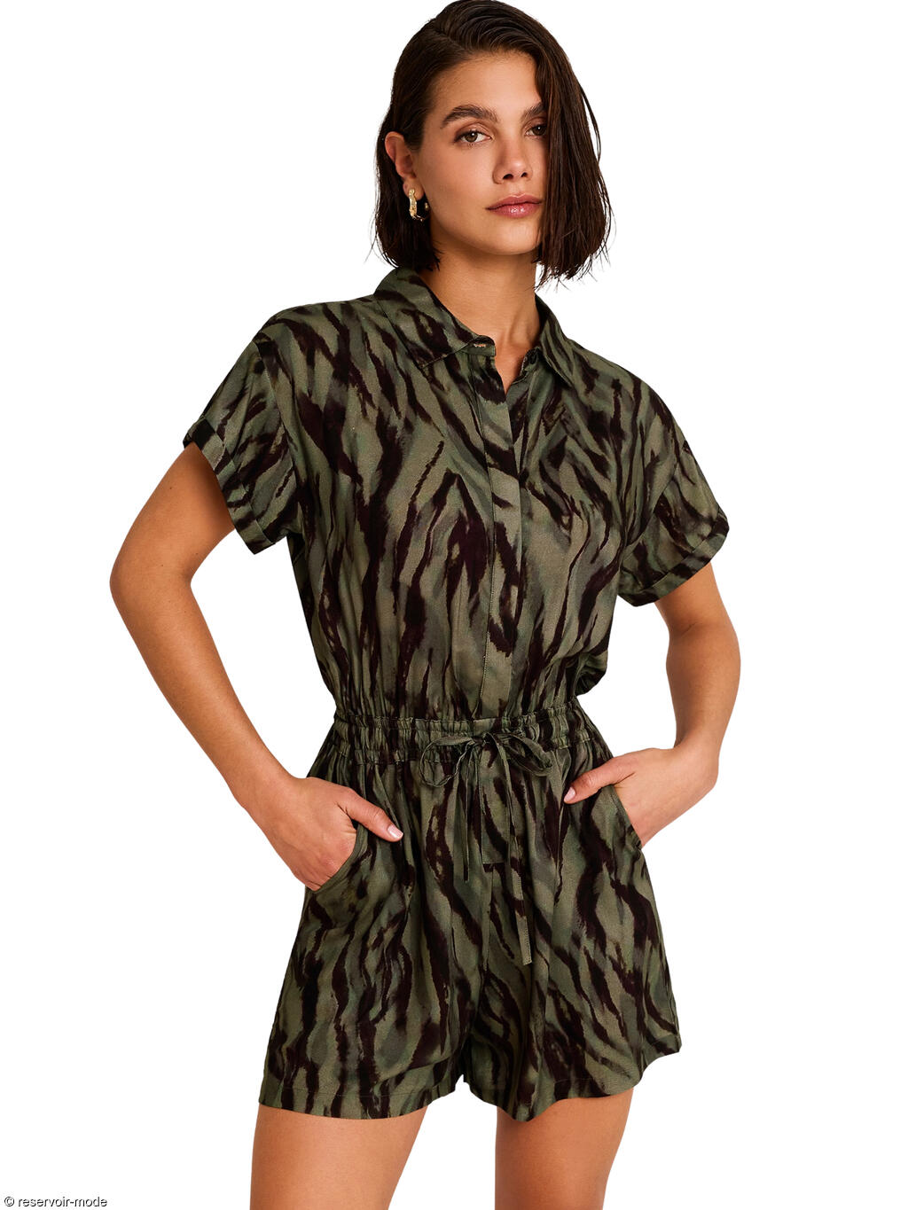 Ce combishort adopte une allure à la fois décontractée et structurée, avec une inspiration utilitaire subtilement féminisée. La coupe courte et fluide, s’arrêtant en haut des cuisses, allonge visuellement les jambes. Les manches courtes légèrement amples, offrent confort et décontraction. Col chemise classique avec patte de boutonnage sur le devant, apportant une touche nette et structurée. Taille élastiquée, resserrée par un cordon à nouer, qui marque la silhouette tout en gardant un esprit casual. Poches latérales discrètes, pratiques et dans l’esprit utilitaire chic. Le tissu viscose est léger, souple et respirant, parfait pour la saison estivale. Il tombe naturellement sans être moulant, créant un joli volume au niveau du short grâce aux fronces de la taille. Ce combishort dégage une énergie naturelle, moderne et légèrement safari chic. Il peut se porter facilement avec vos différents accessoires, créant tour à tour un look estival détendu, un style urbain, ou une tenue plus sophistiquée. C’est une pièce polyvalente, confortable et affirmée, idéale pour les journées chaudes où l’on veut rester stylée sans effort.