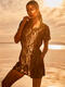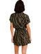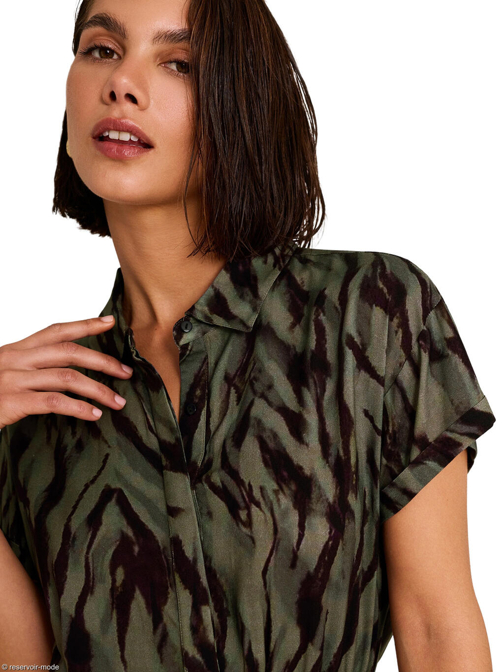 Collection éco-conçue, fabriquée à partir de matières premières recyclées. L’imprimé sauvage joue sur une base vert profond traversée de larges motifs irréguliers évoquant des feuillages stylisés et des ombres végétales. L’ensemble crée un effet organique et graphique à la fois, entre esprit jungle chic et abstraction contemporaine. Ce contraste sombre sur fond naturel apporte du caractère tout en restant facile à porter.