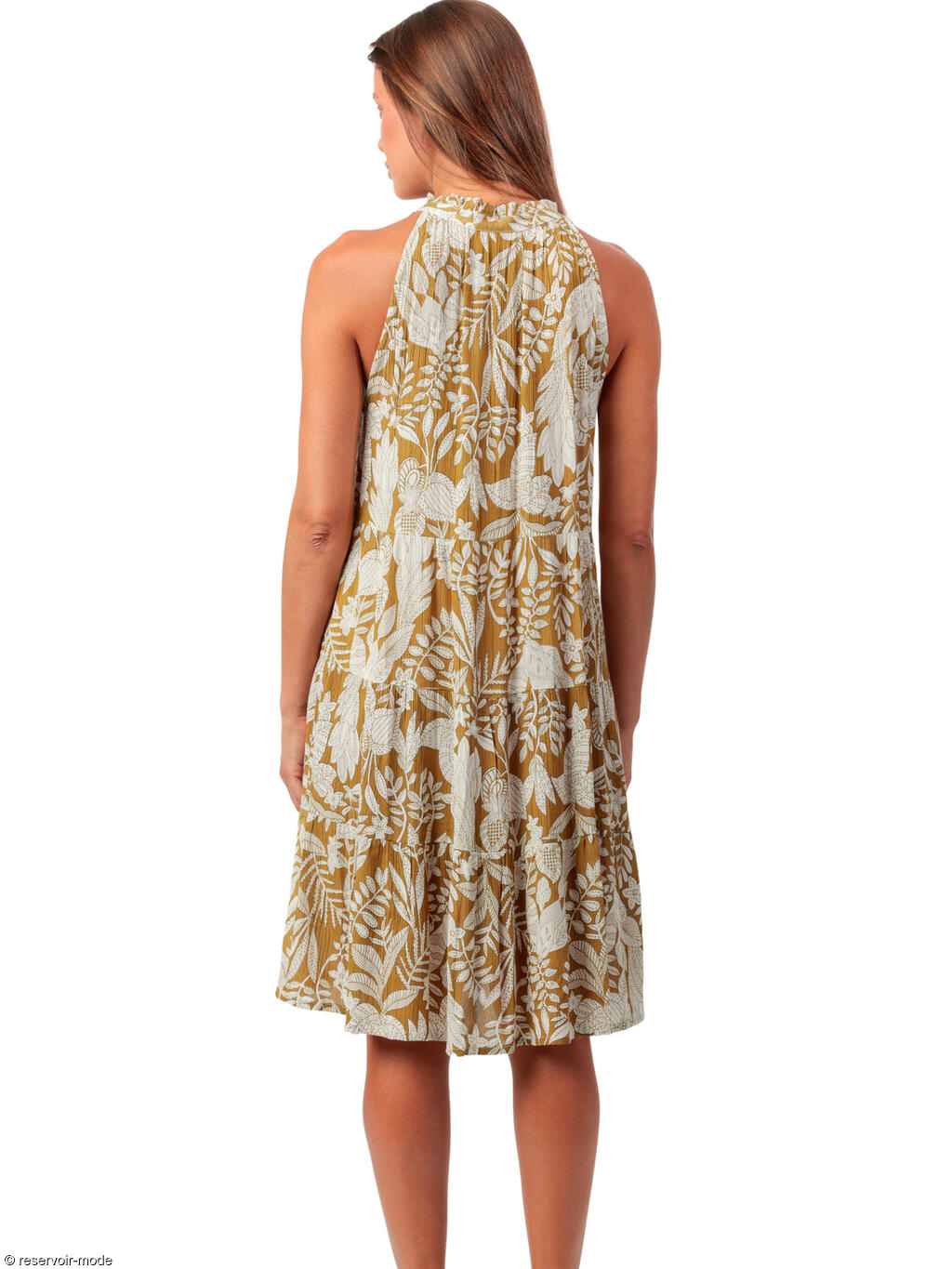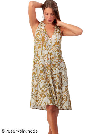 Cette robe légère et fluide incarne parfaitement l’esprit estival, entre élégance naturelle et confort absolu. Son imprimé feuillage exotique, aux tons blanc cassé sur fond moutarde doré, évoque les paysages ensoleillés et les fins d’après-midi d’été. Elle présente une coupe évasée et aérienne, qui descend légèrement au-dessus du genou, créant un mouvement souple à chaque pas. Le tissu en viscose apporte une sensation de douceur et de fraîcheur sur la peau, idéale pour les journées chaudes. Le décolleté en V est orné d’une petite patte de boutonnage délicate, ajoutant une touche féminine subtile. Les épaules légèrement froncées et la coupe sans manches accentuent le côté décontracté tout en restant élégant. Son motif végétal lui donne un style bohème et intemporel. Cette robe polyvalente sera parfaite aussi bien pour une balade en bord de mer qu’un déjeuner en terrasse.
