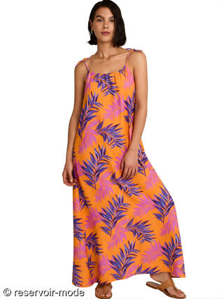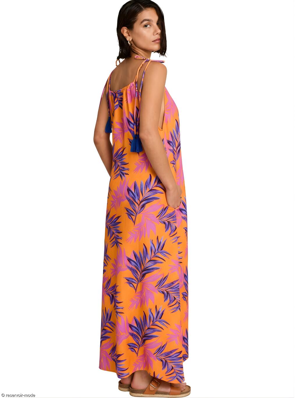 Cette robe longue de plage affiche un style à la fois décontracté et bohème, parfaitement adapté aux journées ensoleillées grâce à son mélange de matières naturelles qui assure légèreté et respirabilité. Sa coupe longue, fluide et évasée, offre une grande liberté de mouvement. L'encolure est droite et légèrement froncée sur le devant, ce qui donne un bel effet de drapé au tissu. Le dos est dégagé avec une encolure horizontale similaire à l'avant. Les fines bretelles se nouent sur les épaules, et sont terminées par des pompons contrastants qui ajoutent une touche artisanale. La robe intègre des poches latérales invisibles pour plus de praticité. Le mélange de coton et de lin apporte une texture légèrement authentique, tandis que la viscose permet au vêtement de tomber avec souplesse. C'est une pièce idéale à porter par-dessus un maillot de bain ou avec des sandales plates pour une tenue de vacances complète.