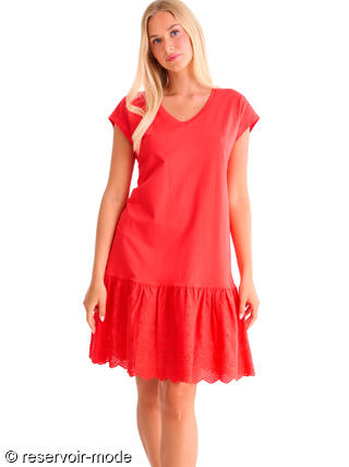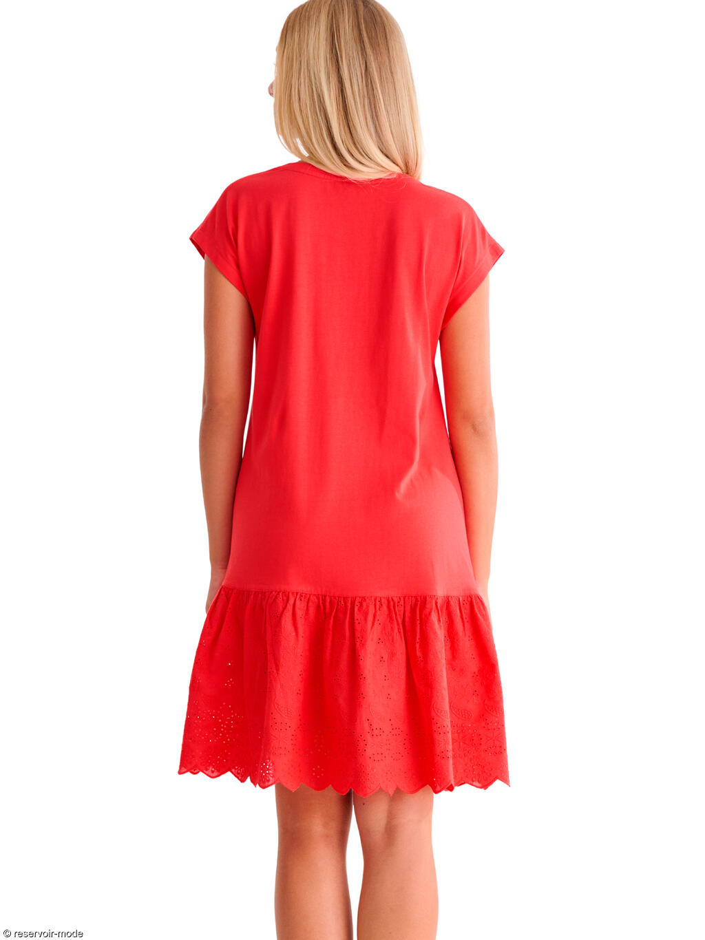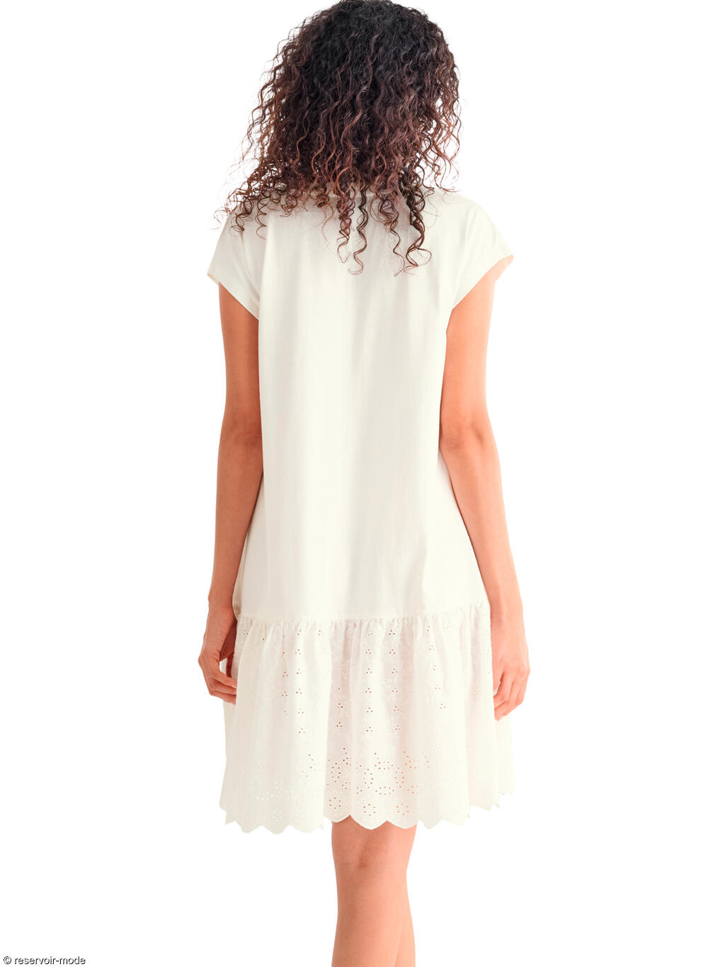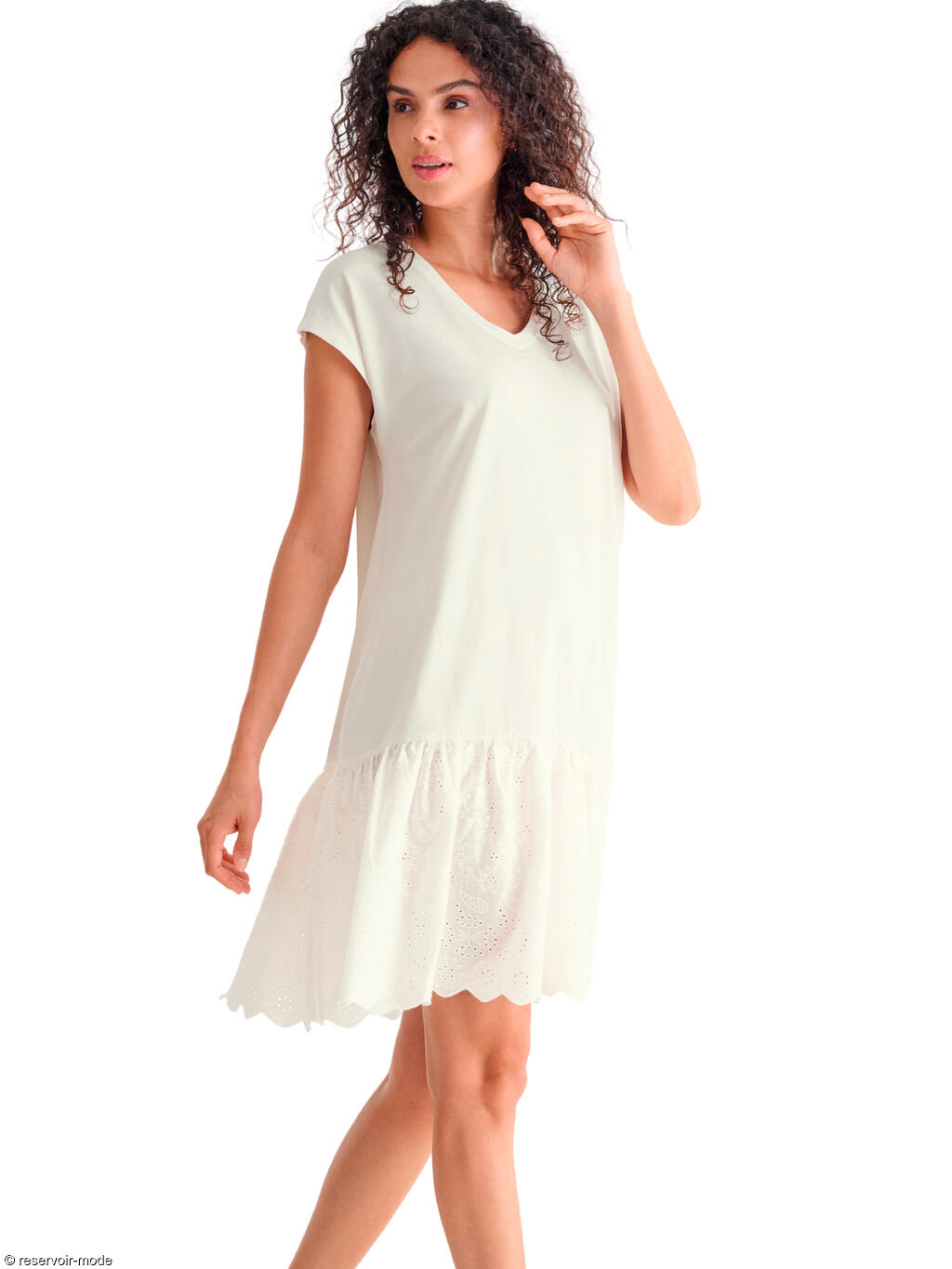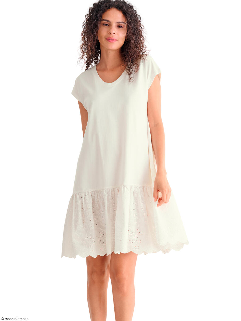 Cette robe estivale séduit par son style à la fois simple et raffiné. Entièrement en coton, sa matière légère et respirante assure un confort optimal tout au long de la journée, même par forte chaleur. La coupe droite et fluide accompagne les mouvements sans marquer la silhouette, offrant une allure décontractée mais féminine. L’encolure en V allonge la ligne du buste et apporte une touche d’élégance naturelle. Les manches courtes, souples et légèrement évasées, renforcent l’esprit estival et la liberté de mouvement. D’une longueur d’environ 97 cm, cette robe arrive au-dessus du genou, ce qui la rend facile à porter au quotidien. Le bas est animé par un volant froncé délicatement travaillé, agrémenté d’une broderie ajourée qui apporte texture, légèreté et une finition soignée. Une robe idéale pour la belle saison, alliant confort, féminité et simplicité, parfaite aussi bien pour une promenade estivale que pour une tenue casual chic.