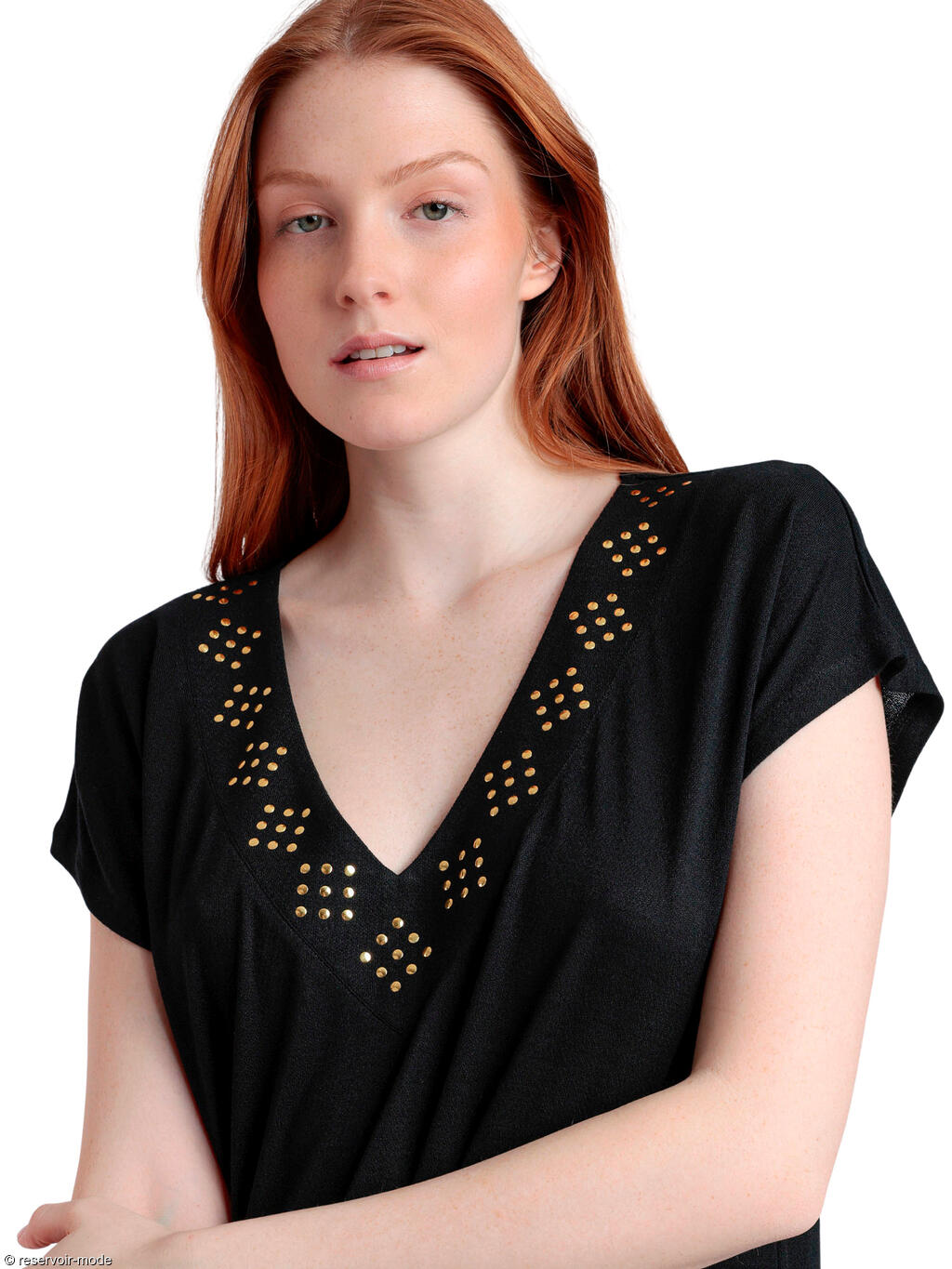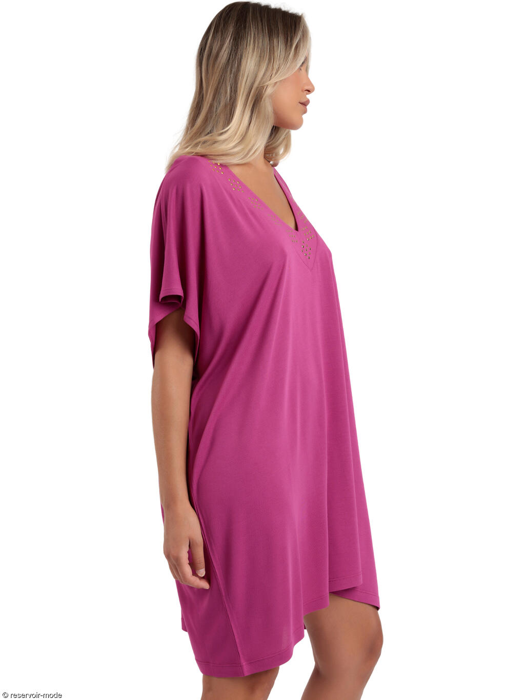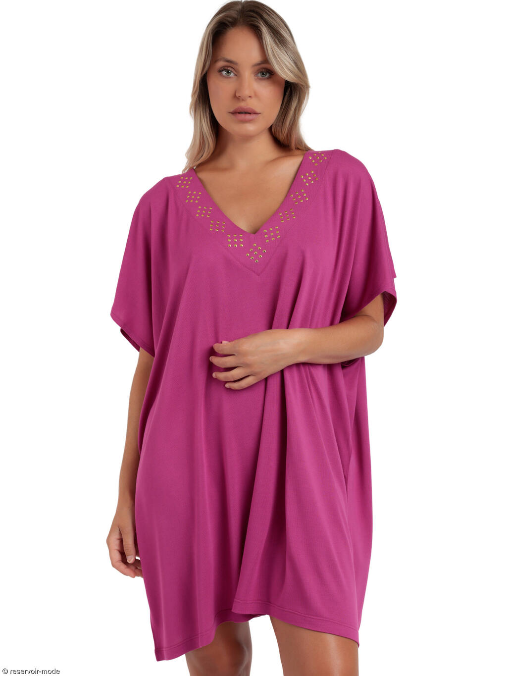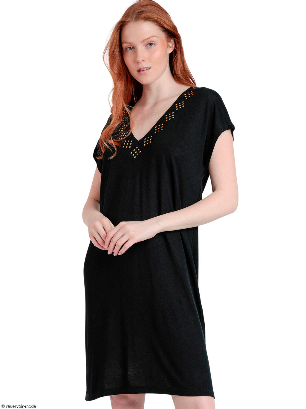 L'élégance naturelle rencontre le chic contemporain avec cette robe estivale à manches courtes. Confectionnée entièrement en viscose douce et respirante, elle assure une sensation agréable sur la peau, vous permettant de rester à l'aise tout au long de la journée. La coupe décontractée droite et ample, combinée au tissu léger et fluide, tombe harmonieusement sur le corps sans accentuer la silhouette, mettant en valeur toutes les morphologies. Son décolleté en V offre une touche de sophistication grâce à l'ornement subtil de studs dorés. Délicatement placés le long du col en forme de losanges, ils ajoutent une touche de glamour et de brillance. Que vous portiez cette robe avec des sandales pour une promenade en bord de mer ou avec des talons pour une soirée entre amis, elle s'adapte à toutes les situations. Associez-la à des baskets épaisses pour un look décontracté ou rehaussez-la avec des accessoires audacieux pour une tenue de soirée inoubliable : polyvalente, cette robe soulignera votre allure, passant sans effort du jour à la nuit et donnant le ton à votre style de vie chic et moderne.