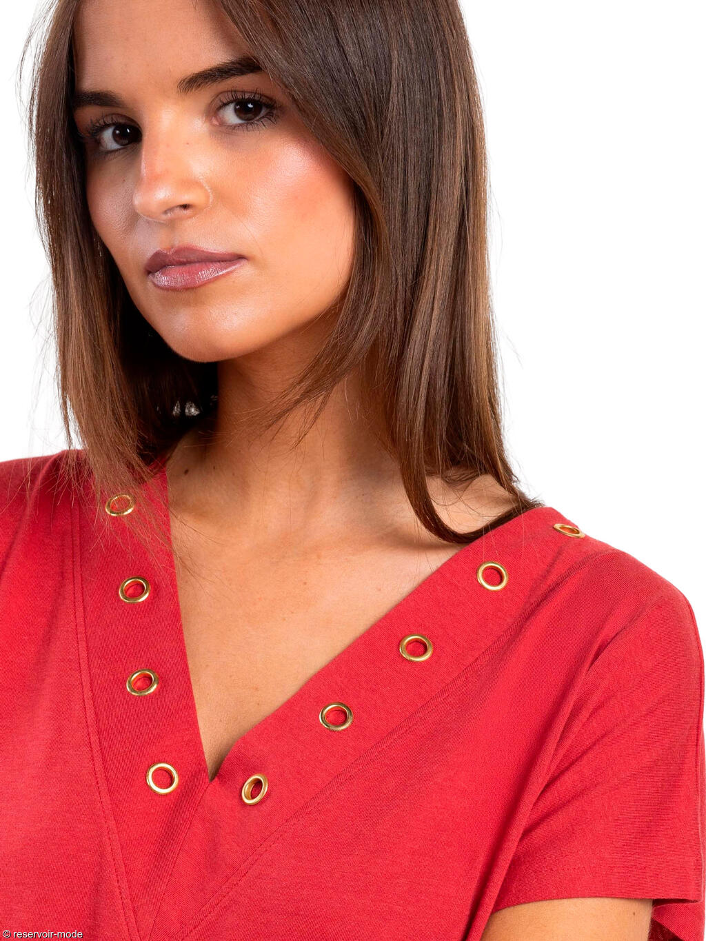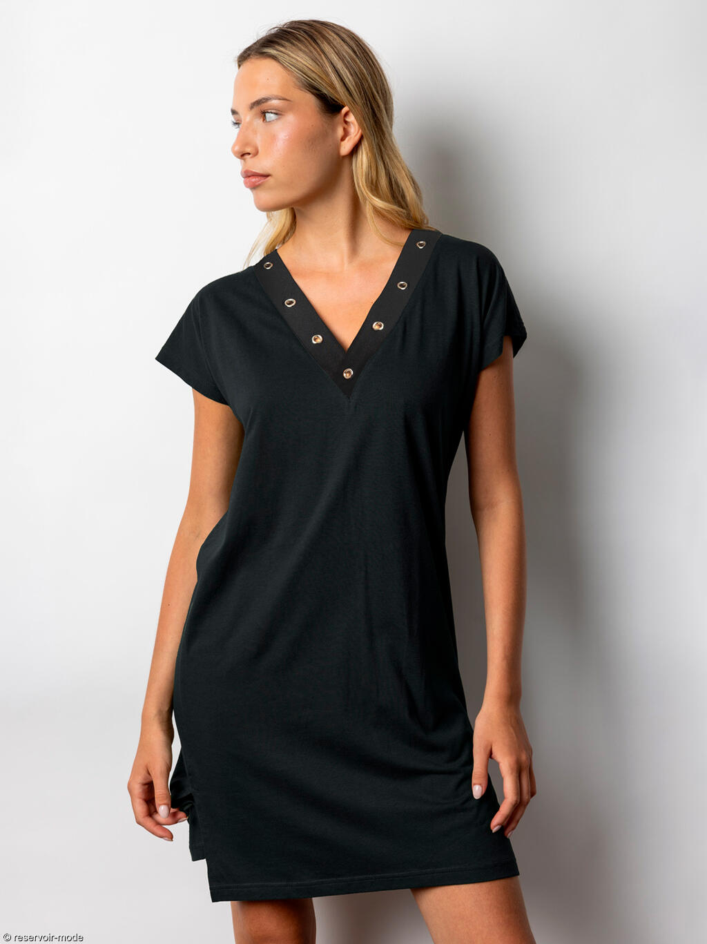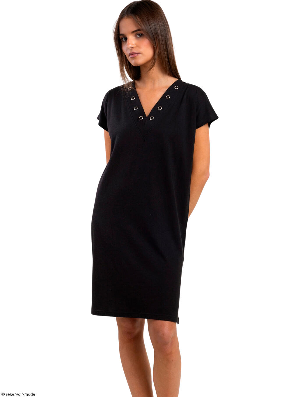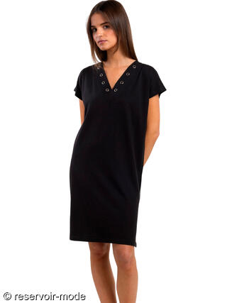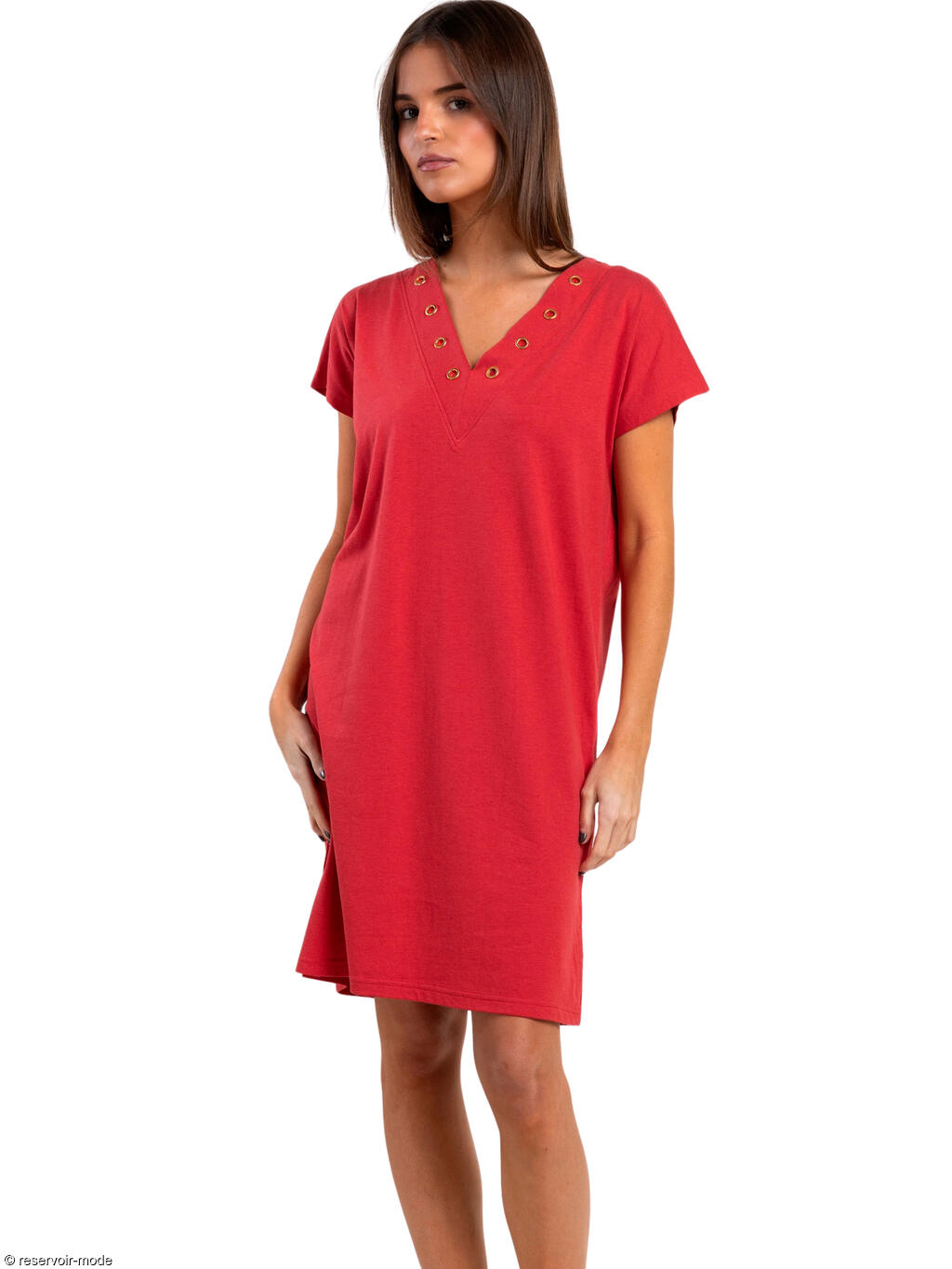 Cette robe estivale séduit par sa coupe simple et confortable, idéale pour les journées ensoleillées. Elle présente une coupe droite et légèrement ample, offrant une grande liberté de mouvement et un tombé fluide. Sa longueur au-dessus du genou lui confère une allure décontractée et facile à porter au quotidien. Le modèle est doté de manches courtes et d’un décolleté en V subtilement travaillé avec des oeillets métalliques décoratifs qui apportent une touche moderne et structurée. Ce détail souligne délicatement l’encolure et ajoute du caractère à l’ensemble. Grâce au mélange coton–viscose, le tissu est doux, respirant et agréable sur la peau, parfait pour la saison estivale. C’est une pièce polyvalente, aussi adaptée à une tenue casual qu’à un look plus habillé avec quelques accessoires bien choisis.