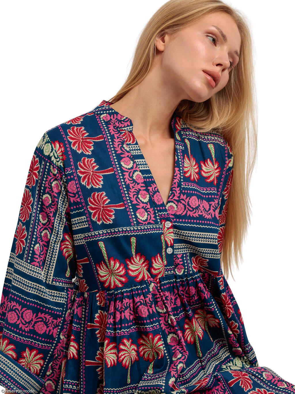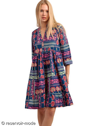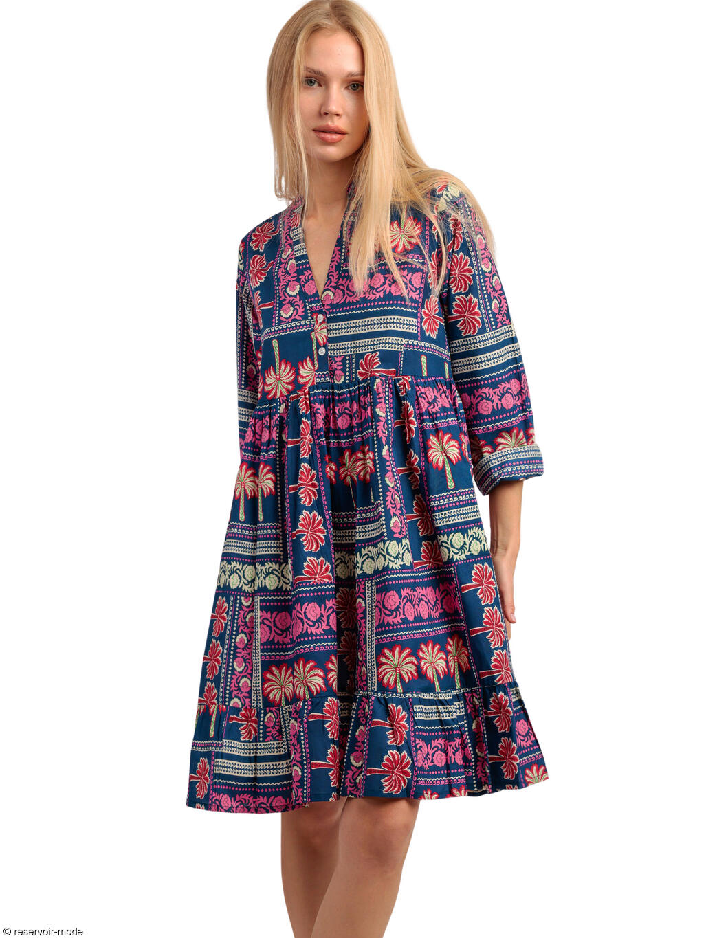 Cette robe estivale évoque immédiatement une sensation de fraîcheur et d’évasion. Sa matière entièrement en coton respirant épouse le mouvement du corps avec légèreté, idéale pour les fortes chaleurs tout en restant élégante. La coupe ample et évasée, structurée par des fronces sous la poitrine, crée une silhouette fluide et féminine. Le col en V, prolongé par une délicate patte de boutonnage, allonge le buste et apporte une touche subtilement raffinée. Les manches trois-quarts, souples et confortables, renforcent son esprit décontracté tout en offrant une couvrance agréable. L’imprimé est particulièrement remarquable : un mélange harmonieux de motifs floraux et graphiques, organisés en panneaux, qui rappellent l’art textile artisanal. Les teintes profondes de bleu marine contrastent avec des nuances vibrantes, donnant à la robe un caractère à la fois chaleureux, bohème et chic. Le bas de la robe se termine par un volant délicat, ajoutant du mouvement et une note romantique à l’ensemble. Facile à porter et polyvalente, cette robe se prête aussi bien à une balade estivale, un marché de vacances ou un déjeuner en terrasse, associée à des sandales plates pour un look naturel ou à des espadrilles pour une allure plus soignée.