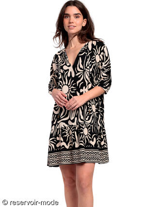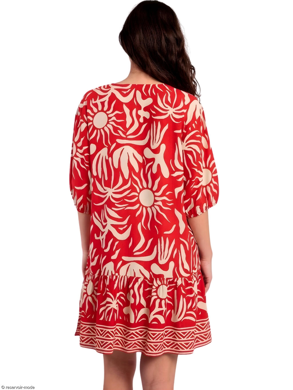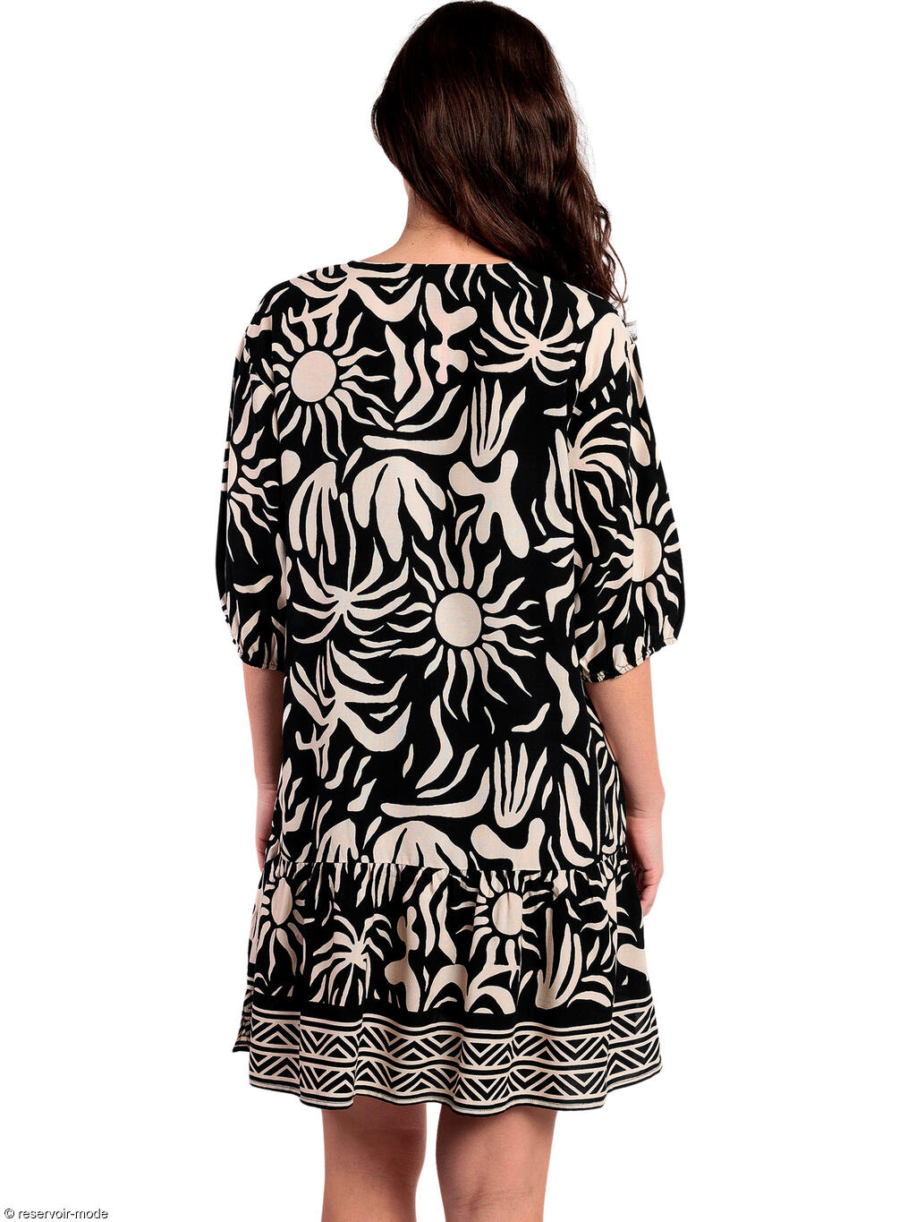 Robe estivale dans une coupe tunique confortable et agréable à porter, elle sera idéale à porter aussi bien pour vos vacances d'été que vos journées estivales en ville. Superbe imprimé abstrait de motifs en forme de soleils et de palmiers, qui sont soulignés par une bordure au style ethnique sur le bas de la tenue. Le col en V est muni de liens pampillés à nouer ou à laisser libres selon vos envies de style. Touche originale et ludique de volants sur le bas de la robe. Manches trois-quarts, couple ample, tissu viscose fluide et agréable à porter.
