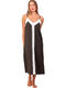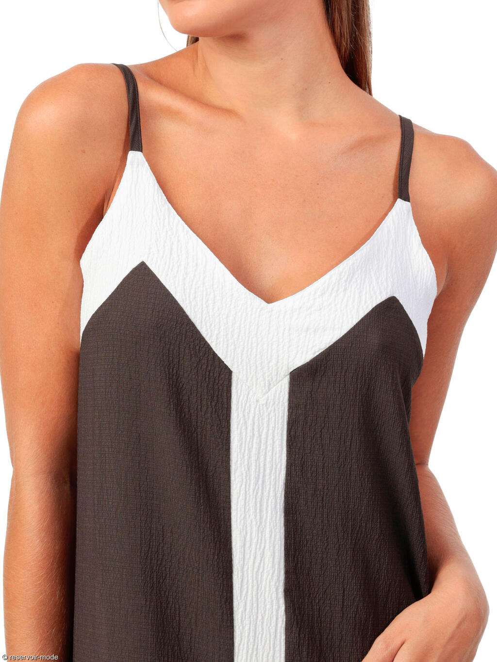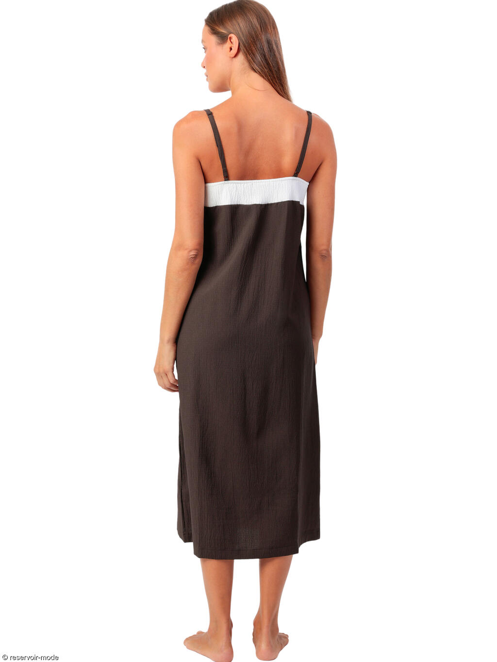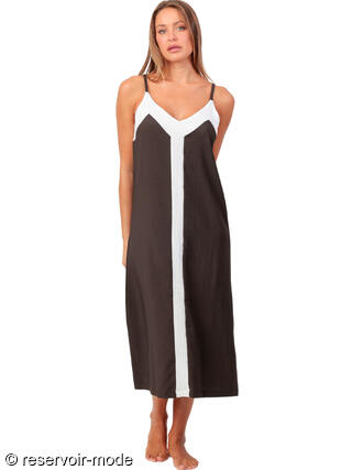 Cette robe longue affiche une allure à la fois élégante et décontractée, parfaite pour les journées d’été ou les soirées en bord de mer. Elle est confectionnée dans un tissu fluide à la texture légèrement gaufrée, qui lui confère un tombé souple et naturel. Sa coupe droite et ample épouse le corps sans le serrer, offrant un grand confort tout en allongeant la silhouette. Le design se distingue par un jeu de contrastes graphiques : la base de la robe est d’un brun profond, chaleureux et sobre, tandis qu'une large bande blanche descend du décolleté jusqu’à l’ourlet, créant une ligne verticale qui structure la robe et élance visuellement la silhouette. Cette bande blanche se prolonge en haut pour dessiner un empiècement en V inversé sur la poitrine, soulignant délicatement le décolleté, et dans le dos, mettant en valeur la ligne des épaules et de la nuque. Les fines bretelles spaghetti dégagent les épaules, ajoutant une touche féminine et légère. Elles sont réglables pour un ajustement parfait. Cette robe évoque une esthétique naturelle et minimaliste, idéale à porter telle quelle pour un style effortless chic, ou accessoirisée pour une allure plus sophistiquée.