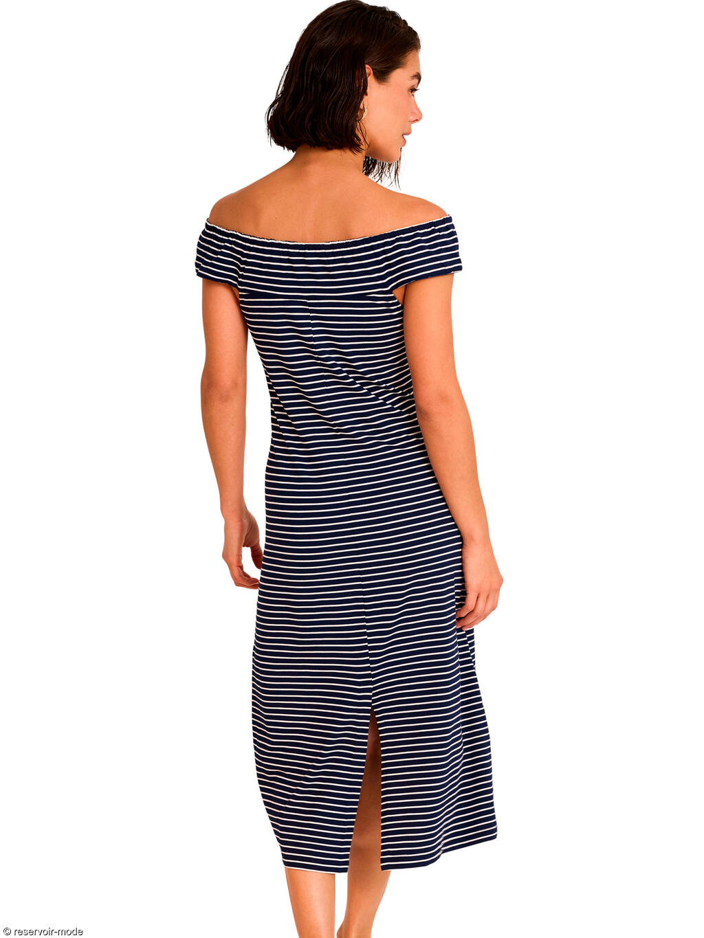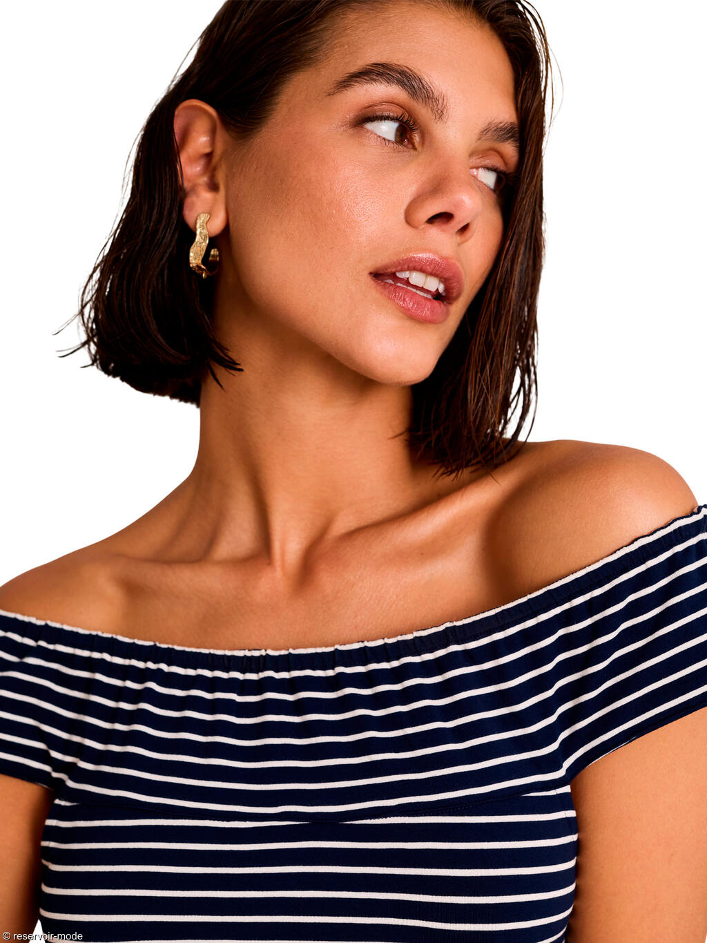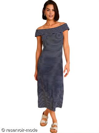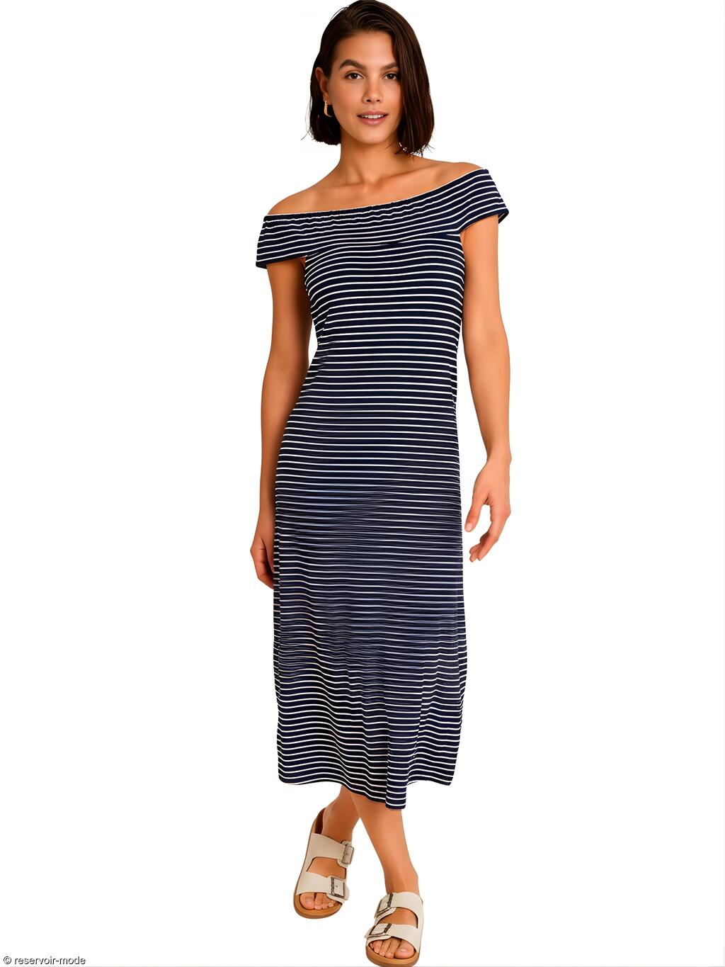 Cette robe estivale séduit par son style à la fois simple, féminin et intemporel, parfait pour les journées ensoleillées. Sa coupe longue près du corps épouse délicatement la silhouette avant de tomber de manière fluide jusqu’à mi-mollet. Sa ligne épurée met en valeur les courbes tout en restant confortable.Col bateau dégagé avec épaules dénudées, qui dévoile subtilement les épaules et le haut du buste. Cette encolure est soulignée par un large bandeau horizontal qui apporte structure et élégance à la robe. Les manches très courtes, intégrées au bandeau du col, donnent un effet délicat et estival. Le tissu est imprimé rayures horizontales fines blanches sur fond bleu marine, inspiré du style marin. Ce motif apporte une touche classique et estivale, tout en créant un effet visuel moderne. Cette robe est confectionnée en viscose, une fibre douce et respirante qui offre un tombé fluide et agréable à porter. La matière est légère, idéale pour les températures chaudes. Polyvalente et facile à porter, cette robe convient aussi bien pour une balade en bord de mer, une sortie estivale ou des vacances. Une robe estivale à l’esprit marinière, confortable et féminine, qui combine simplicité et élégance pour la saison chaude.