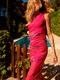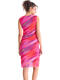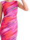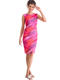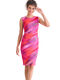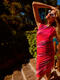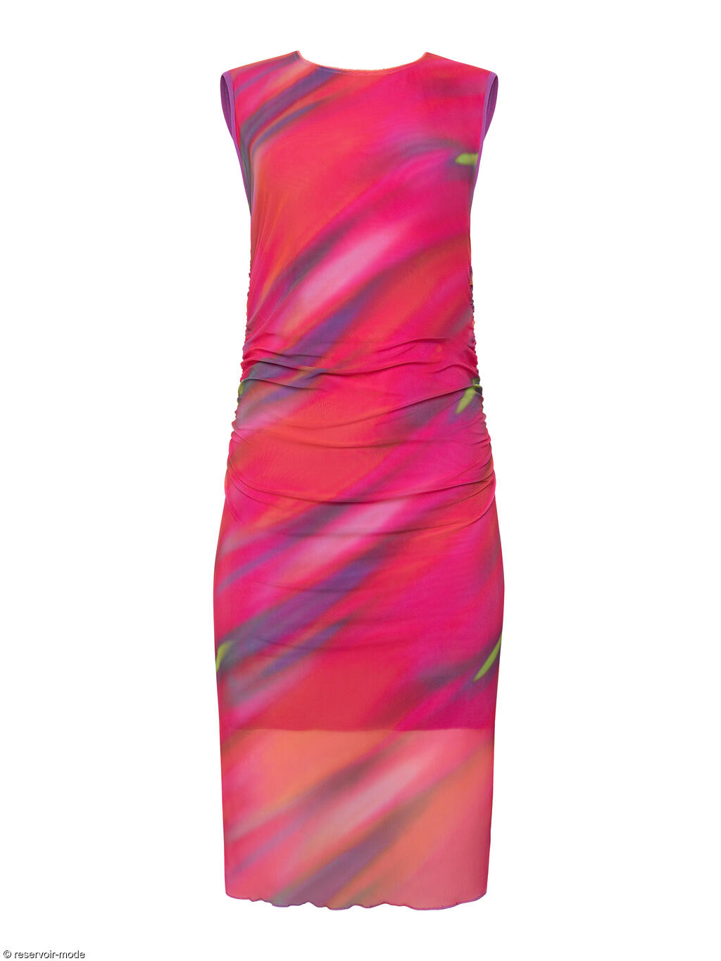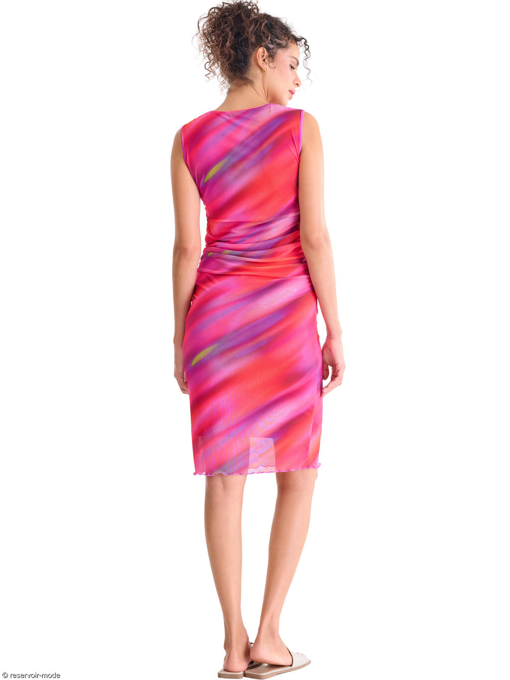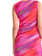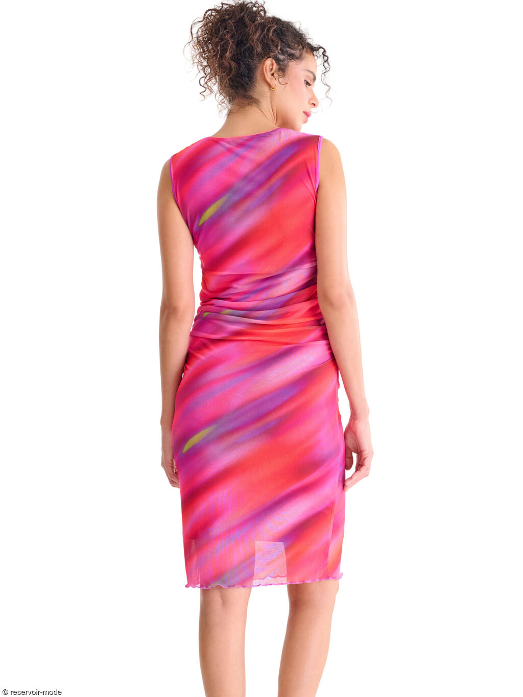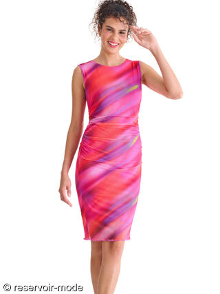 Robe élégante et féminine, à la coupe flatteuse et au style résolument moderne. Sans manches, à col rond, sa coupe près du corps est sublimée par de légers drapés latéraux au niveau de la taille, qui créent un effet froncé discret et très flatteur. Ce détail met en valeur la silhouette tout en apportant une touche de mouvement et de sophistication. L’ourlet légèrement ondulé au bas de la robe ajoute une finition délicate et féminine, tandis que la longueur, arrivant juste au genou, en fait une pièce parfaite pour des occasions estivales : un cocktail, une soirée ou un événement chic en plein air. Longueur environ 110 cm. Le tissu est un voile extensible et fin, qui épouse le mouvement du corps. L’imprimé est spectaculaire : un motif abstrait aux nuances vibrantes, créant un effet de dégradé fluide et irisé, presque comme une peinture aquarelle en mouvement. Les couleurs intenses et lumineuses évoquent la chaleur d’un coucher de soleil d’été ou l’énergie d’une soirée tropicale. Il s'en dégage une ambiance estivale, féminine et dynamique, parfaite à porter pour une garden-party, un apéritif en bord de mer ou une escapade estivale.
