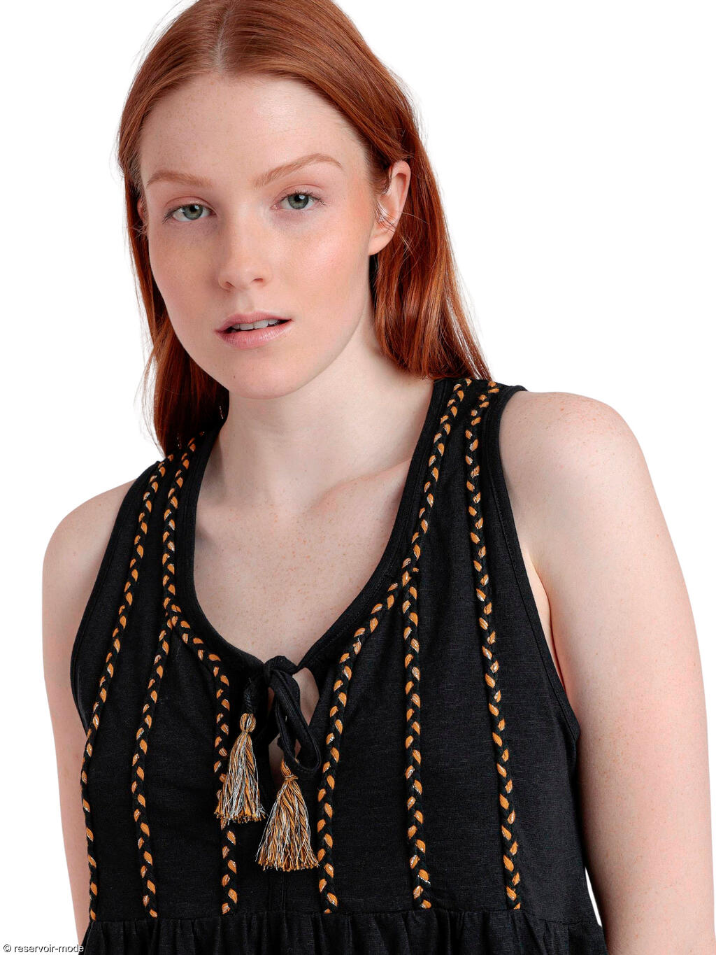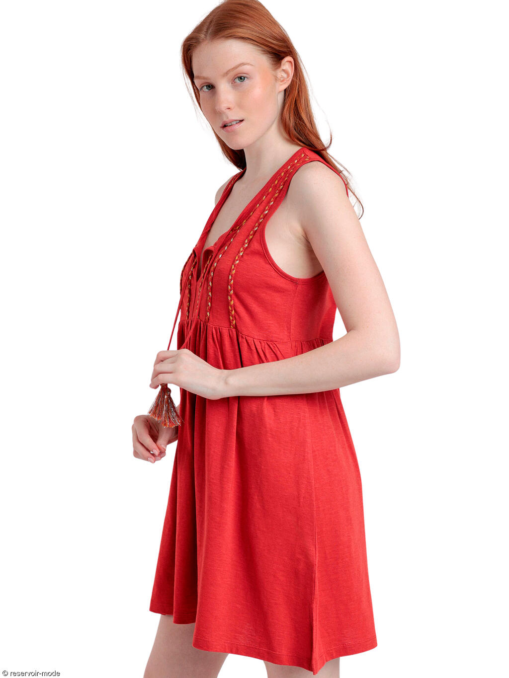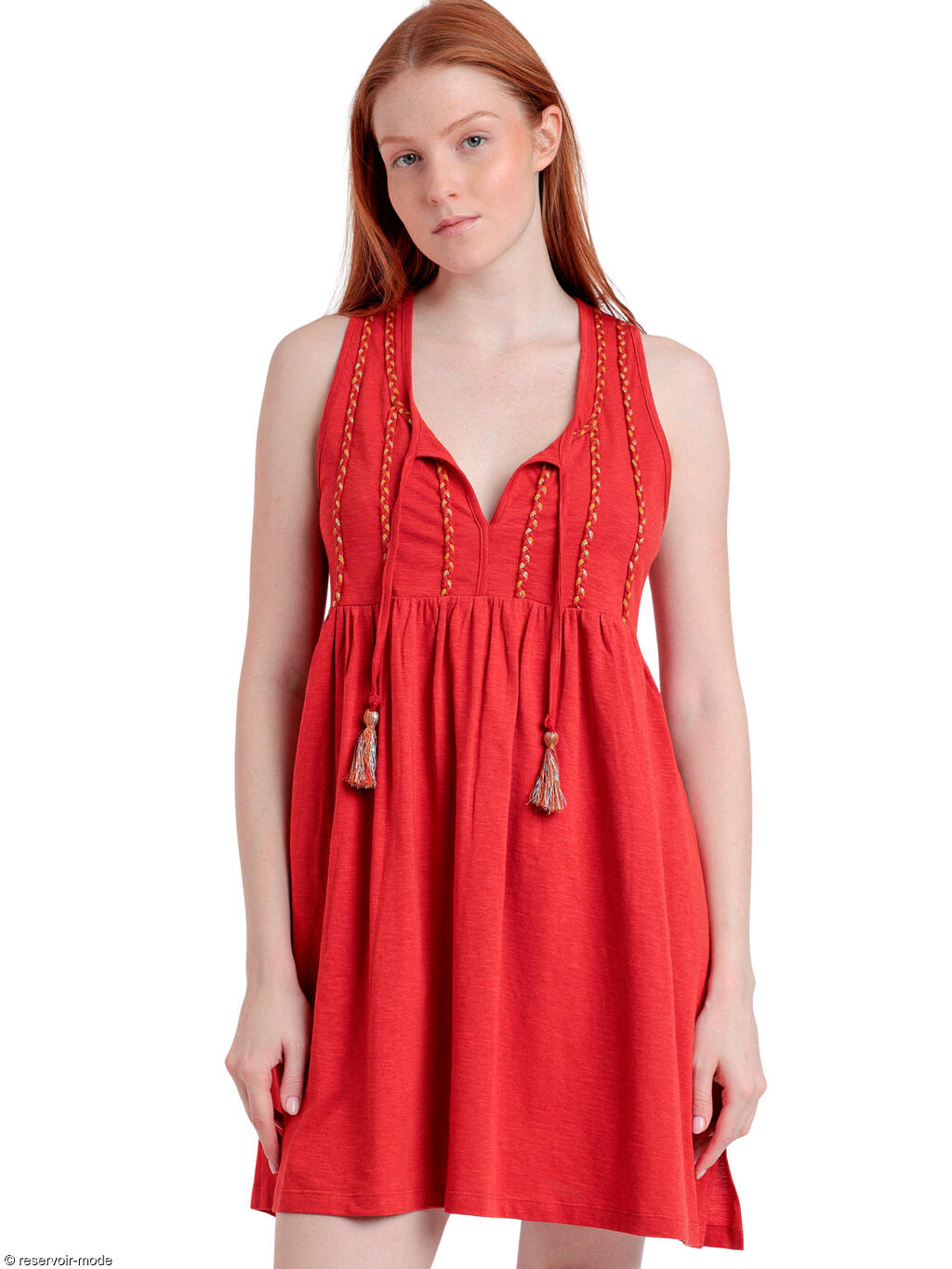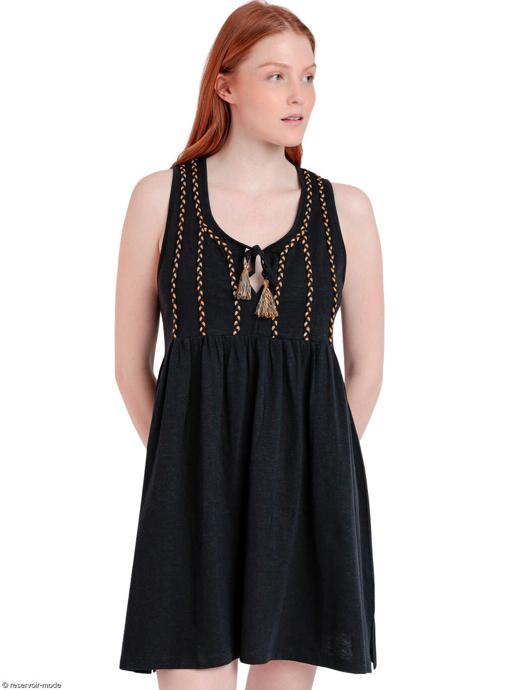 Robe estivale sans manches qui allie à la perfection confort et style. Confectionnée dans un mélange de coton et de viscose, doux et respirant, elle peut être portée toute la journée sans compromettre le design. Elle se distingue par ses détails tressés qui descendent élégamment sur le devant, s'étendant verticalement depuis les épaules jusqu'à la taille. Le décolleté en V plongeant met en relief le haut du buste, et peut être porté ouvert ou fermé grâce à des liens pampillés. Ces cordons rehaussés par de charmants pompons ajoutent une touche ludique, et conférent un style bohème-chic à la tenue. La taille est marquée par un léger froncement, donnant du volume à la partie jupe, qui s’évase doucement vers le bas pour arriver juste au-dessus des genoux. Avec ses couleurs audacieuses et sa coupe décontractée, cette robe sera parfaite pour toutes les occasions, du brunch entre amis à la promenade en soirée sur la plage. Son design chic et naturel la destine à devenir votre pièce incontournable cette saison.