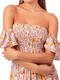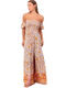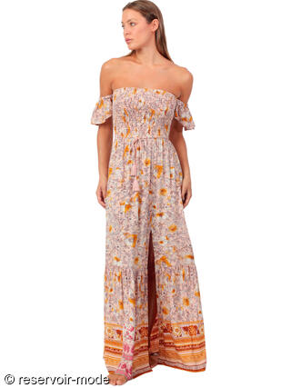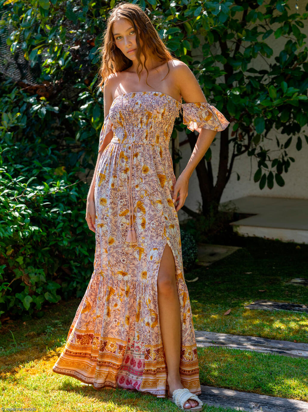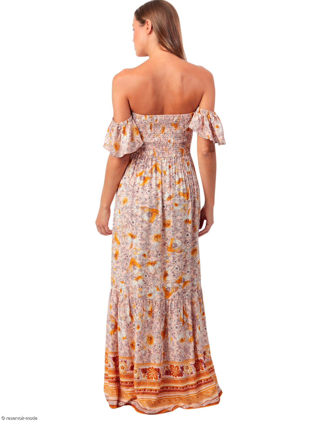 Découvrez l'élégance de l'été avec cette robe longue à épaules dénudées, entièrement en viscose légère et fluide. Elle présente des motifs floraux vibrants, et des volants discrets, respirant une ambiance estivale et décontractée. La partie haute de la robe est froncée dans un esprit bustier, et les manches courtes à volants tombent légèrement sur les bras, soulignant superbement le buste, la ligne des épaules et le dos nu. Ce design off-shoulder ajoute une touche de féminité et de sophistication, vous permettant de profiter pleinement de l'été tout en restant élégante. La taille est marquée par un cordon à pompons, qui ajoute une touche bohème irrésistible, et qui permet de régler la taille créant une silhouette plus ou moins cintrée selon vos envies. La jupe est longue et ample, avec une fente sur le côté qui laisse délicatement apparaître une jambe. Le bas de la robe présente une bande horizontale avec des motifs floraux et géométriques plus denses. Parfaite pour une journée ensoleillée ou une soirée d'été, cette robe vous fera rayonner de style. Sa coupe est pensée pour flatter toutes les morphologies, et vous offrira une allure lumineuse et estivale. Avec son imprimé floral délicat et sa fente audacieuse, cette robe est un hymne à la féminité et à la liberté.