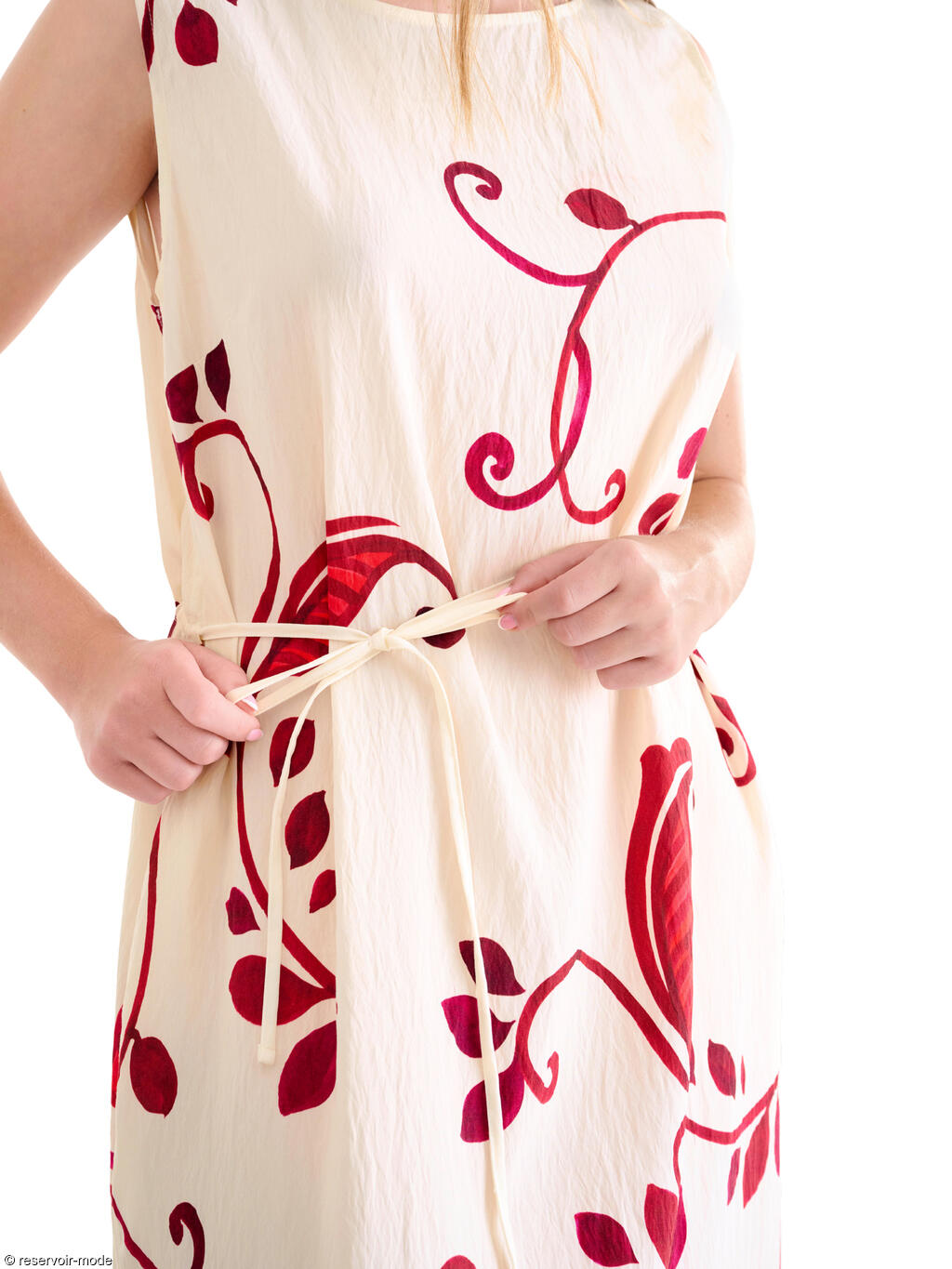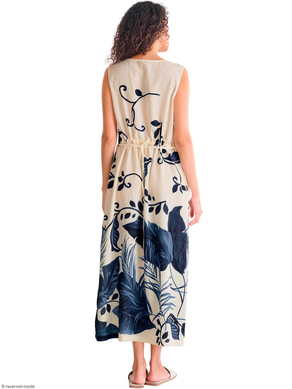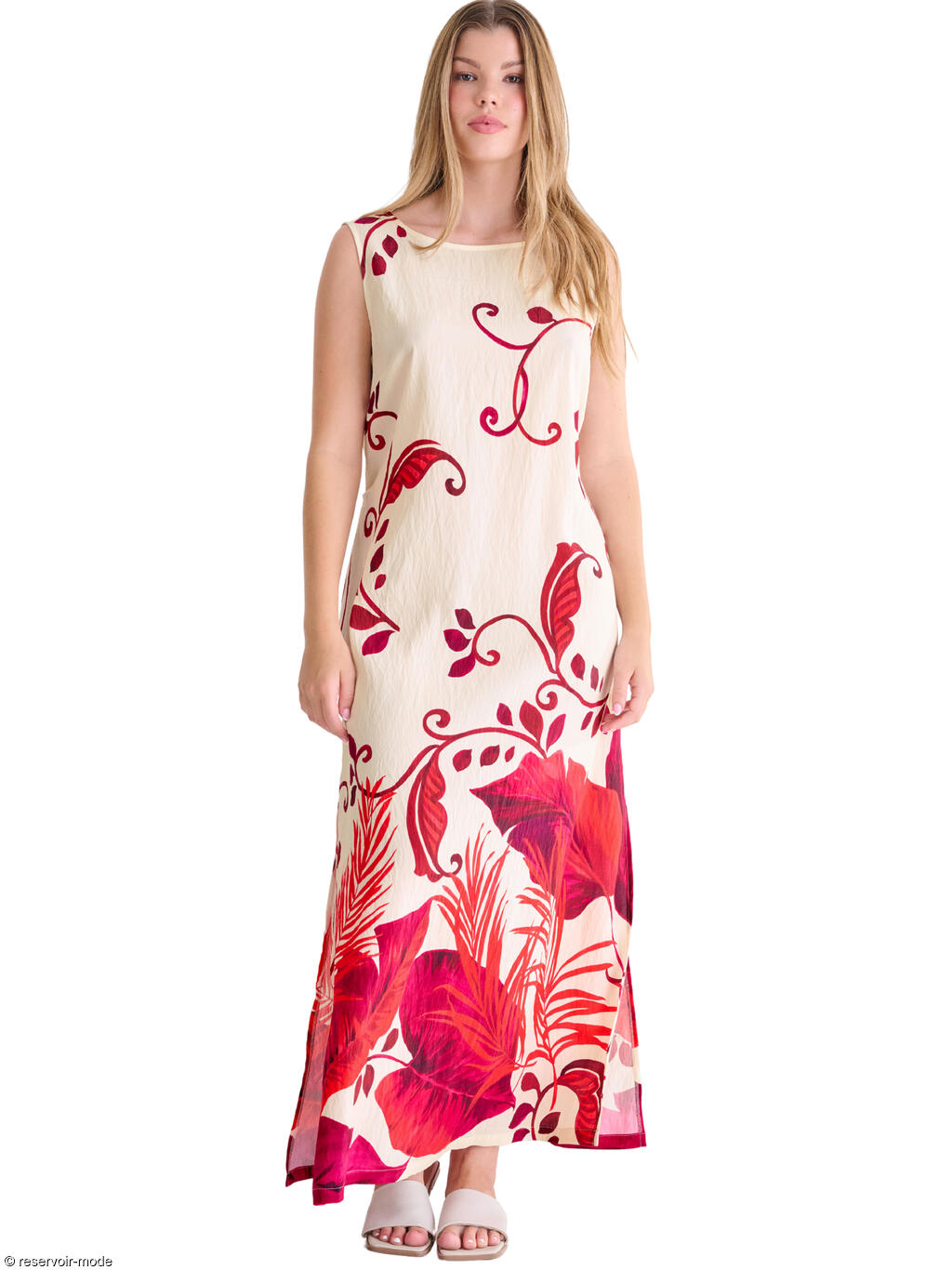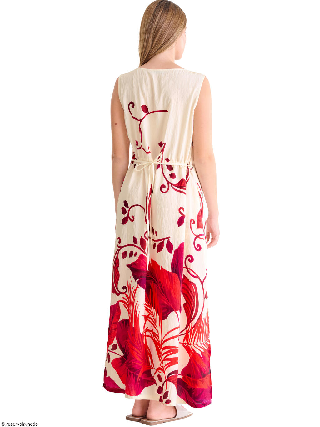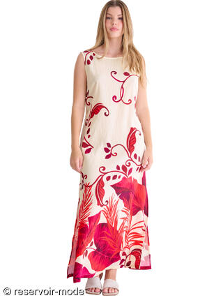 Cette robe longue évoque immédiatement l’été et la douceur des vacances. Confectionnée dans un tissu viscose fluide à la texture légèrement plissée, elle épouse le mouvement du corps avec légèreté et élégance. Sa base de couleur écru lumineuse met en valeur un somptueux imprimé végétal dans une palette intense. Les motifs, inspirés de la nature tropicale, alternent entre de grandes feuilles exotiques et des arabesques fines qui serpentent sur toute la longueur du tissu, créant un effet à la fois artistique et dépaysant. La coupe droite est subtilement ajustée à la taille grâce à un cordon fin à nouer dans le dos, permettant de moduler la silhouette selon l’envie : plus fluide pour une allure bohème, ou plus cintrée pour une touche féminine affirmée. La longueur d'environ 130 cm allonge la silhouette, tandis que les fentes légères sur les côtés facilitent la marche et ajoutent une note de sensualité discrète. L’encolure ronde dégagée et l’absence de manches apportent une sensation de liberté et de fraîcheur, idéale pour les journées ensoleillées. Elle est par ailleurs dotée de poches latérales qui la rendent pratique. Cette robe incarne le charme décontracté d’une promenade en bord de mer ou deviendra la tenue parfaite pour un dîner d’été ou un cocktail au coucher du soleil.