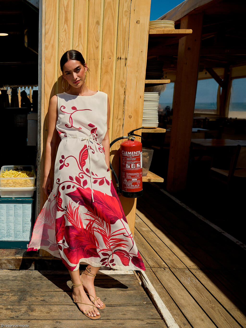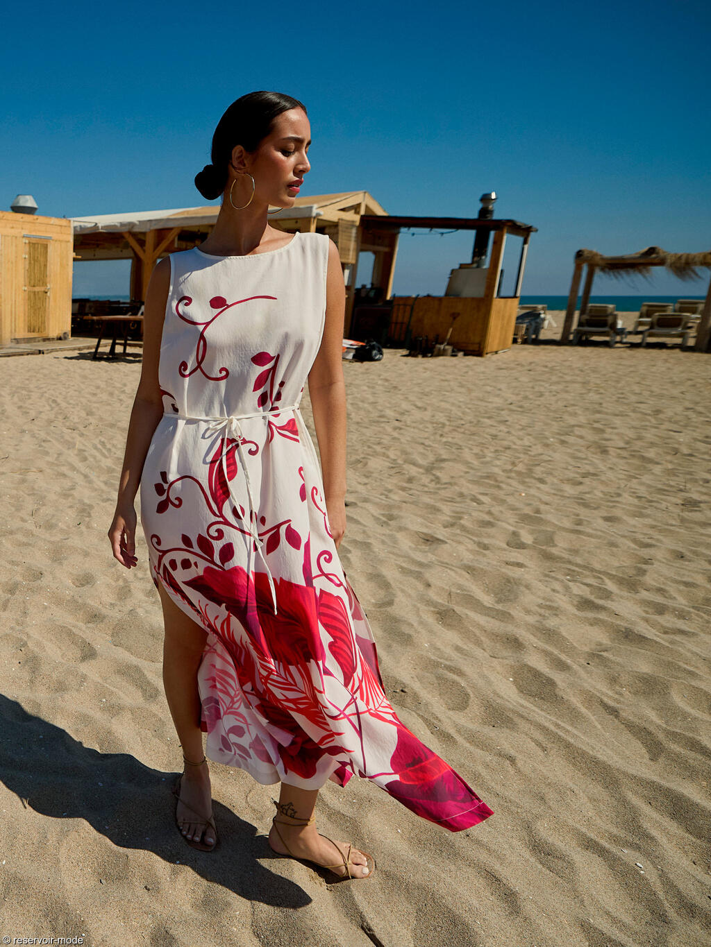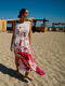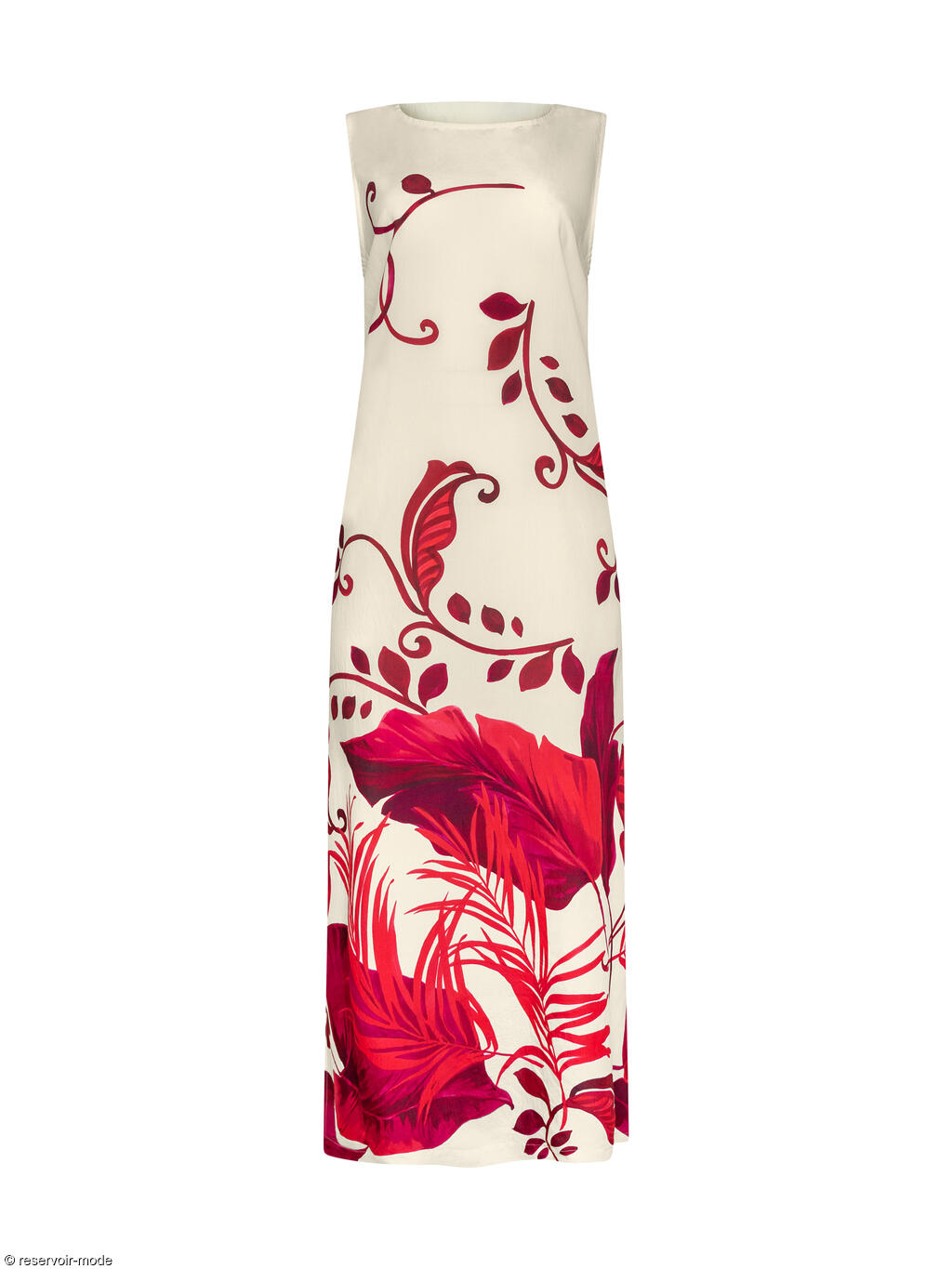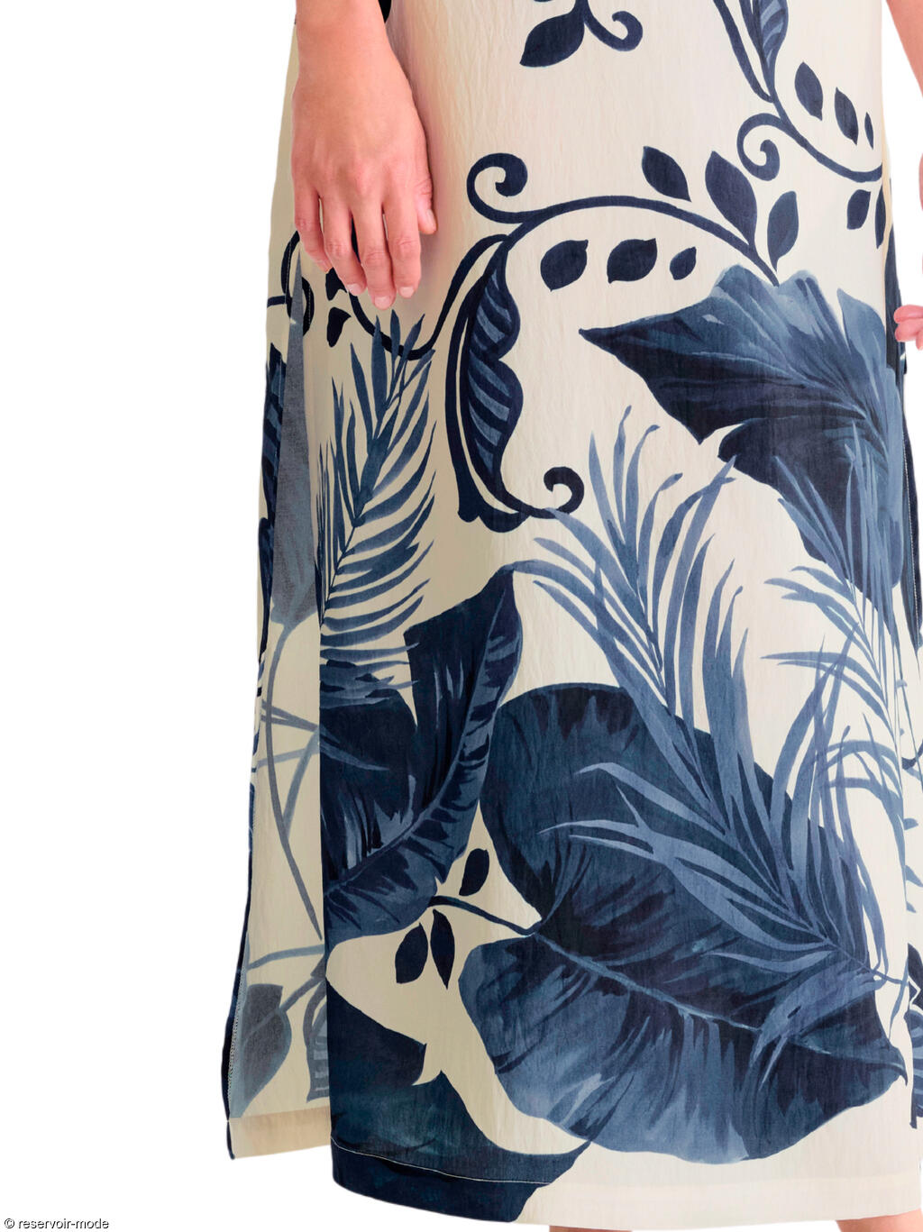 Cette robe longue évoque immédiatement l’été et la douceur des vacances. Confectionnée dans un tissu viscose fluide à la texture légèrement plissée, elle épouse le mouvement du corps avec légèreté et élégance. Sa base de couleur écru lumineuse met en valeur un somptueux imprimé végétal dans une palette intense. Les motifs, inspirés de la nature tropicale, alternent entre de grandes feuilles exotiques et des arabesques fines qui serpentent sur toute la longueur du tissu, créant un effet à la fois artistique et dépaysant. La coupe droite est subtilement ajustée à la taille grâce à un cordon fin à nouer dans le dos, permettant de moduler la silhouette selon l’envie : plus fluide pour une allure bohème, ou plus cintrée pour une touche féminine affirmée. La longueur d'environ 130 cm allonge la silhouette, tandis que les fentes légères sur les côtés facilitent la marche et ajoutent une note de sensualité discrète. L’encolure ronde dégagée et l’absence de manches apportent une sensation de liberté et de fraîcheur, idéale pour les journées ensoleillées. Elle est par ailleurs dotée de poches latérales qui la rendent pratique. Cette robe incarne le charme décontracté d’une promenade en bord de mer ou deviendra la tenue parfaite pour un dîner d’été ou un cocktail au coucher du soleil.
