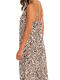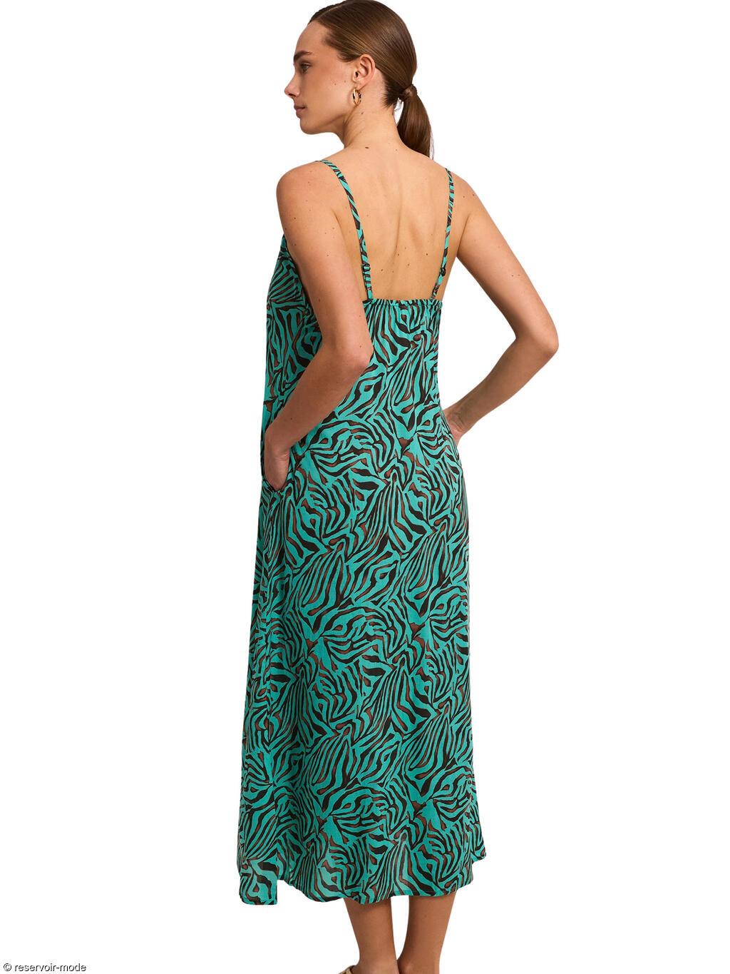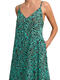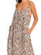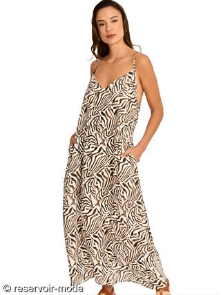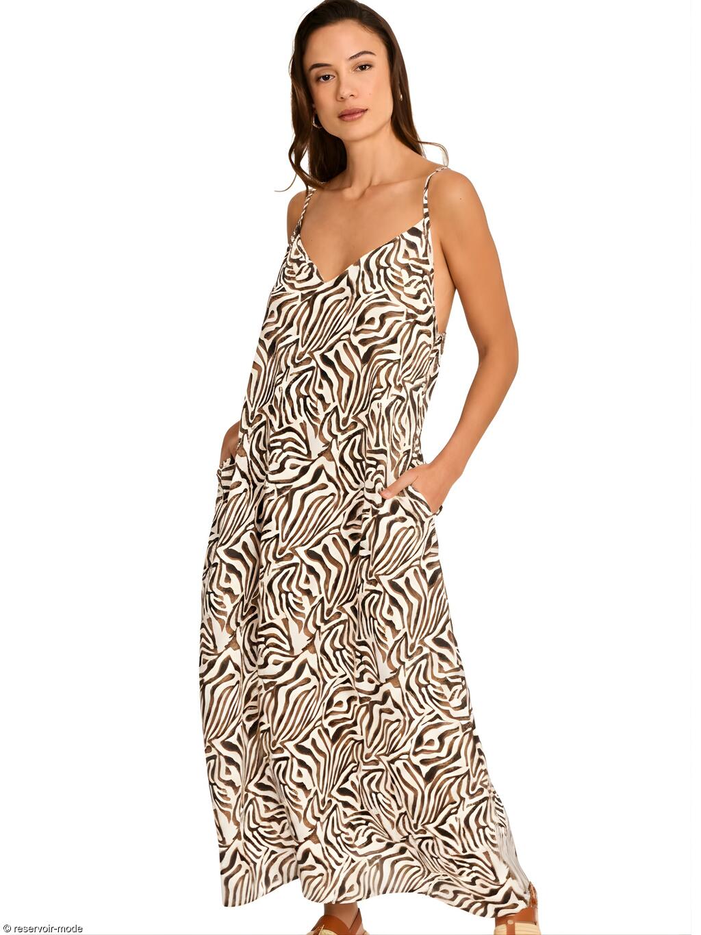 Cette robe longue d'été allie fluidité et élégance avec un motif animalier tendance. Elle présente une silhouette ample et vaporeuse qui offre un maximum de confort et de légèreté. Elle possède un décolleté en V subtil à l'avant, soutenu par de fines bretelles réglables. Le modèle intègre des poches latérales invisibles, ajoutant une touche fonctionnelle et décontractée. Entièrement en viscose, cette matière est appréciée pour sa douceur, son aspect soyeux et sa capacité à laisser respirer la peau par temps chaud. C'est la pièce parfaite pour passer de la plage à un dîner estival. Sa fluidité lui donne un mouvement élégant à chaque pas.