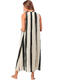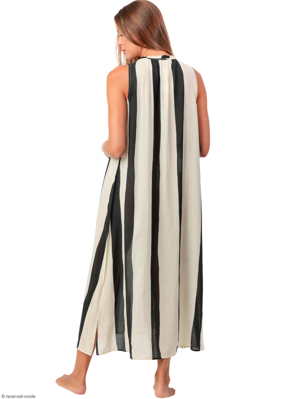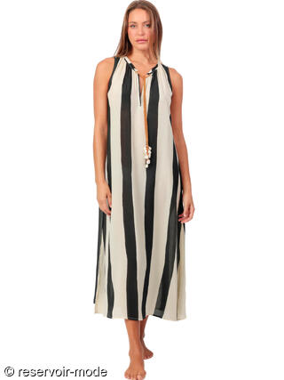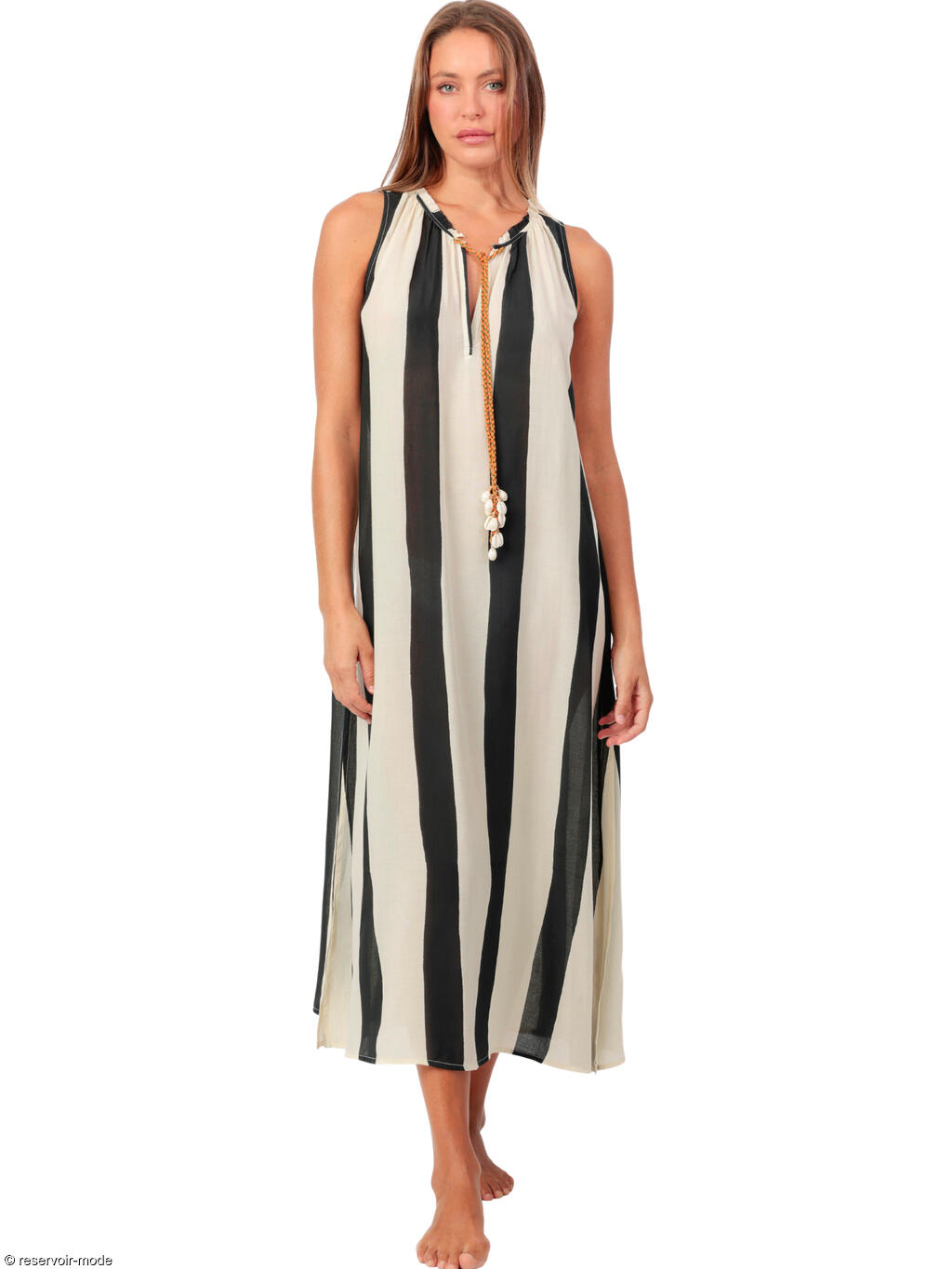 Élégance intemporelle et confort vous séduiront dans cette robe longue aux rayures audacieuses, parfaite pour sublimer votre allure avec une touche de chic décontractée. Son tissu fluide, entièrement en modal doux et léger, et son design épuré, vous assurent un style sophistiqué sans effort. Sans manches, son col V noué et son tombé impeccable en font une pièce unique pour celles qui aiment allier originalité et distinction. Le détail coquillages qui orne les liens de serrage apporte une note d'évasion, c'est la touche finale qui évoque l'été, la plage et les vacances. Idéale pour les journées ensoleillées ou les soirées douces, ou que ce soit pour une promenade en ville ou une escapade en bord de mer, elle vous accompagnera avec élégance. Cette robe longue sans manches, avec ses rayures graphiques et son tissu aéré, est le summum du confort chic.