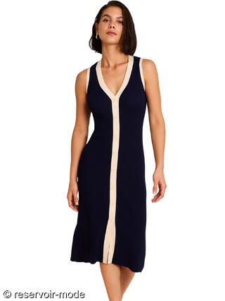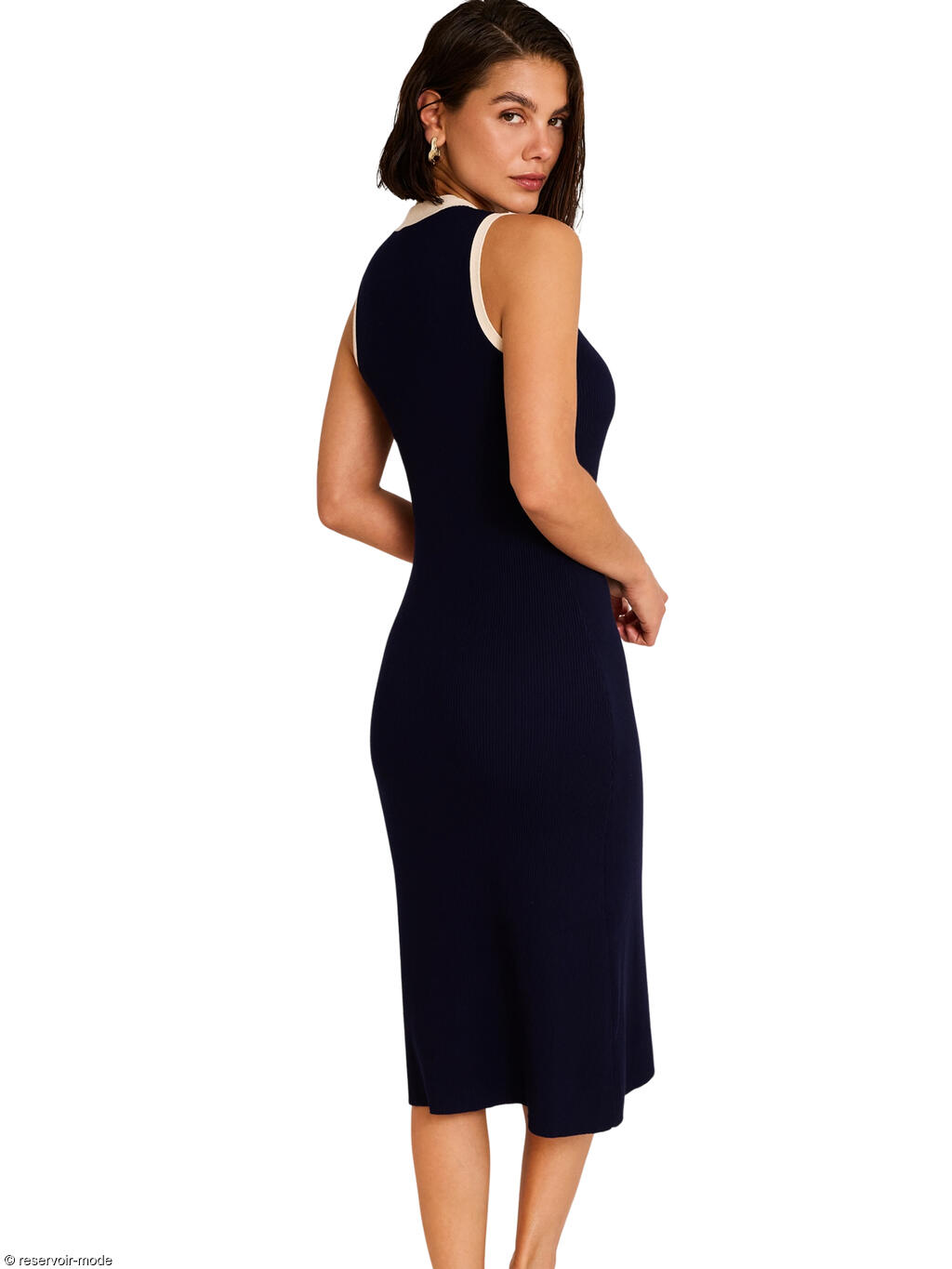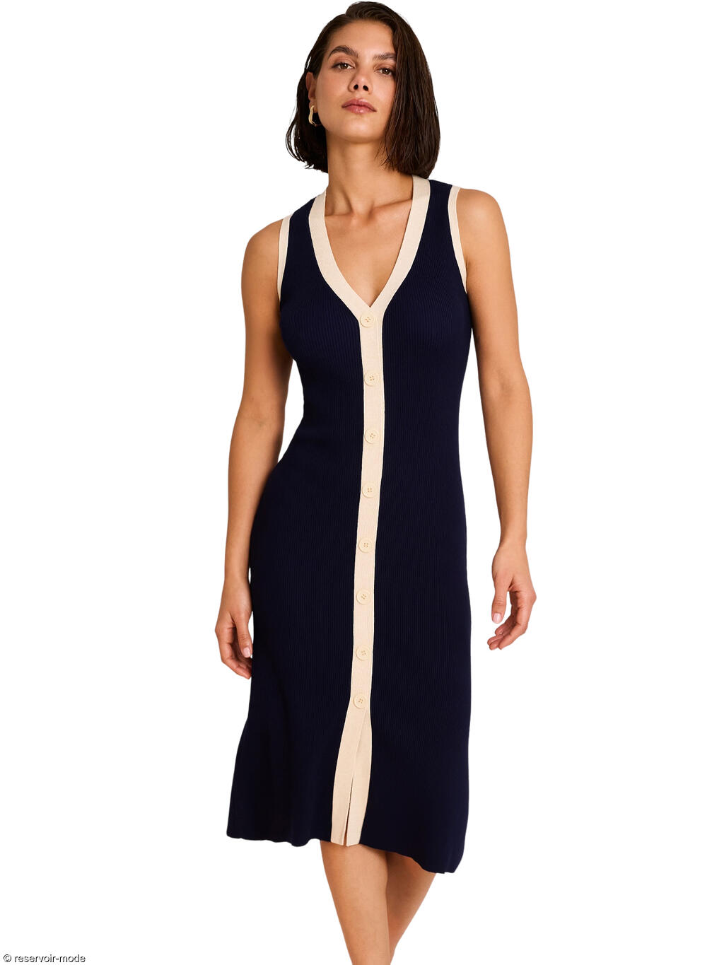 Élégance minimaliste et allure sportive-chic se marient dans cette robe estivale, rappelant les codes intemporels de la mode balnéaire des années 60. Confectionnée entièrement en viscose, elle offre une grande douceur et une fluidité naturelle qui épouse les mouvements. Le tissu présente un travail de maille côtelée qui donne de l'élasticité au vêtement tout en affinant visuellement la silhouette. La coupe midi ajustée souligne délicatement les courbes avant de s'évaser légèrement au bas. Décolleté en V flatteur, bordé d'un liseré qui se prolonge sur toute la longueur de la robe. Design sans manches avec des emmanchures dégagées, soulignées par le même liseré pour un fini net et graphique. Une boutonnière centrale parcourt l'avant de la robe avec de petits boutons assortis au liseré. C'est une pièce polyvalente qui peut se porter aussi bien pour une balade chic sur le port que pour un déjeuner en ville.