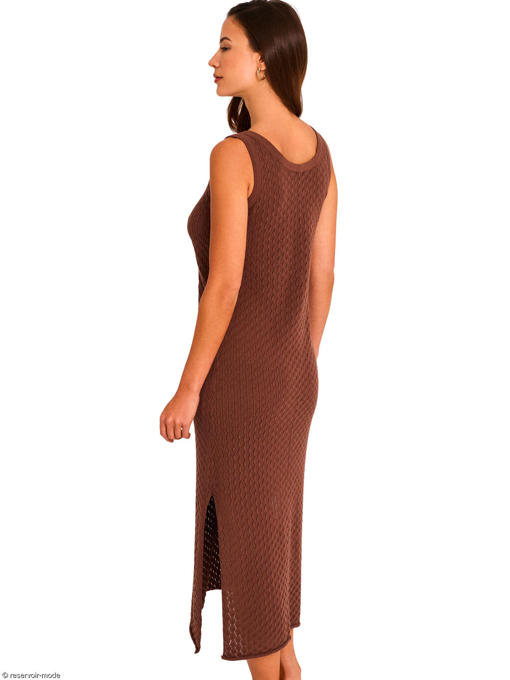 Robe de plage longue fendue sans manches COMPLEMENTOS de la marque Selmark Mare. Cette robe d'été présente un style minimaliste et texturé, idéal pour une [voir la suite]