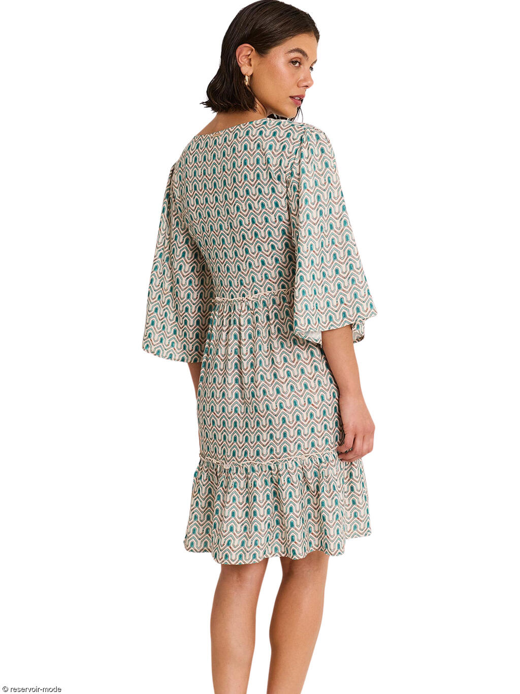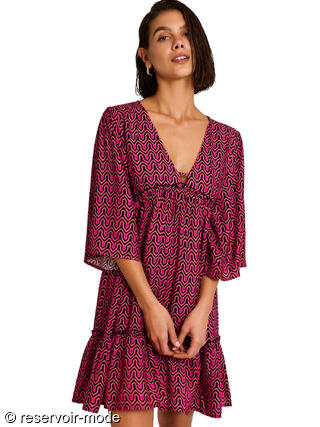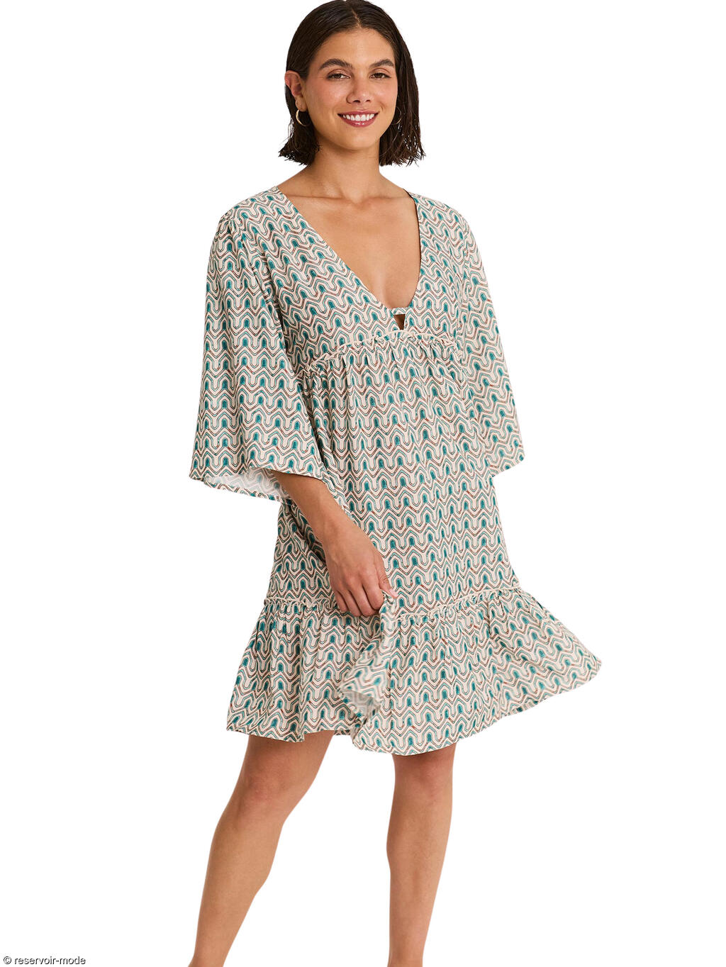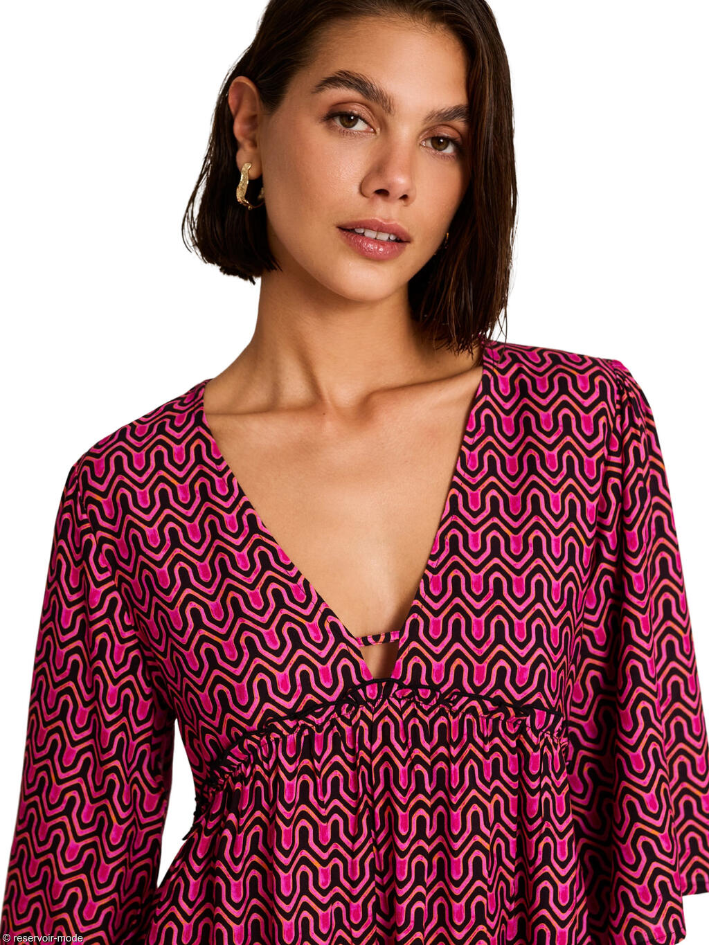 Cette robe tunique de plage allie légèreté et fluidité, offrant un tombé soyeux idéal pour les journées chaudes. Son design mise sur un équilibre entre une coupe structurée et des détails féminins. La coupe évasée est resserrée juste sous la poitrine pour marquer la silhouette tout en restant confortable. Elle présente un décolleté en V profond et plongeant, souligné par un petit lien horizontal discret qui maintient la structure. Les manches sont de longueur mi-longue et larges, évasées, accentuant l'esprit bohème de la pièce. Un jeu de fronces sous la poitrine, et au-dessus du volant final au bas de la robe, crée un joli volume. Entièrement en viscose, cette matière naturelle transformée est reconnue pour sa capacité à absorber l'humidité tout en restant très fraîche sur la peau. Sa coupe courte et ses manches larges en font une pièce parfaite pour passer du bord de mer à une terrasse de café.