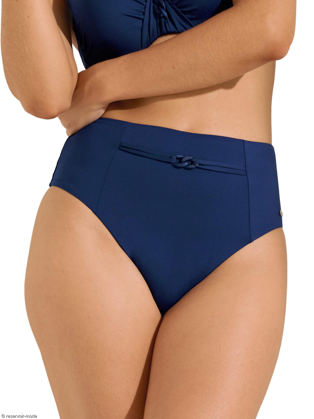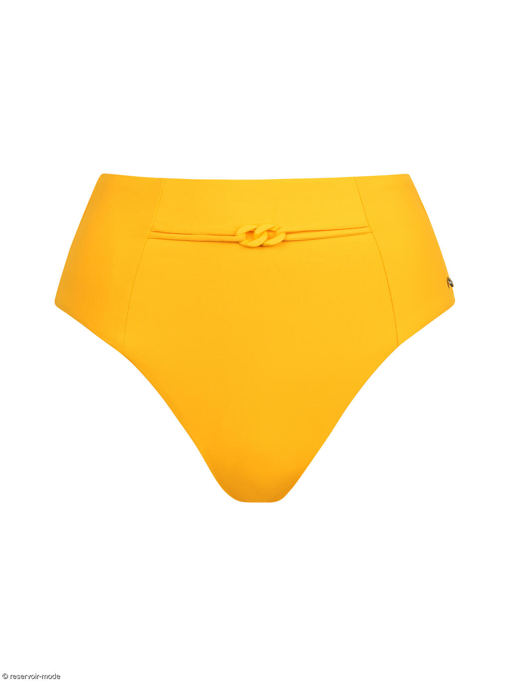 Bas de bikini à taille très haute qui arrive jusqu'au nombril, pour être parfaitement à l'aise et à la mode. Les ouvertures des jambes sont échancrées et allongent visuellement les jambes. Une chaîne moderne orne le devant, dont la couleur est assortie à celle du bas de bikini.