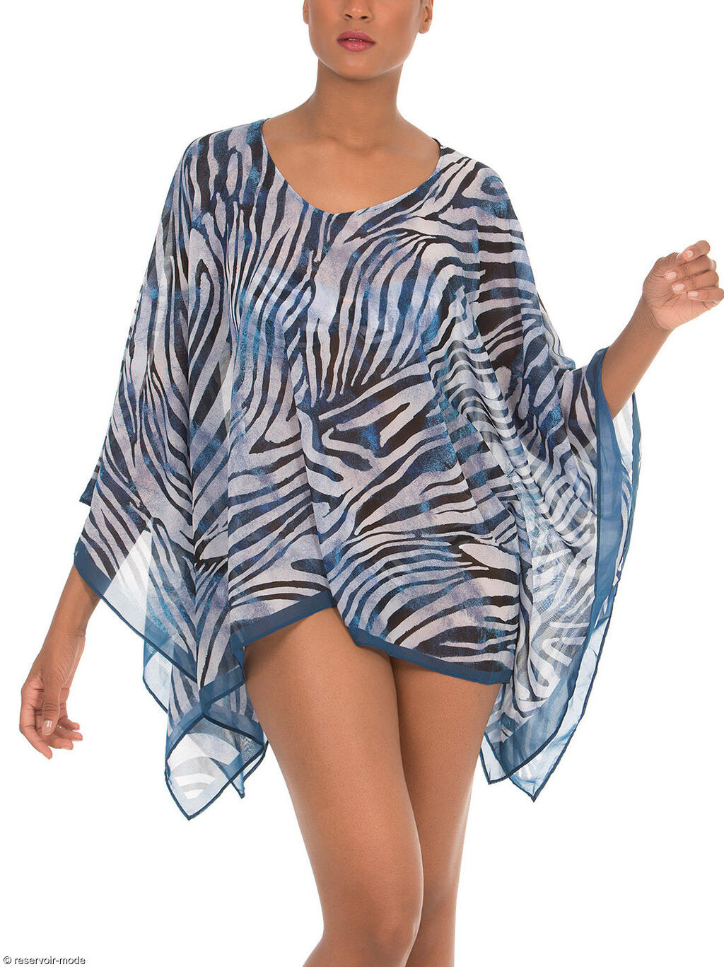 Caftan de plage collection Cebras de la marque Selmark Mare. Coloris bleu à motifs zébrés tendance, tenue fluide et asymétrique pour un look parfait sur la plage. Ce [voir la suite]