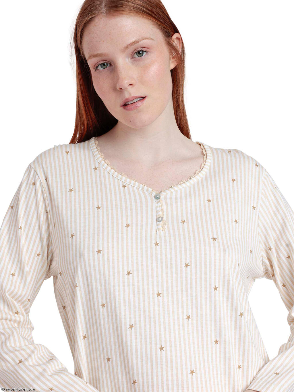 Cette chemise de nuit présente un style classique et doux, parfait pour des nuits confortables. Elle est ornée de fines rayures verticales, et parsemée de petites étoiles sur l’ensemble du tissu, ajoutant une touche ludique et féminine. Sa coupe droite et légèrement ample offre une grande liberté de mouvement pendant le sommeil. Manches longues, encolure ronde avec une petite patte de boutonnage à deux boutons et soulignée d'une fine bordure festonnée en dentelle. Longueur mi-cuisse, idéale pour rester à l’aise sans avoir trop chaud. Fabriquée en tissu mi-coton mi-viscose agréable au toucher et respirant, léger et confortable.  Livrée dans une boîte-coffret Admas.