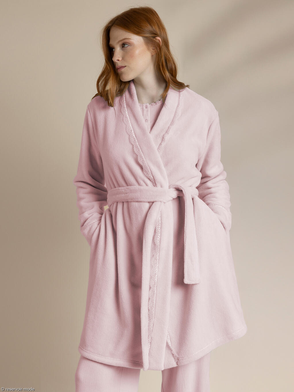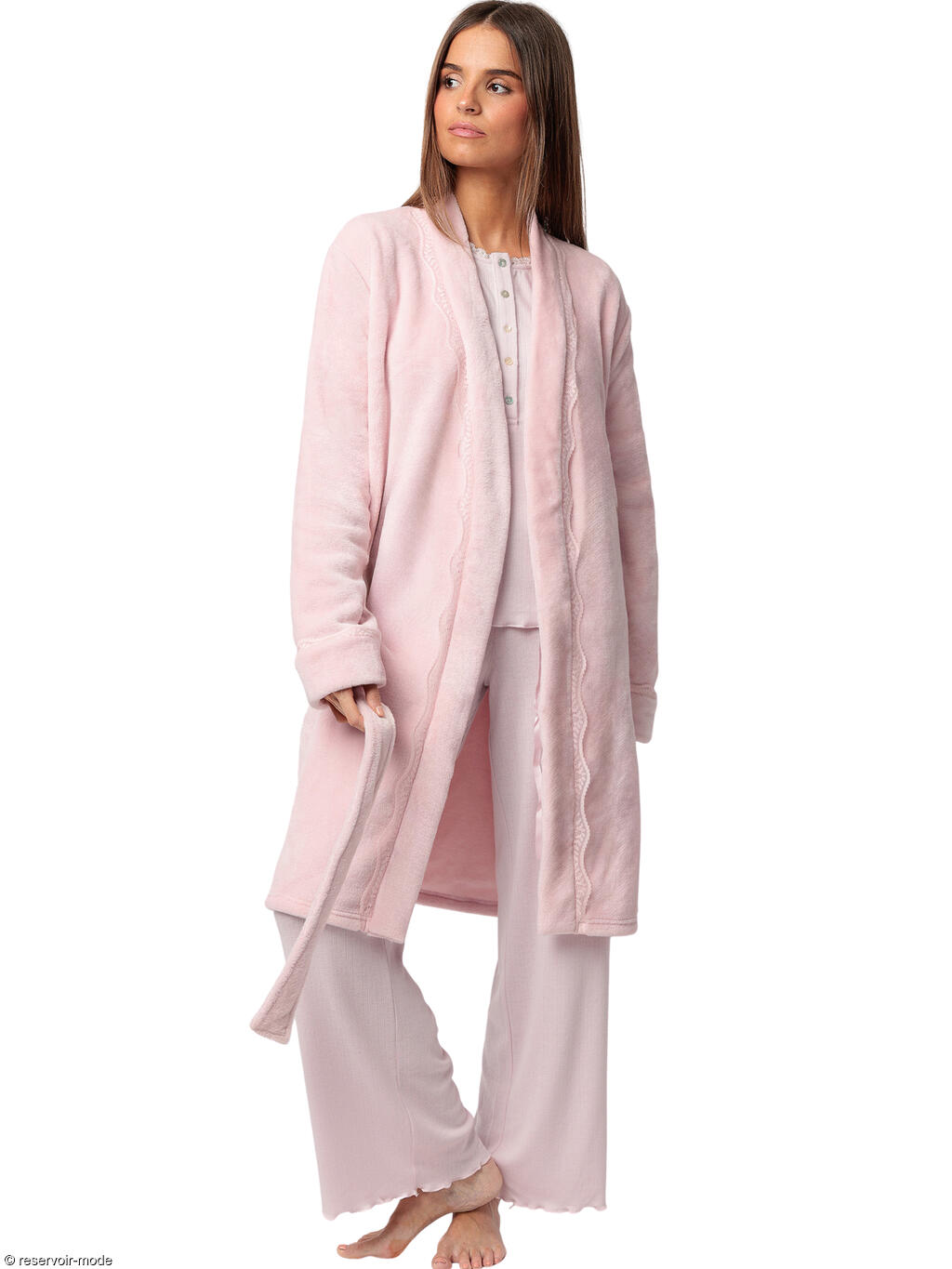 Robe de chambre à manches longues dans un style classique et élégant, idéale pour l’hiver et les matinées fraîches. Tissu polaire Corel effet velours, chaude et très douce au toucher. Elle a un col châle large pour bien couvrir le haut du buste, et une ceinture à nouer à la taille. Une jolie bordure fine en dentelle ondulée ton sur ton suit l’ouverture de la robe de chambre, ajoutant une note féminine et délicate. Poches latérales pratiques et discrètes. Avec ses teintes tendres et apaisantes, symbole de douceur et de confort, cette robe de chambre est un modèle ultra doux et féminin, parfait pour les moments cocooning à la maison. Livrée dans une boîte-coffret Admas.