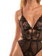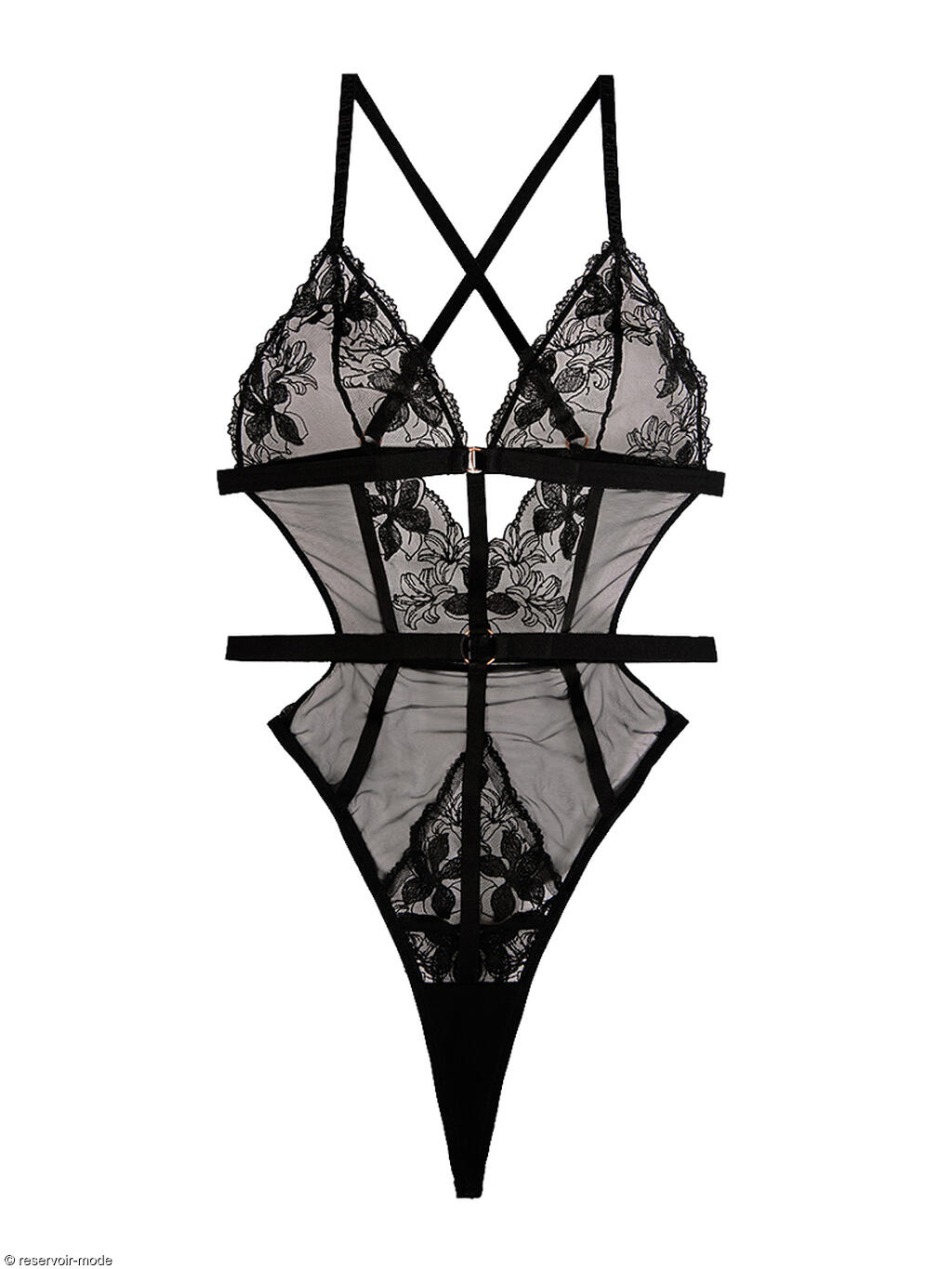 Body exquis qui allie élégance et sensualité. Il incarne la féminité audacieuse, mariant transparence délicate et découpes graphiques pour sublimer les courbes avec raffinement. Le haut du body présente des bonnets triangles souples, sans armatures, offrant un effet naturel et très sensuel. Il est confectionné en tulle fin transparent, rehaussé de broderies florales en noir intense, subtilement placées pour couvrir la poitrine tout en laissant deviner la peau. Finitions festonnées le long des bonnets, pour une touche romantique et sophistiquée. Une bande relie les bonnets entre eux et descend jusqu’à la taille, structurant le buste et allongeant visuellement la silhouette. La taille est marquée par une bande horizontale qui encadre la silhouette. Sur les côtés, de larges découpes en forme de V inversé laissent les flancs dégagés pour une illusion de taille encore plus fine. Anneau central à la jonction de la bande verticale et de la ceinture, renforçant le look graphique et moderne du body. La partie inférieure en tulle transparent est ornée de broderies florales verticales sur le devant. La coupe très échancrée du string accentue le galbe de vos hanches, ajoutant une note de mystère et de charme à votre allure. Dans le dos, le design minimaliste caresse la peau, offrant une sensation de légèreté et de liberté. Fermeture dans le dos par des petits crochets, fines bretelles croisées dans le dos et réglables pour un ajustement parfait. Rehaussées de petits anneaux métalliques noirs, elles apportent un discret effet bijou. Ce body est une pièce de lingerie hautement esthétique et flatteuse, pensée pour mettre en valeur la silhouette. Il sublimera votre peau par la transparence travaillée, et apportera une touche de séduction sophistiquée, grâce aux broderies florales, aux découpes sensuelles, et à la structure équilibrée entre douceur et audace. Idéal pour une soirée spéciale, un shooting glamour ou simplement pour se sentir puissante et désirable.