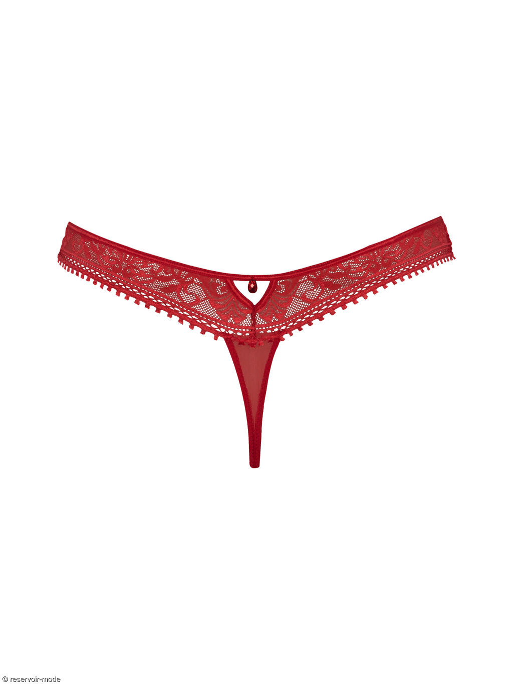 String en dentelle fine à motifs floraux et arabesques, ajustable sur les côtés. La taille basse est ornée dans le dos d'un petit bijou brillant cousu au centre du dos, ajoutant une touche séduisante. Finition des bordures par un fin galon ornemental à picots, ajoutant une touche délicate. Gousset en coton pour un confort intime garanti. Son style audacieux et raffiné capture l'essence même du glamour et de la sophistication. Ce modèle rend hommage aux nuits inoubliables.