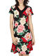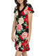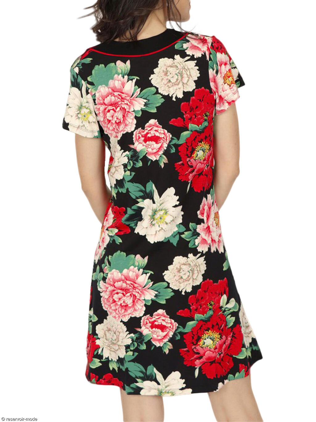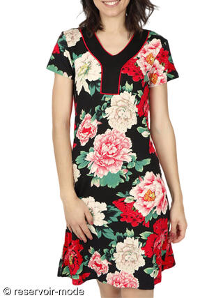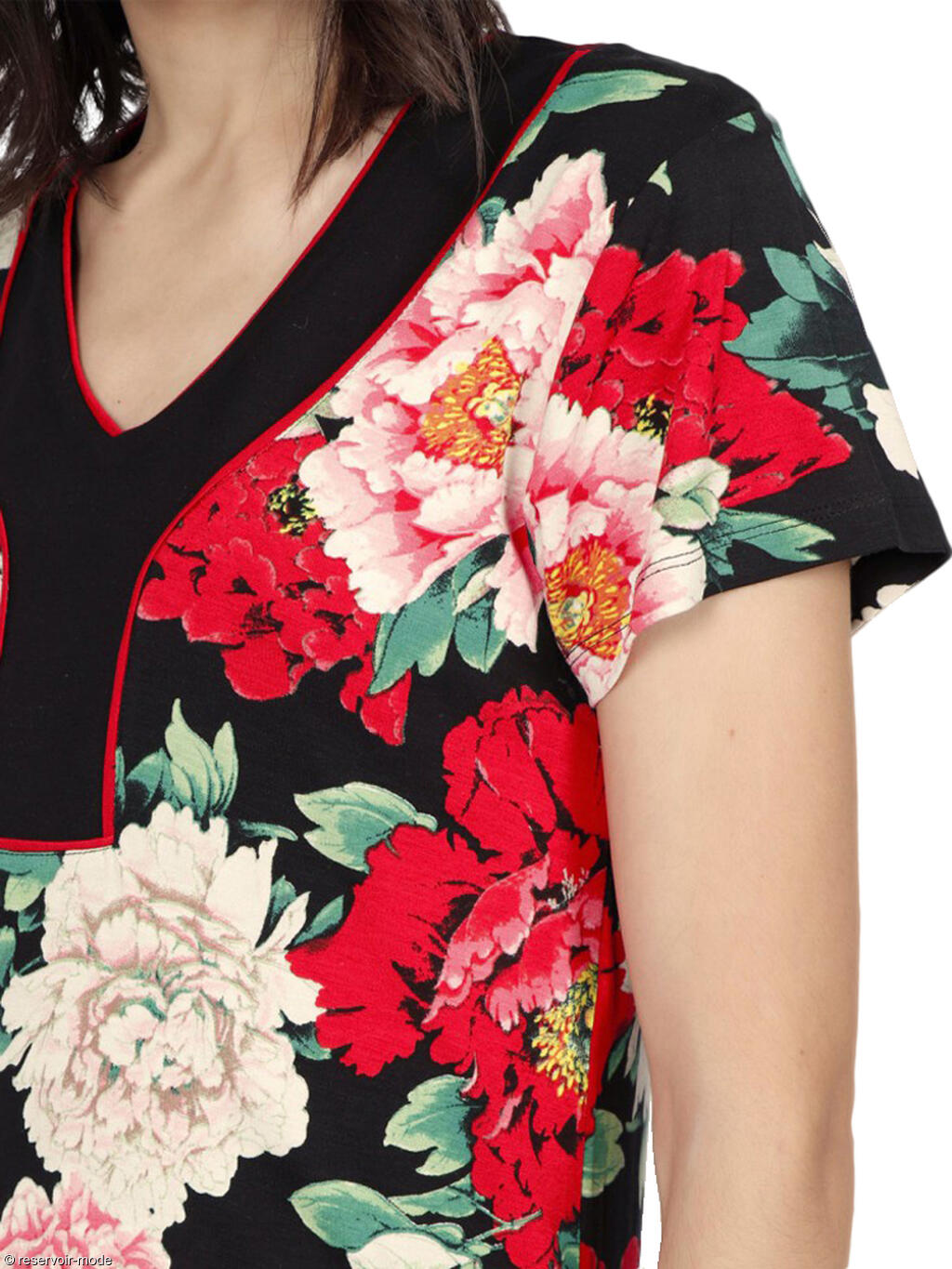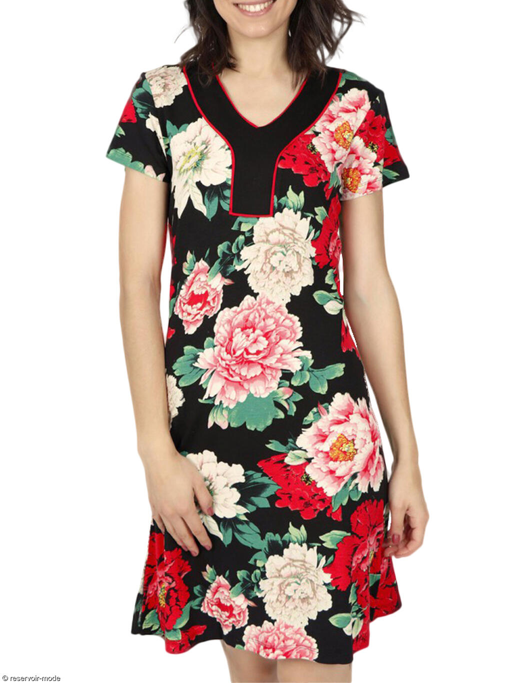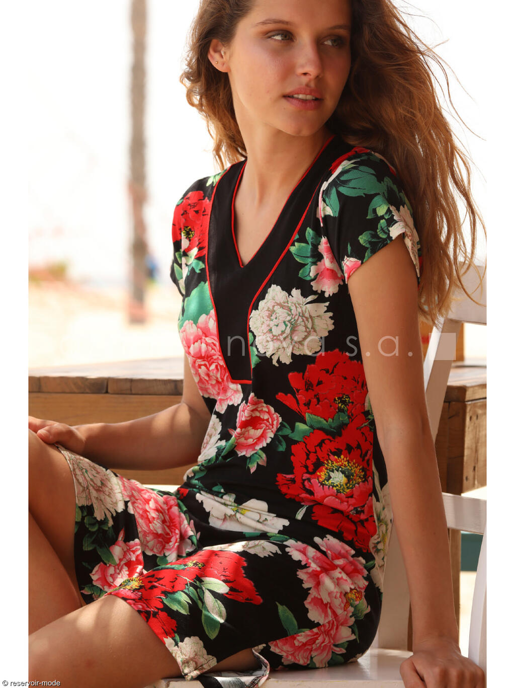 Robe à manches courtes en viscose avec un imprimé floral ultra tendance sur fond noir. Encolure en V soulignée par une bande noire. C'est une robe sophistiquée idéale pour vos sorties en ville ou les soirées d'été. Tissu très doux.