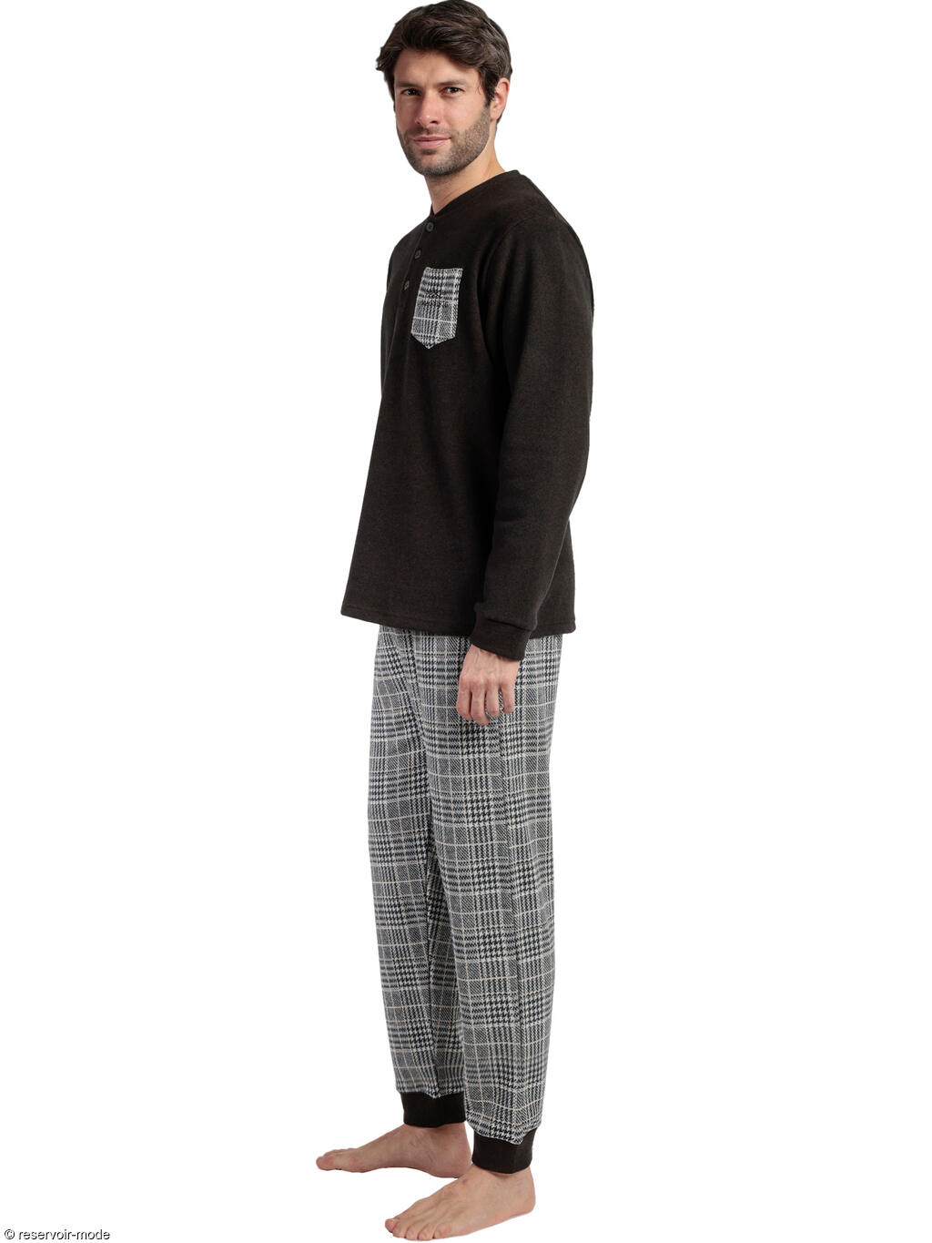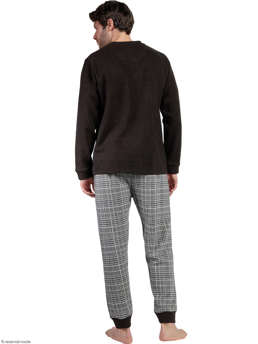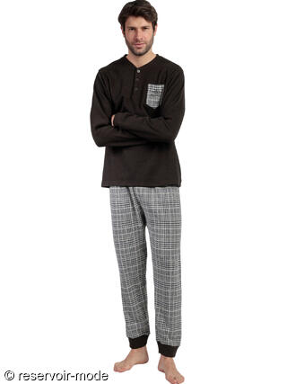 Ce pyjama se distingue par un style classique avec une touche d’élégance grâce à son jeu de motifs et de contrastes. Il est parfait pour rester confortable tout en gardant une allure soignée à la maison. Son tissu en coton mélangé offre chaleur et douceur tout en restant respirant. Le pantalon, de coupe droite, est décoré d'un motif à carreaux façon Prince-de-Galles, classique et intemporel. Il est resserré au niveau des chevilles pour assurer maintien et chaleur par des bords-côtes assortis au haut. Le haut, de couleur unie et de coupe classique à manches longues, a un col rond avec une patte de boutonnage à trois boutons, pratique et élégant. Il est orné d'une petite poche poitrine du même motif que le pantalon avec un détail brodé. Cette poche apporte un contraste élégant et original au haut uni. Cette association originale d’un haut uni et d’un pantalon à carreaux offre un style chic et confortable, parfait pour une tenue de nuit raffinée. Un pyjama à la fois élégant, chaud et pratique, idéal pour les hommes qui aiment le confort sans négliger leur style. Livré dans une boîte-coffret Admas.