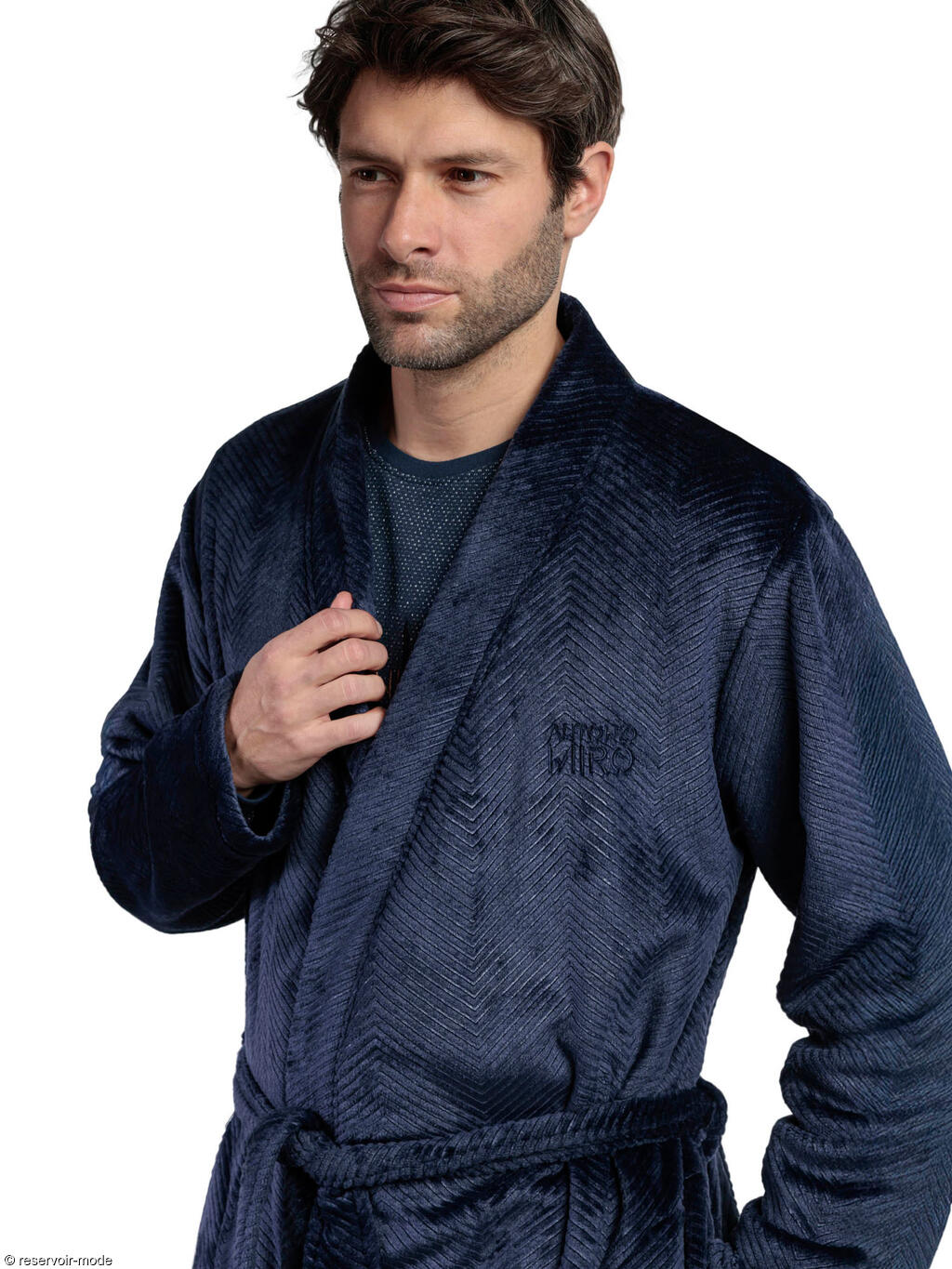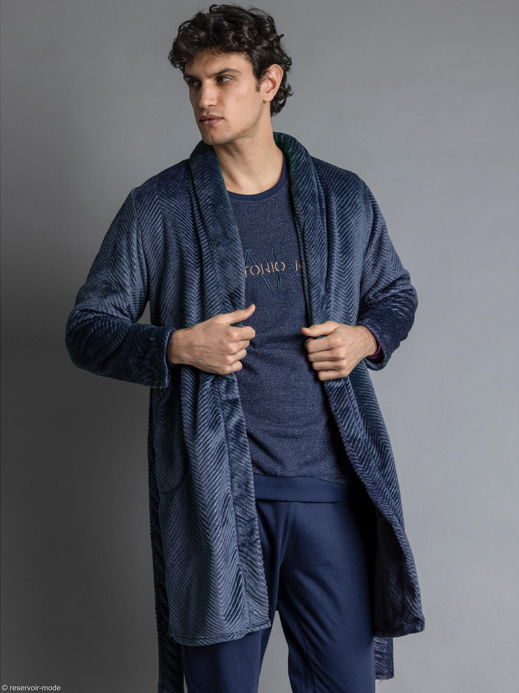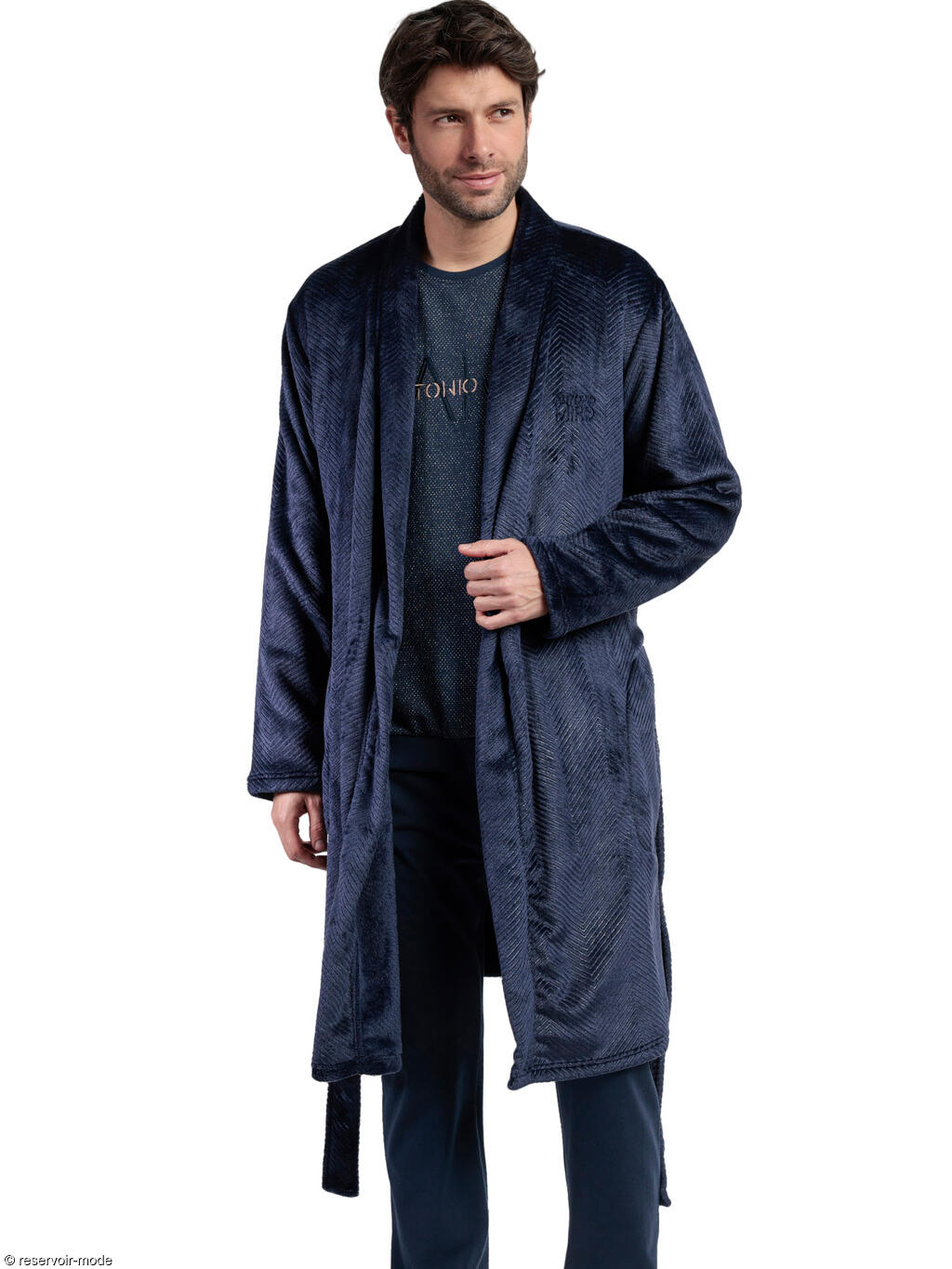 Cette robe de chambre incarne parfaitement le confort et l’élégance décontractée. Elle est conçue dans un tissu en velours ultra-doux, offrant une sensation chaleureuse et luxueuse au toucher. Elle présente un motif discret en chevrons, ce qui lui donne un aspect élégant et texturé. La coupe est droite, légèrement ample pour un confort optimal. Elle a des manches longues et est munie d'une ceinture à nouer à la taille pour ajuster la tenue selon les préférences. Le col est de type châle, apportant une touche classique et confortable. Petit logo discret Antonio Miro brodé sur le buste. Finition légèrement satinée qui capte bien la lumière. Cette robe de chambre vous offrira un look doux luxueux et cosy, idéale pour des moments de détente à la maison. Son style soigné permet même de la porter par-dessus un pyjama quand on reçoit à la maison, sans perdre en élégance. Livrée dans une boîte-coffret Admas collection Antonio Miro.