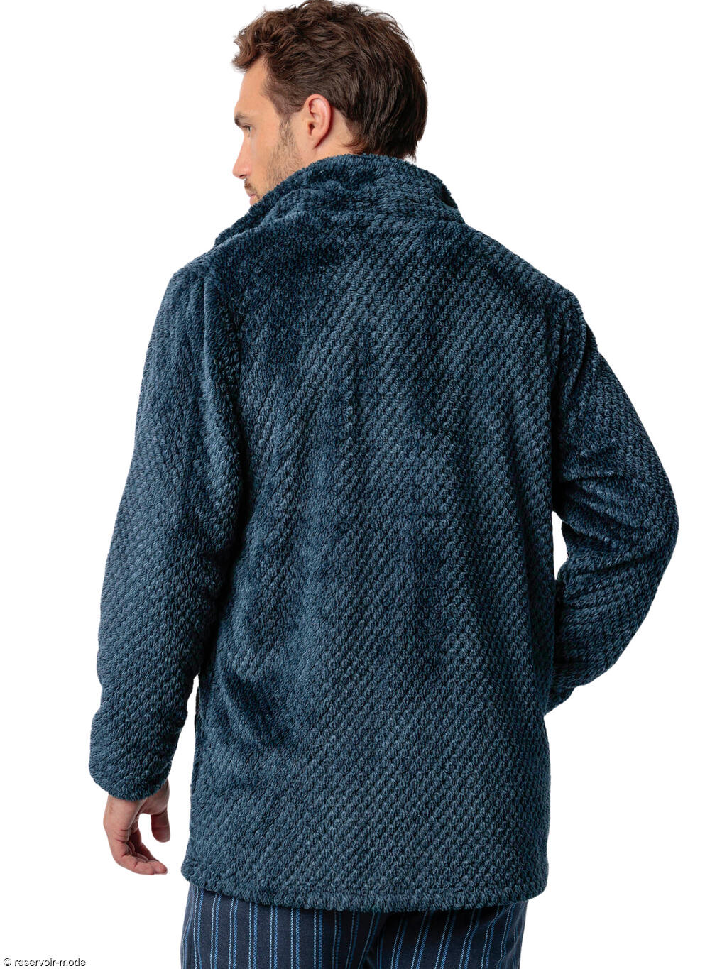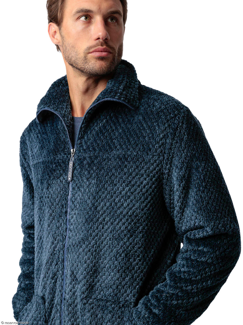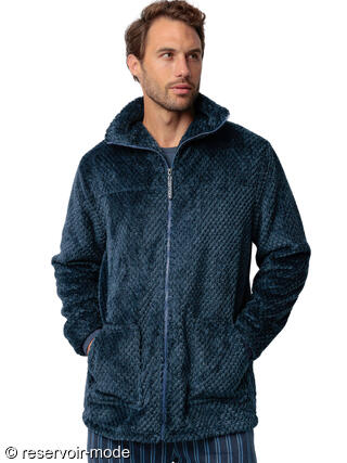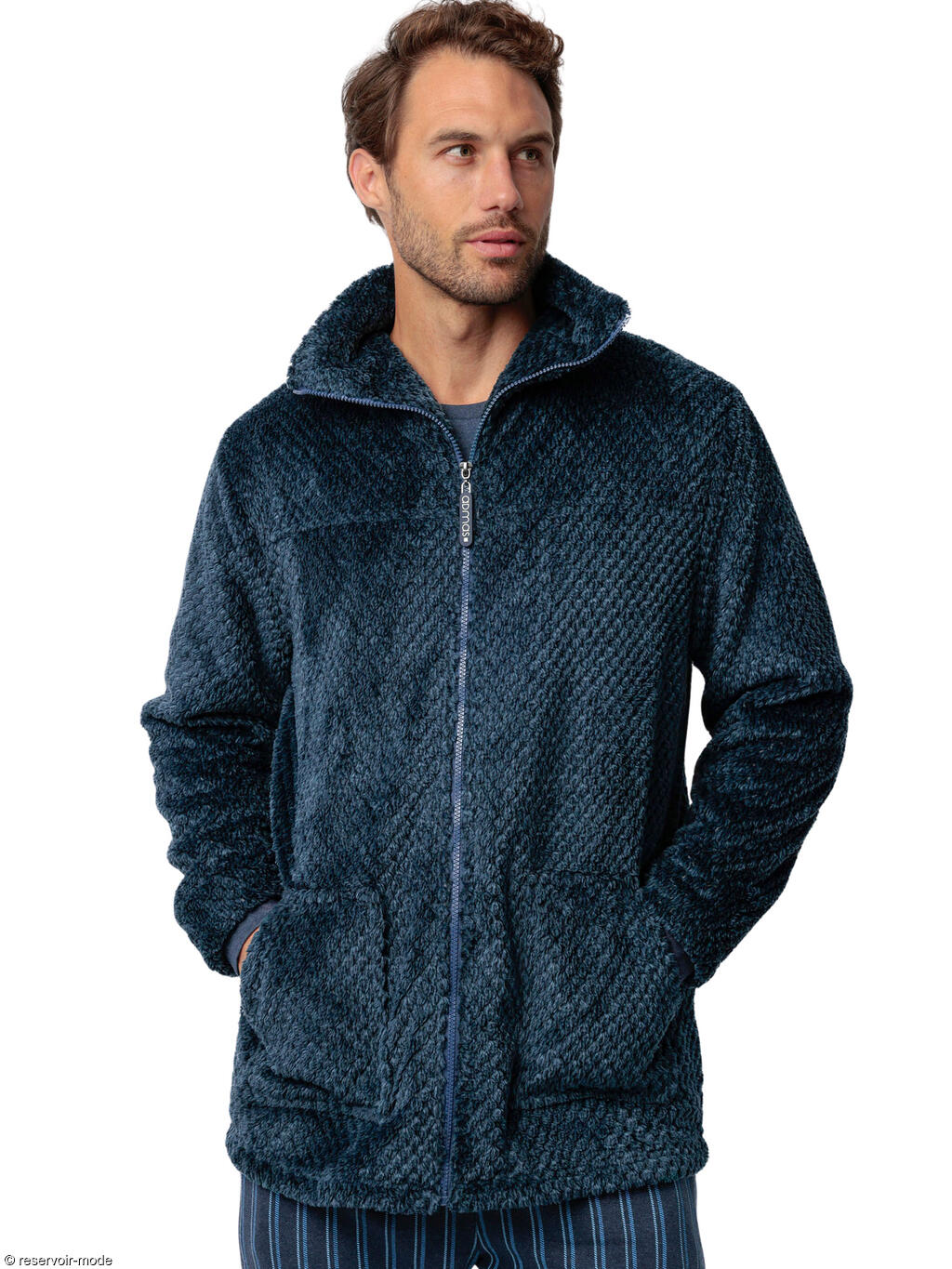 Veste d'intérieur chaude, douce et confortable, idéale pour l’hiver ou les moments de détente à la maison. Son tissu polaire Corel texturé est très doux au toucher et moelleux. Elle se ferme sur l'avant grâce à une fermeture éclair, pratique pour ajuster la chaleur ou l’enfiler rapidement. Deux grandes poches sont plaquées à l’avant pour réchauffer les mains ou ranger de petits objets. Col montant bien couvrant, parfait pour se protéger du froid sans écharpe. Manches longues avec une finition simple. Ultra douce et très agréable à porter, son design sobre et élégant la rend facile à assortir avec un pyjama ou un pantalon d’intérieur. Elle sera parfaite à porter comme veste d’intérieur ou surveste cocooning pour les journées froides. Idéale pour les hommes qui cherchent à rester bien au chaud tout en gardant un style moderne et raffiné, sans sacrifier le confort. Livrée dans une boîte-coffret Admas.