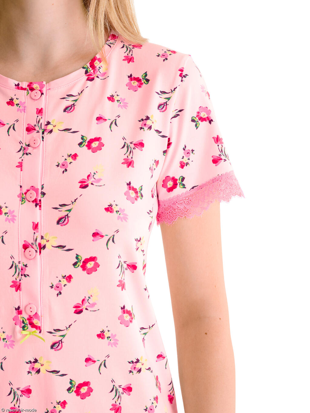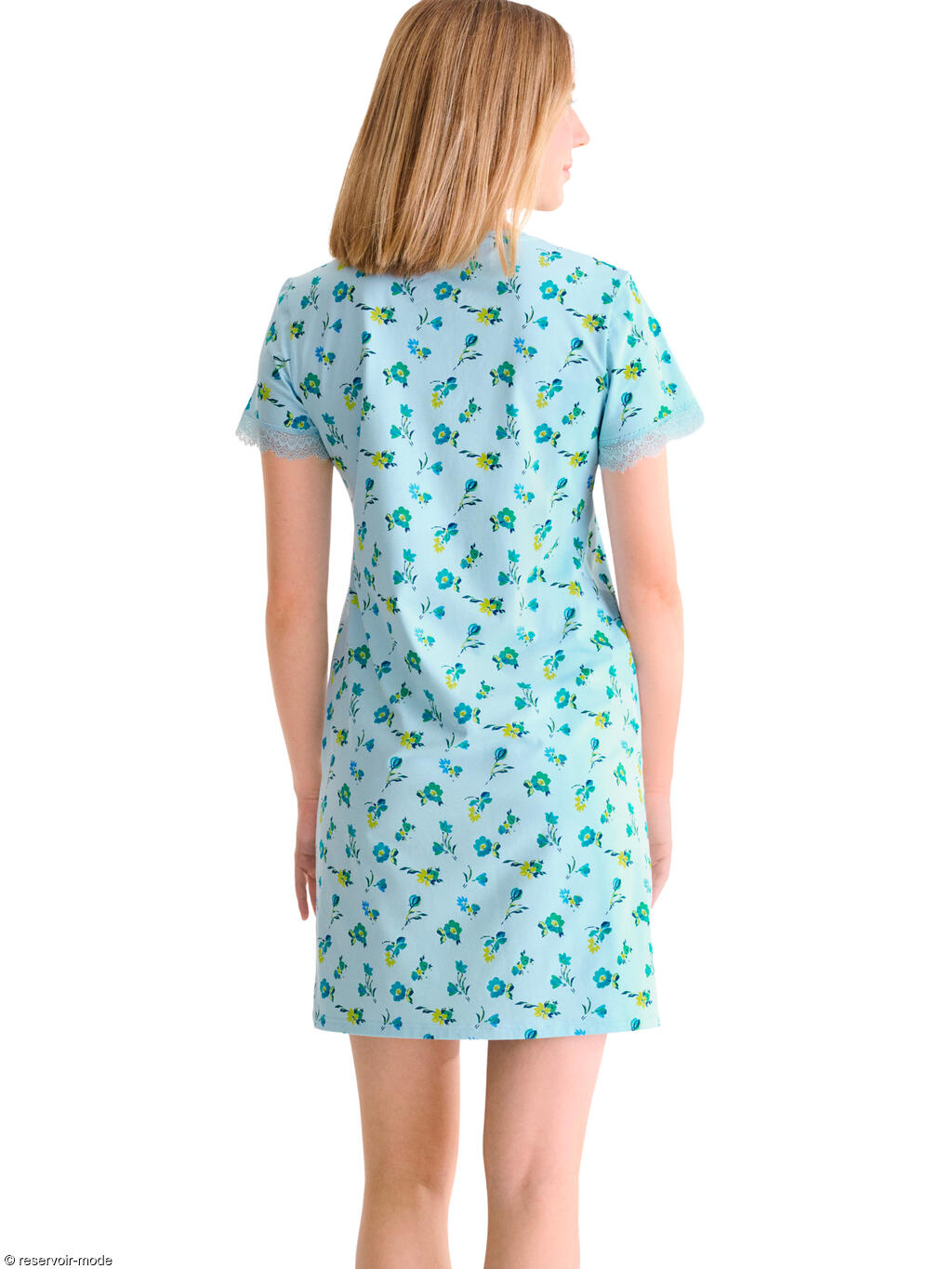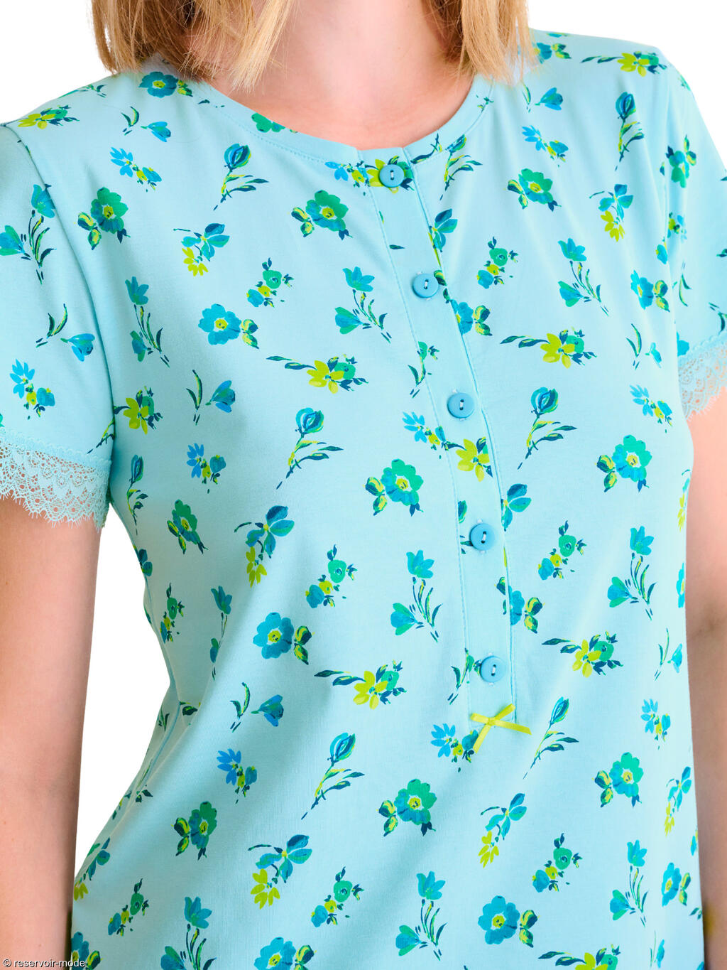 Chemise de nuit à manches courtes dans un tissu en coton confortable à imprimé floral subtil qui ajoute une touche féminine et délicate. Les manches sont ornées d'une fine dentelle élastiquée. Patte fonctionnelle à cinq boutons sur le devant, qui lui permet de convenir également aux mères qui allaitent. Elle se termine par un petit noeud en ruban contrasté aux couleurs vives. Longueur environ 90 cm.