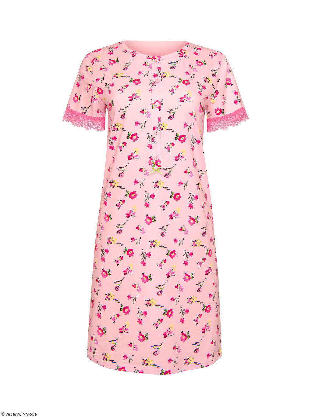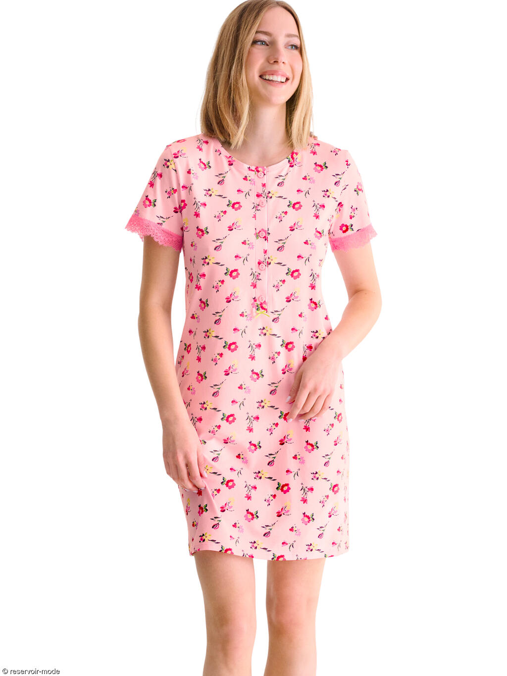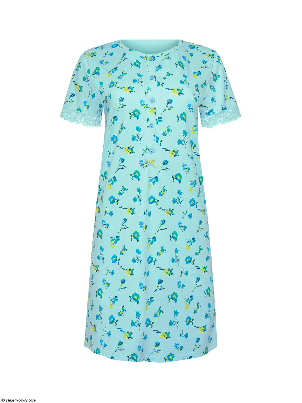 Chemise de nuit à manches courtes dans un tissu en coton confortable à imprimé floral subtil qui ajoute une touche féminine et délicate. Les manches sont ornées d'une fine dentelle élastiquée. Patte fonctionnelle à cinq boutons sur le devant, qui lui permet de convenir également aux mères qui allaitent. Elle se termine par un petit noeud en ruban contrasté aux couleurs vives. Longueur environ 90 cm.